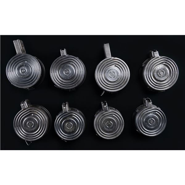 Lot consists of 8 Chinese AK & AR pattern drum mags., including: 1) x3 (approx.) 75-rd.7.62x39mm AK drum mags. Rear of 2 mags. is marked with Factory 36's "36" within a triangle insignia, with 1 marked with Factory 9396's "9396" code. Steel construction with blue finish. 2) x3 (approx.) 100-rd. 7.62x39mm AK pattern drum mags. Mags. are unmarked, with 1 mag. retaining a partially legible sticker that reads "MADE IN CHINA BY NORINCO". Steel construction with blue finish. 3) x2 (approx.) 100-rd. 5.56x45mm NATO drum mags. Rear of mags. is stamped with Factory 36's "36" within a triangle insignia. Steel construction with blue finish. CONDITION: drum mags. are all very good, showing some light wear and superficial marks from handling and storage. (02-24536-4/MLW). $800-1,200.