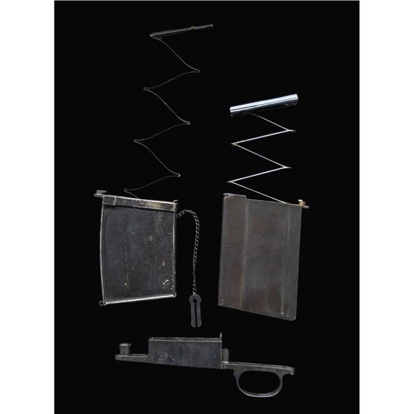 NATIONAL BLANK BOOK CO. SPRINGFIELD 1903 MAGAZINE. 1) German WWI Gewehr 98 25-rd. extended mag. Right side of mag. body is stamped with maker's mark "W/ Co/ DRP", with mag. otherwise being devoid of any proofing. Steel construction with black enamel type finish. Follower is unmarked. Complete with later production Mauser Eagle/WaA63 proofed trigger guard assembly. CONDITION: mags. retains the majority of its original black enamel type finish, showing scattered spots of wear, flaking, and handling marks that show through to gray patina. Trigger guard retains the majority of its reapplied black enamel finish, showing spots of pitting beneath the finish. 2) Possibly reproduction 25-rd. mag. extension mfg. for the Springfield Model 1903 rifle by National Blank Book Co. Left side of the mag. body is stamped with an eagle head over "X31" on the bottom left corner, with an eagle head over "X32" marked in the bottom right corner. Steel construction with dull blue finish. Complete with follower. CONDITION: very good, with some light edge wear and scattered superficial handling marks. (02-24536-13/MLW) NON-GUN. $600-1,000.
