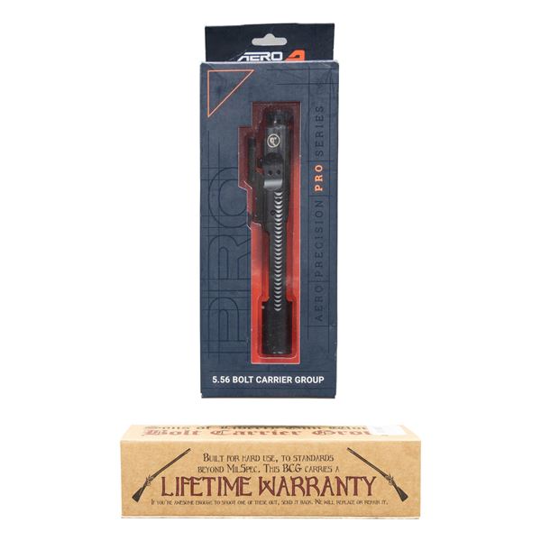 PLUS 2 BCG'S. All items are new in original packages. Troy complete upper with Troy flip up sights on its full Picatinny rail. Fluted 12.5" barrel with flash hider. Part number SUPG-3AC-12BT-23. / Sons of Liberty Gun Works hard chromed BCG. / Aero Precision Pro Series black BCG. (02-25186-1/NW). $650-900.