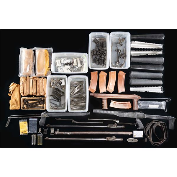 MAGAZINES. 10 AK-74 5.45mm brown synthetic 30 round mags., some in original wrappers. Made in East Germany. 8 BAR 20 round mags. in unmarked sealed original wrappers. 38 Lee Enfield 303 British 5 round stripper clips. 59 SKS 10 round stripper clips. 4 U.S. Model 1917 replacement bolts. 3 are marked "R", 1 is marked "W". Black arsenal rework finish. Bolts are equipped only w/ extractor collars. 4 pairs (R&L) M16A1 plastic handguards. 1 German Model 88 commission rifle barrel jacket in well-worn condition. Two German GEW 98 rifle barrels w/ Lange rear sights. Bores have steel plugs. 1 walnut M1 Carbine stock w/ sliding wire buttstock & vertical hand grips. Black synthetic Ramline side folder for M1 Carbine. Black synthetic Advanced Technology M1 Carbine sliding wire buttstock. 1 M1 Carbine perforated metal handguards. 2 M1 Garand modified Tanker op rods. Miscellaneous gun parts include, but not limited to, Sten gun metal hand grip & back plate. 2 Swedish Mauser brown leather slings, well worn. 2 Swedish Mauser oilers. U.S. Krag parts include 3 Model 1902 rifle sights, one Model 1898 rifle sight. 4 magazine cutoffs. 1 extractor. 5 firing pin tips. U.S. M1 Garand. Includes gas cylinder, front sights, follower arm, bullet guide & clip latch. Model 1911 pistol. 1 Ed Brown match grade extractor. CONDITION: except as noted, parts will be worn, but serviceable. Many will have considerable loss of finish. (02-24590-51/RW). NON-GUN. $500-800.