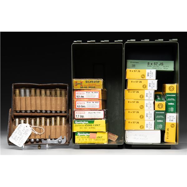 This lot consists of the following ammo: 1) 20 rds. of varied vintage 45-70 in a McKeever cartridge box with Trapdoor wrench. 2) About 190 rds. of varied S&B 8x57 JS ammo. 3) 40 rds. of Remington 30-40 Krag SP in varied boxes. 4) 18 rds. of Super X 30-40 Krag 180 gr. Silver Tip. 5) 20 rd. box of Remington 6.5x55 Swede 140 gr. Core Lokt. 6) 20 rd. box of older Norma 6.5 Carcano 139 gr. Semi Point BT. 7) 20 rd. box of older Norma 6.5 Jap 156 gr. SP. 8)20 rd. box of Norma 7.7 Jap 180 gr. SP. Ammo is housed in two aftermarket 50 Cal. ammo cans. CONDITION: boxes show varying degrees of wear. Some ammo shows oxidation & tarnishing but balance is very good or better. (02-24542-14/MJC). AMMO. $200-300 for lot.