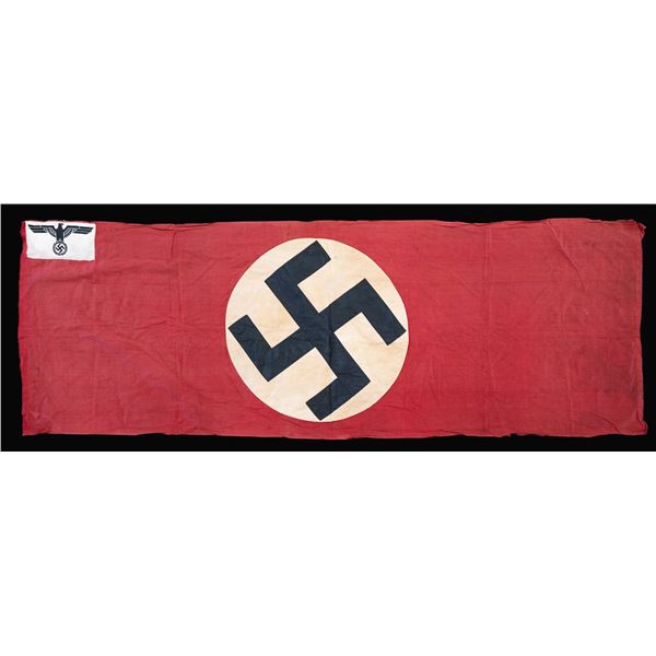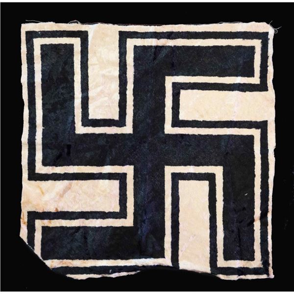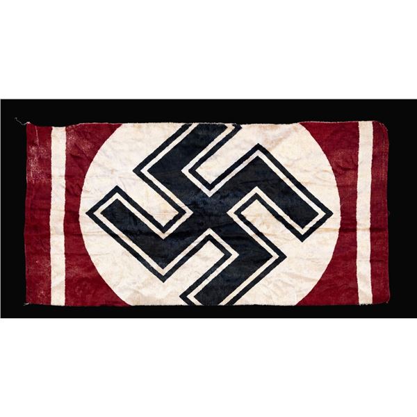 This lot includes a WWII Party banner measuring 85" x 31". The banner has 2 Wehrmacht sport shirt eagles sewn to one corner. The lot further include 2 interesting torn fragments of Party tapestries. One measures about 41' x 20' and has a Party symbol with a red field, and the other measures about 19 1/2" x 20" and shows only a Party symbol. CONDITION: banner shows moderate wear and the tapestry fragments are solid. (02-24445-3/BF). $200-400.