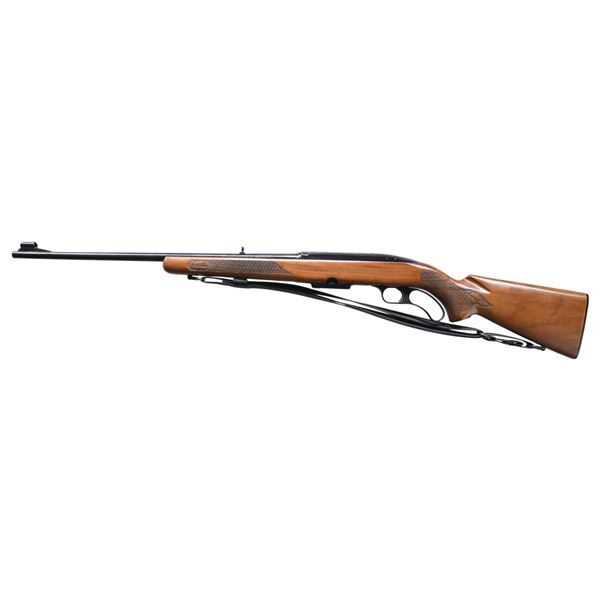 Cal. 308 Win. S# H261013. Bbl. 21 3/4". Model 88 lever action rifle mfg. by Winchester in 1971. Left side of the bbl. exhibits standard markings denoting Winchester's mfg. information, as well as the model and cal. designations. Metal components exhibit a blue finish overall, save for on the bolt, which is polished in-the-white. 1-piece pistol grip wood stock exhibits acorn and oak leaf woven panels at the wrist and forearm, with a checkered black synthetic buttplate. Ramped and hooded aluminum beaded blade front sight with flip-up U-notch rear sight. Receiver is factory drilled and tapped with plug screws. Unmarked black nylon sling. MAGS: 1 4-rd. CONDITION: metal components retain the vast majority of their original factory blue finish, exhibiting some superficial handling marks overall. Mirror bore, exhibiting some hardened grease, while retaining well defined rifling throughout. Proper manual mechanics. Stock shows scattered marks and scratches, but otherwise remains sound. (25-3749/MLW). CURIO. $350-550.