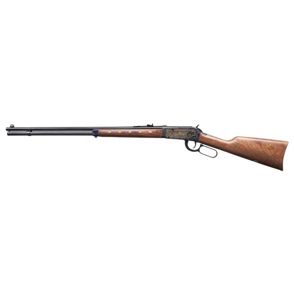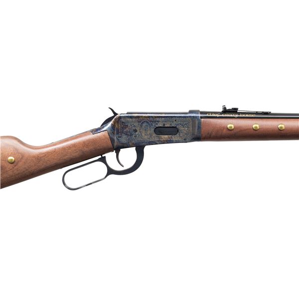 LEVER ACTION RIFLE. Cal. 38-55. S# CCH9585. Bbl. 24" tapered. Hold bead front sight. Adjustable sporting style rear sight. 1983 made rifle commemorating Sioux Chief Crazy Horse. This commemorative is listed as C&R eligible on BATF list. Engraved case colored receiver with Crazy Horse portrait & various scenes. Upper tang & nosecap are also case colored. Right rear of bbl. has "Chief Crazy Horse" in gold filled letters. Balance of other parts are blued. Walnut stock set with Crazy Horse medallion on right side of butt & brass tack ornamentation. UNATTACHED ACCESSORIES: matching numbered factory box with sleeve, manual & paperwork. CONDITION: all aspects near excellent with factory hang tang on trigger guard. (24-3551/MJC). CURIO. $500-800.