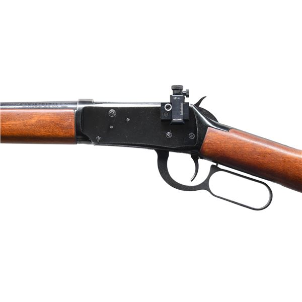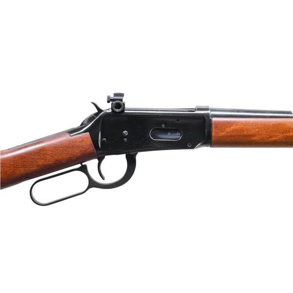 Cal. 30-30. S# 3088248. Bbl. 20". Model 94 lever action carbine mfg. by Winchester in 1967. Left side of the bbl. exhibits standard markings denoting the model and cal. designations. Receiver exhibits a nearly black blue finish, with remaining metal components exhibiting a standard blue finish. Band fastened wood forearm and straight grip stock with flat impressed steel buttplate. Ramped brass beaded blade front sight with modern Williams adj. aperture rear sight. Rear sight dovetail is empty. CONDITION: metal components retain the majority of their blue finish, exhibiting light to mild edge wear and scattered superficial handling marks (both primarily on the receiver), with some scattered spots of light surface oxidation. Mirror bore, retaining well defined rifling throughout. Proper manual mechanics. Wood furniture shows a few superficial marks from handling and storage, with the underside of the forearm exhibiting a 2 7/8" crack that stems from the receiver. (25-4010/MLW). CURIO. $350-550.