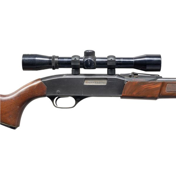 Cal. 22 S, L, LR. NSN. Bbl. 20 1/4". Model 270 slide action rifle mfg. by Winchester. Left side of the bbl. is marked with the Winchester trademark logo and cal. designation. Left side of rear sight assembly is marked "MODEL" followed by a boxed "270". Alloy receiver, steel bbl., and steel mag. tube exhibit a blue finish. Alloy front sight block and trigger housing exhibit a black enamel type finish. Checkered mottled brown synthetic pump and plain wood pistol grip stock with grooved black synthetic Winchester buttplate. Grooved receiver is fitted with a Simmons Model #1006 4x32 scope. CONDITION: metal components retain good amounts of their original factory finish, showing areas of wear and thinning fading to gray patina and scattered superficial handling marks overall. Bbl. shows scattered spots of mild pitting and dark surface oxidation. Very bright bore, retaining strong rifling throughout. Proper manual mechanics. Synthetic forearm shows scattered scratches and superficial marks. Buttstock exhibits scattered scratches, marks, and impressions, with scattered mildew spots. (25-4800/MLW). CURIO. $100-300.