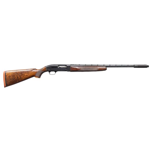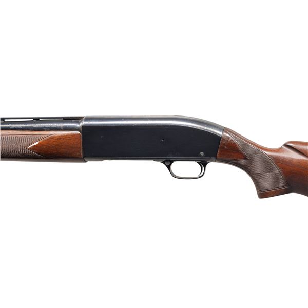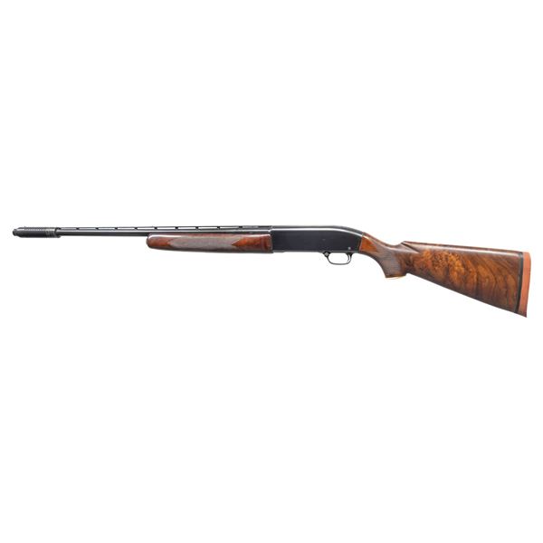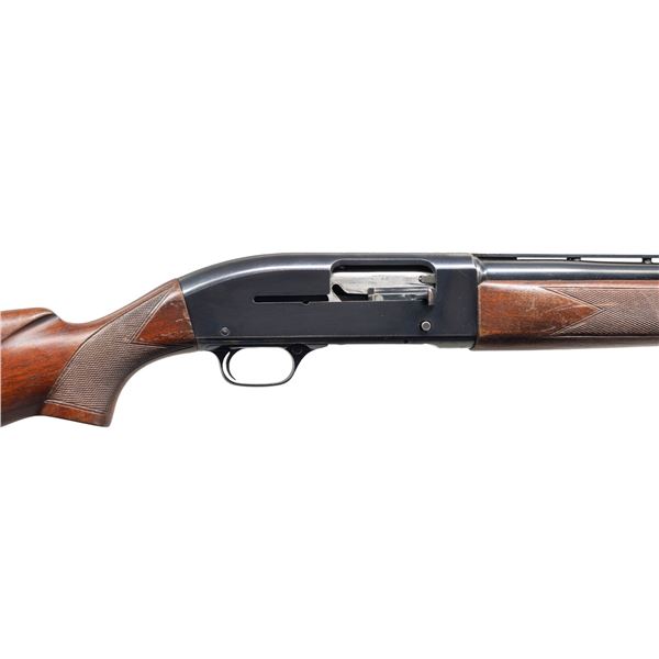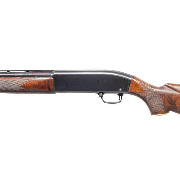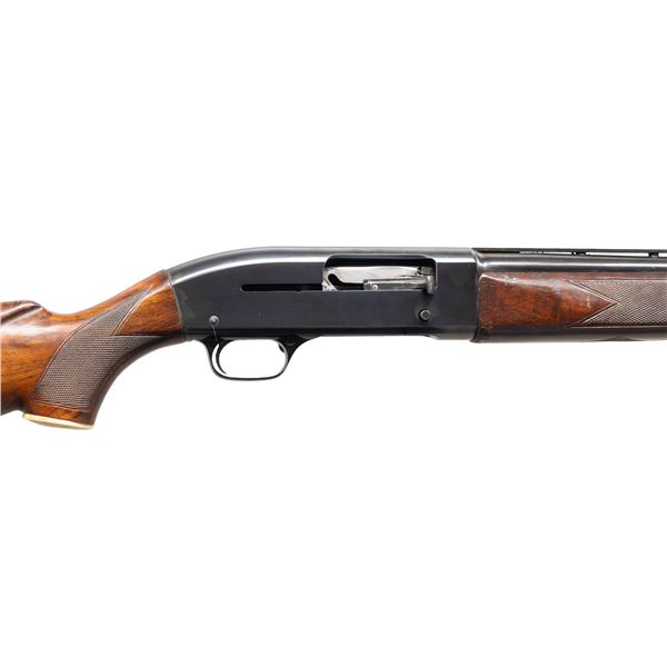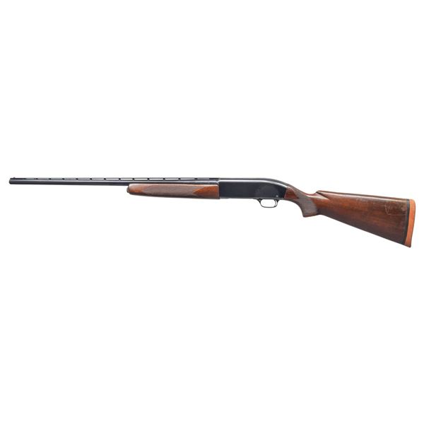 1) Cal. 20 Ga., 2 3/4". S# 151770. Bbl. 23" (26 7/8" with Cutts Compensator). Model 50 semi-automatic shotgun mfg. by Winchester in 1960. Left side of the bbl. exhibits standard factory markings denoting the model and cal. designations above a "WS-1" choke marking. Metal components exhibit a blue finish overall, with the bolt being polished in-the-white, and the alloy trigger housing exhibiting a black anodized finish. High gloss checkered wood forearm and replacement fancy walnut natural white capped pistol grip buttstock with Winchester red rubber recoil pad. Bbl. features a grooved matte V/R that terminates in a Lyman Cutts compensator, with an aluminum front and mid bead. Safety button is locked in the firing position via a circular stopper. CONDITION: metal components retain the majority of their original factory blue finish, showing some light edge wear, scattered light scratches and superficial handling marks, as well as a couple of spots of light to mild surface oxidation on the top of the receiver. Mirror bore, exhibiting some scratching towards the muzzle. Proper manual mechanics. Forearm shows scratches, marks and impressions from handling and storage, with cracking and flaking to its varnish. Buttstock shows some superficial marks and scratches, as well as some mildew spots, with a couple of small chips on the left side at the recoil pad. (25-4484/MLW). 2) Cal. 12 GA, 2 3/4". S# 106384. Bbl. 30". Model 50 semi-automatic shotgun mfg. by Winchester in 1958. Left side of the bbl. exhibits standard factory markings denoting the model and cal. designations above a "FULL" choke marking. Metal components exhibit a blue finish overall, save for on the bolt and carrier which are polished in-the-white, as well as the alloy trigger housing which exhibits a black anodized finish. Checkered wood forearm and pistol grip stock with Winchester red rubber recoil pad. Matte V/R with red synthetic bead front sight. Mid bead is absent. UNATTACHED ACCESSORIES: spare bbl. fitted with a deluxe Poly Choke. CONDITION: metal components retain the majority of their original factory blue finish, exhibiting some light to mild edge wear, scattered superficial handling marks and scratches, as well as some scattered spots of light surface oxidation and pitting. Proper manual mechanics. Wood furniture shows scattered scratches, marks, and impressions from handling and storage, but otherwise remains sound. Spare bbl. retains a mirror bore, with a few small spots of light oxidation/pitting. (25-4492/MLW). ALL CURIO. $650-1,000.