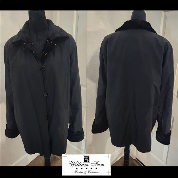 DONATION: This is a beautiful black-and-gold spotted sheared mink stroller, reversible to a Taffeta raincoat. Perfect for traveling.
