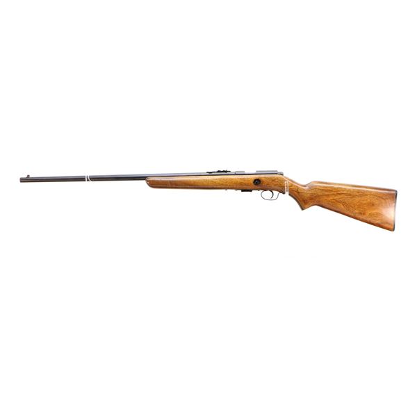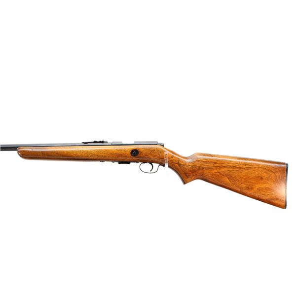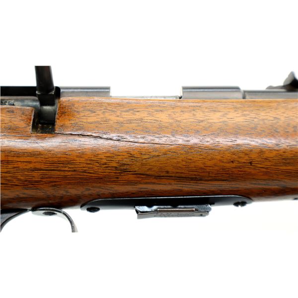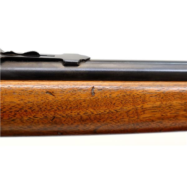 Main Description: Blade front sight, adjustable u notched rear sight, metal has been reblued. One piece refinished wood stock, forend tip is cracked, pistol grip, checkered black polymer butt plate.