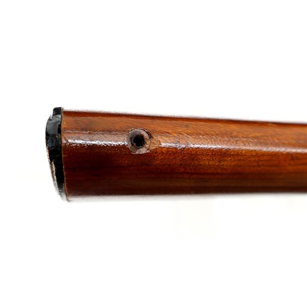 Main Description: Brass bead, black carbon fiber wrapped barrel, engraved receiver, silver alloy trigger guard. Two piece wood stocks, forend tip is cracked, checkered forearm, pistol grip and black polymer butt plate, 13" LOP, hole in toe of stock.
