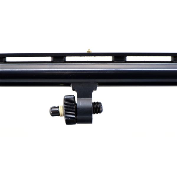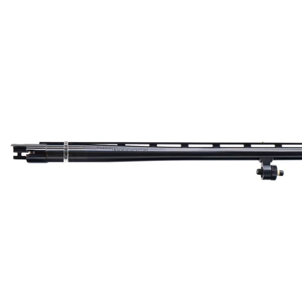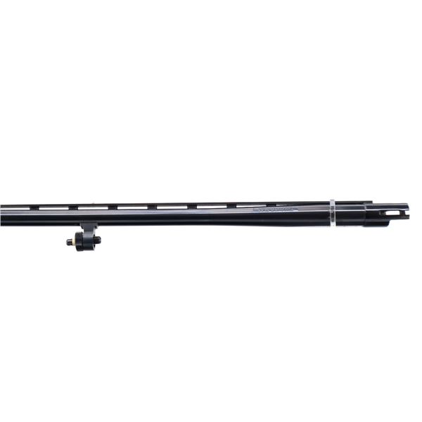 Main Description: Brass bead, blued round barrel, black alloy receiver. Two piece synthetic stocks, grooved forearm, checkered pistol grip, black vented rubber recoil pad, 14.25" LOP, grip cap, swivel studs. Spare Barrel: 12 G X 3", 28", Excellent Bore, Removable Mod Choke, White front and brass mid rib beads, blued finish, vent rib, swivel stud.