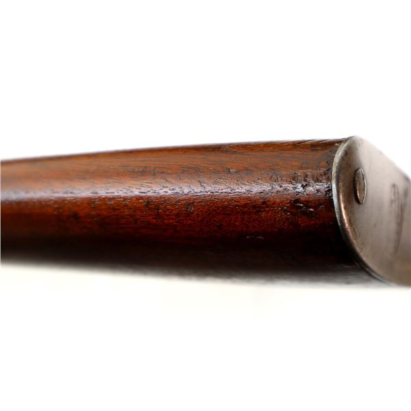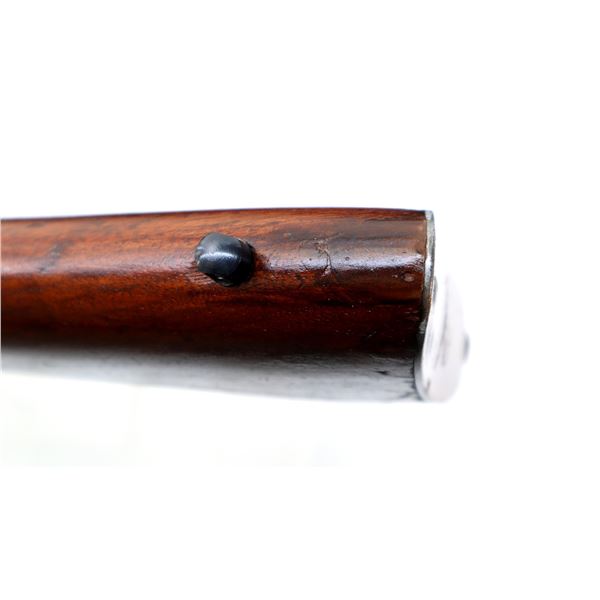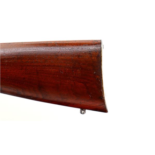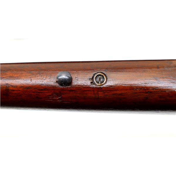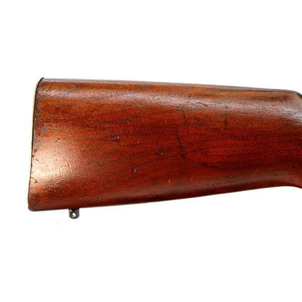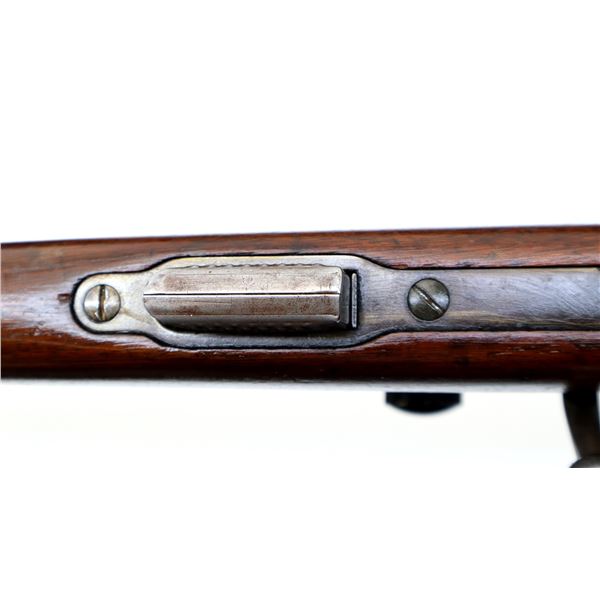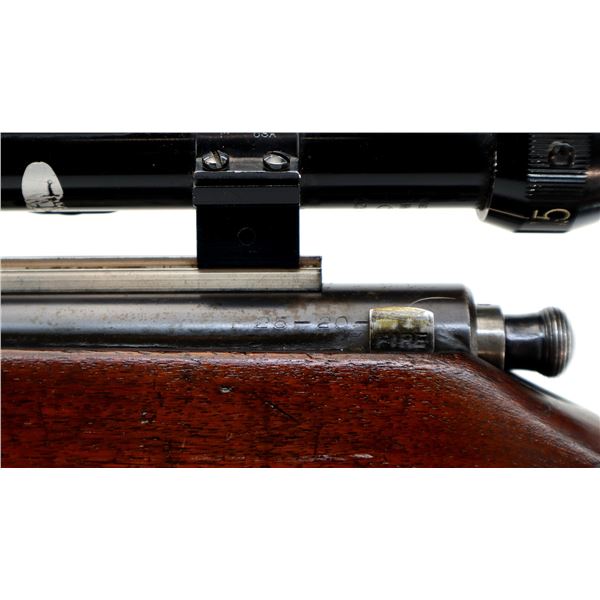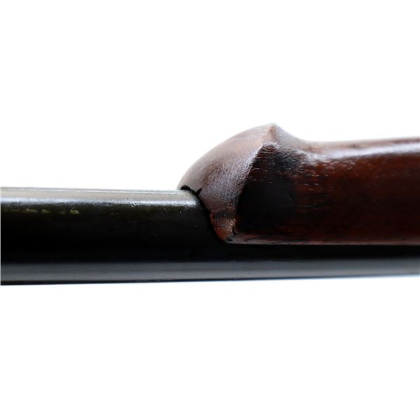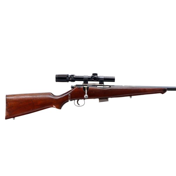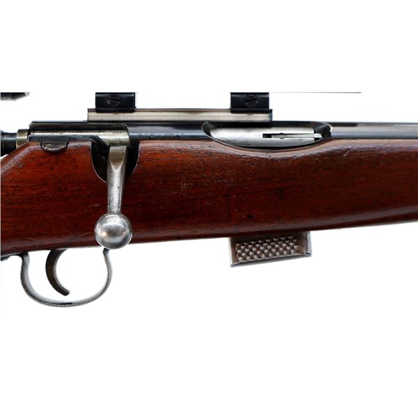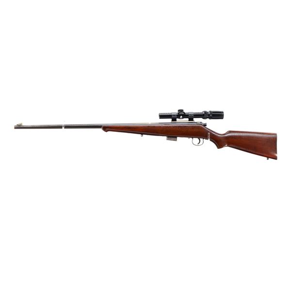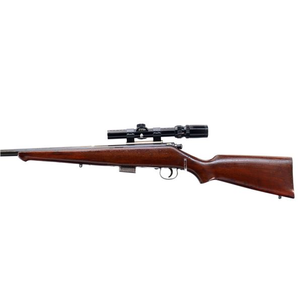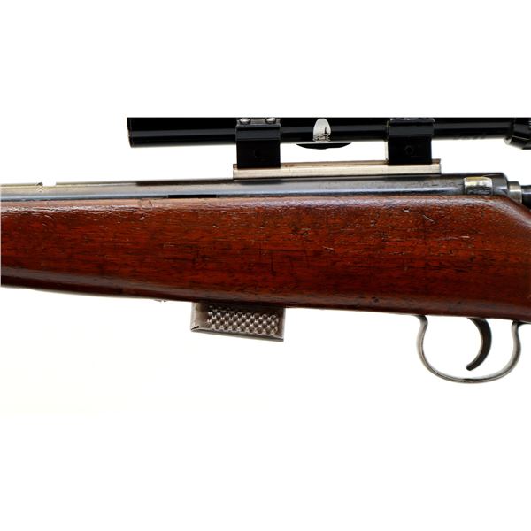 Main Description: Blade front sight, missing rear sight dovetail present, blued finish, receiver drilled and tapped with Bushnell Banner 1.5-4 scope installed, clear optics with duplex crosshair, note: magnification ring is not smooth has some clicks when turning. One piece wood stock, Schnabel forend tip, pistol grip, smooth steel butt plate, stock repaired at toe, swivel studs, rear one has a chip around it.