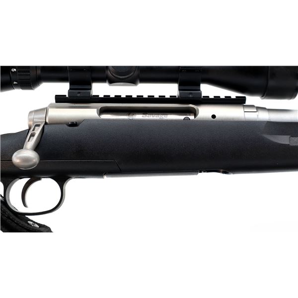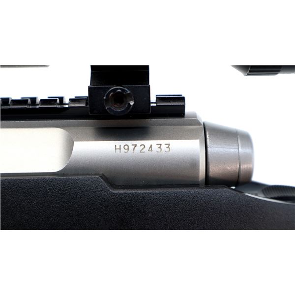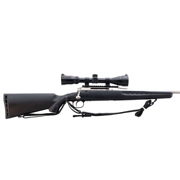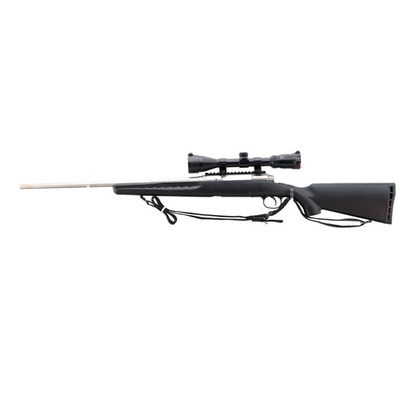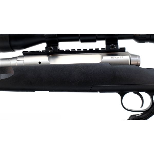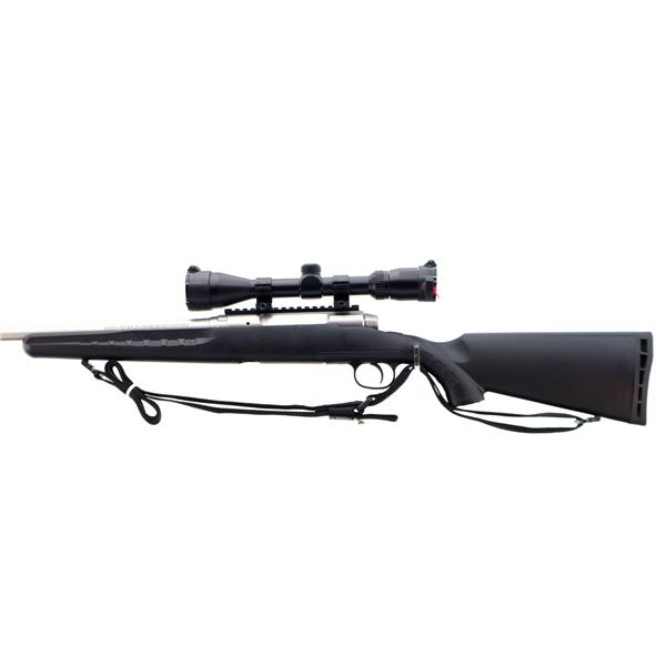 Main Description: No sights, stainless finish, receiver drilled and tapped with Bushnell Trophy XLT 3-9 x 40 scope installed, clear optics with duplex crosshair. Smooth Bolt knob. One piece black synthetic stock, textured forearm and pistol grip panels, black vented rubber recoil pad, grip cap, tang safety, non accu trigger, sling swivels with black nylon sling.
