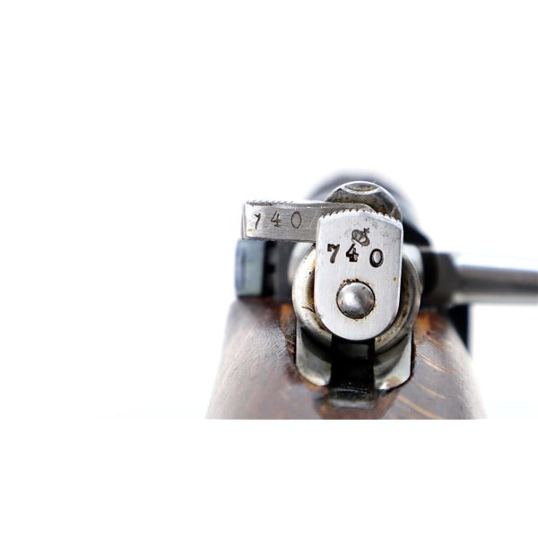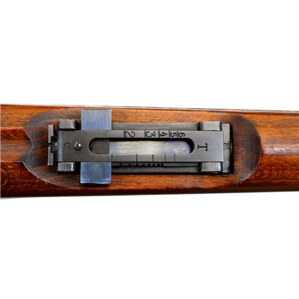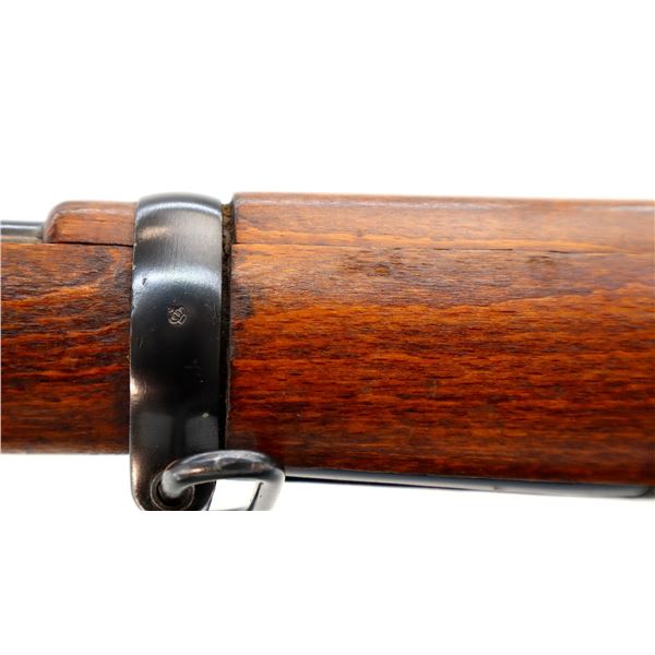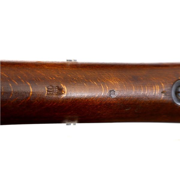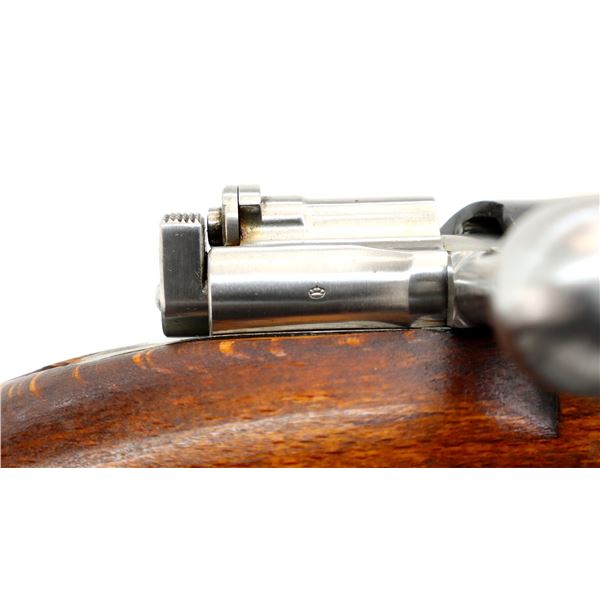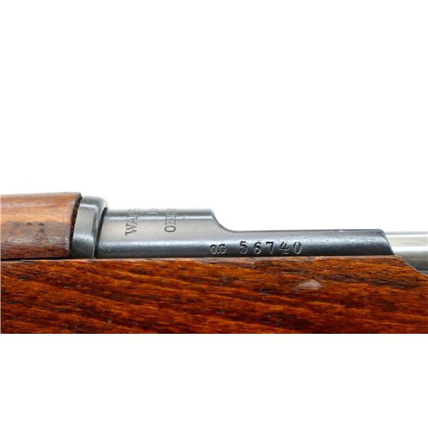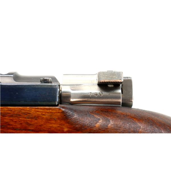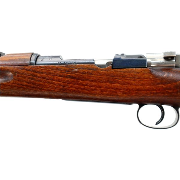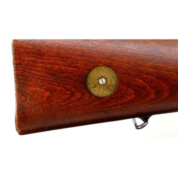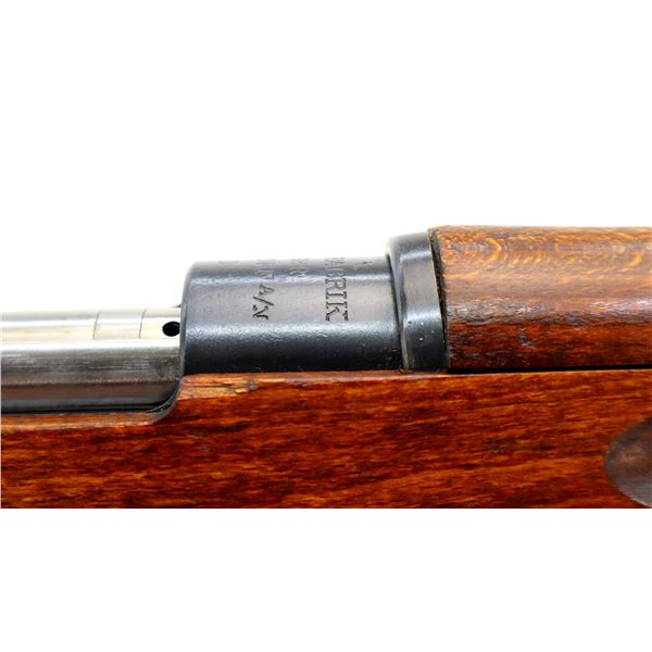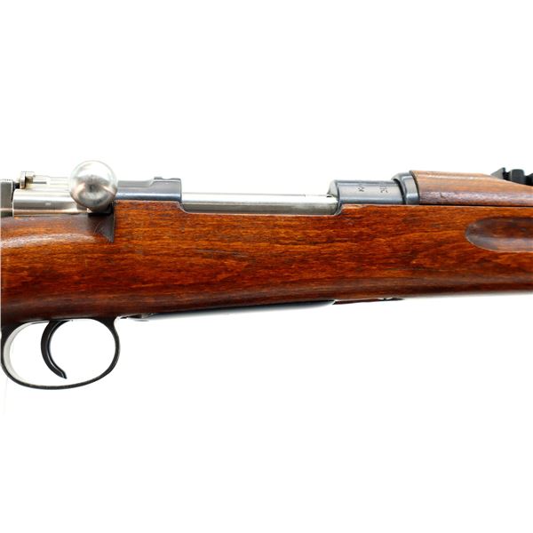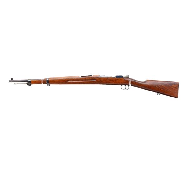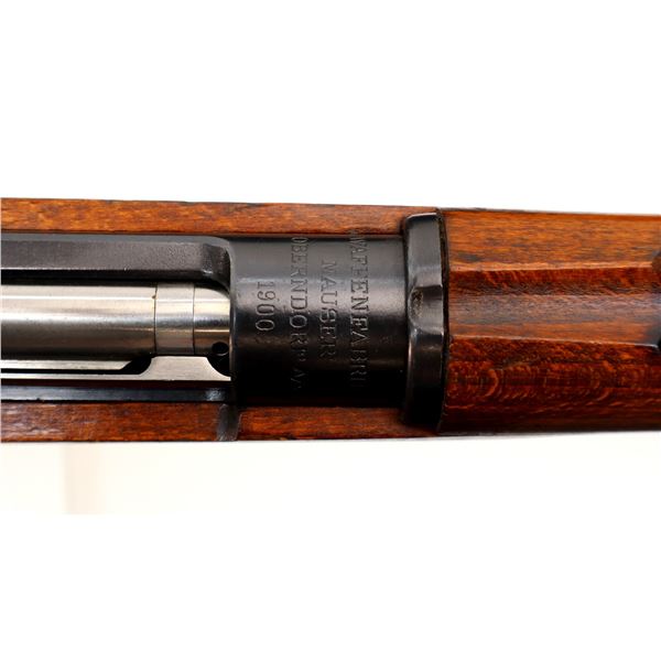 Main Description: Manufactured by Mauser Oberndorf 1900, visible numbers match. Blade front sight with ramp, adjustable u notched rear sight, blued finish, silver bolt with straight handle. Two piece full military wood stocks, finger grooved forearm, straight grip, smooth steel butt plate, brass stock disk on right side, sling swivels, bayonet lug, cleaning rod.