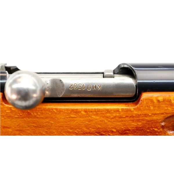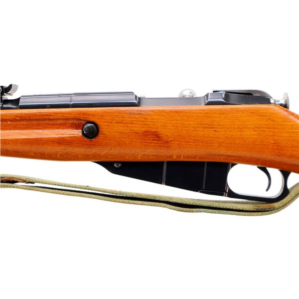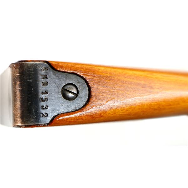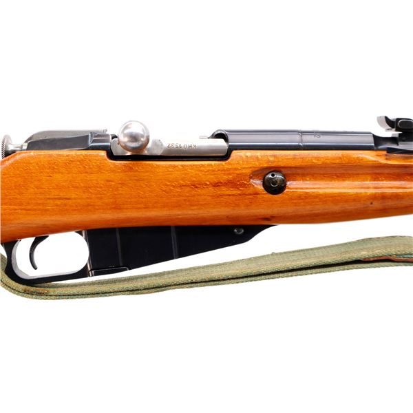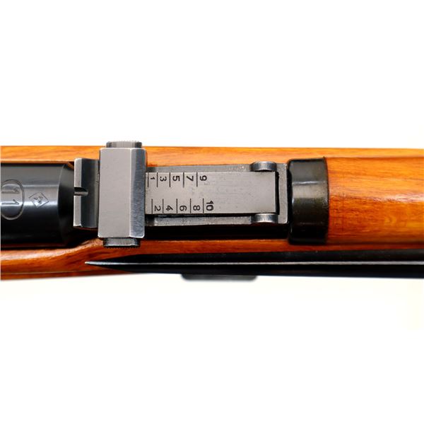 Main Description: Manufactured by Factory 11, 1954, visible serial numbers match. Post front sight with hood and ramp, adjustable u notched rear sight, blued finish, round receiver, silver bolt with straight handle. Two piece full military wood stocks, finger grooved forearm, straight grip, smooth steel butt plate, sling slots with leather and green canvas military sling, cleaning rod and attached folding cruciform bayonet.
