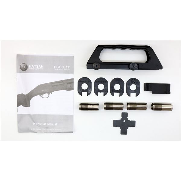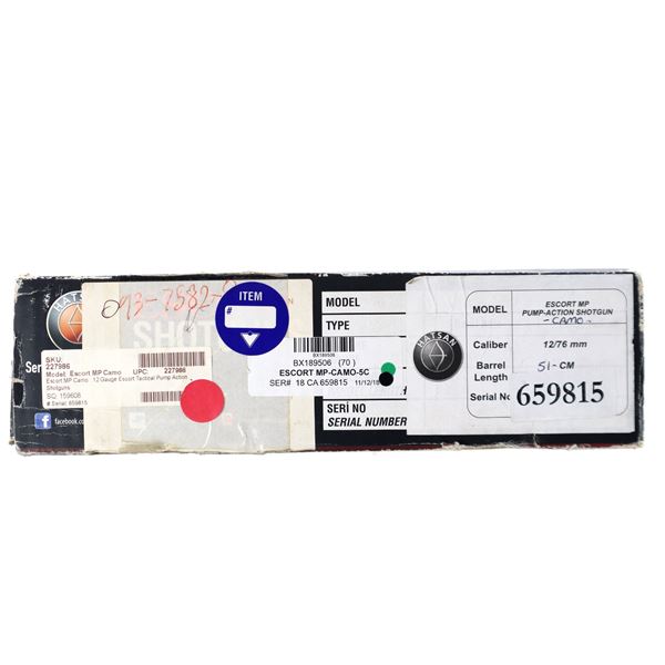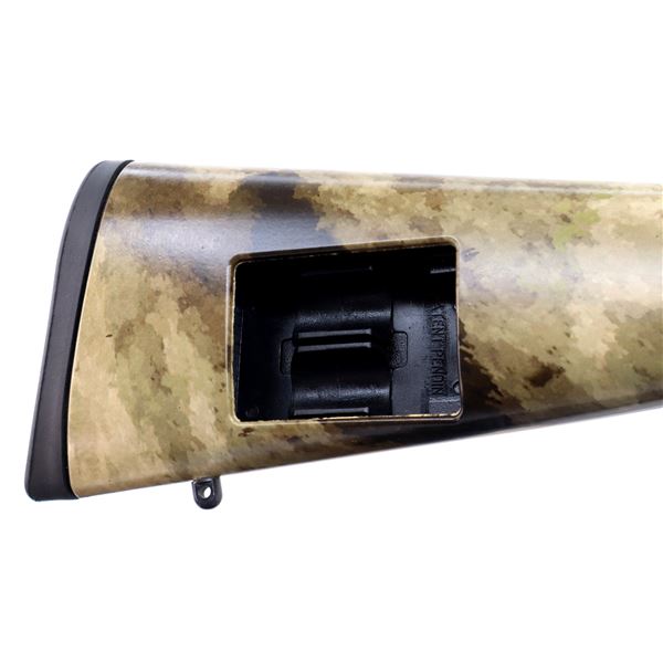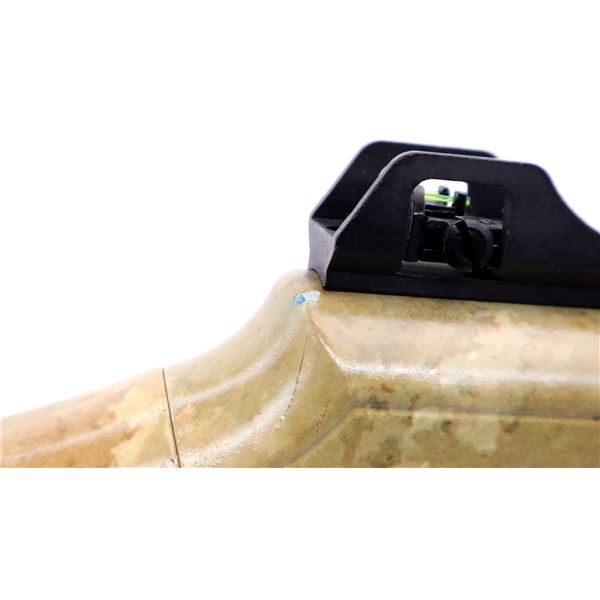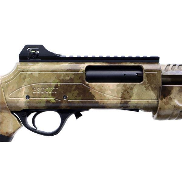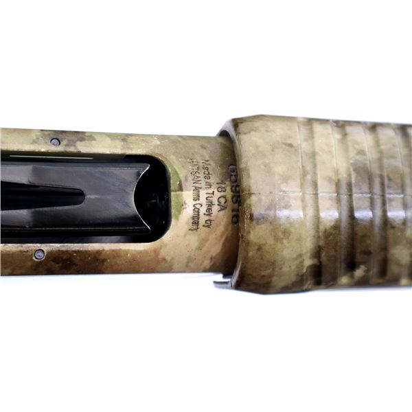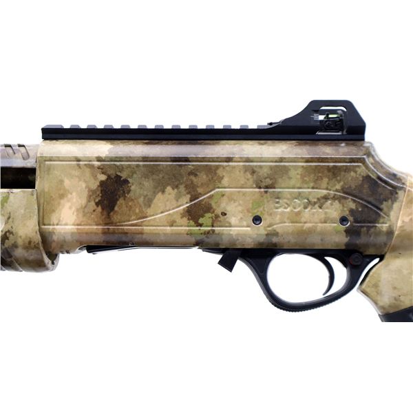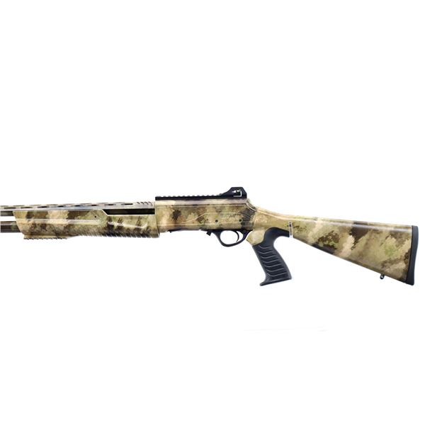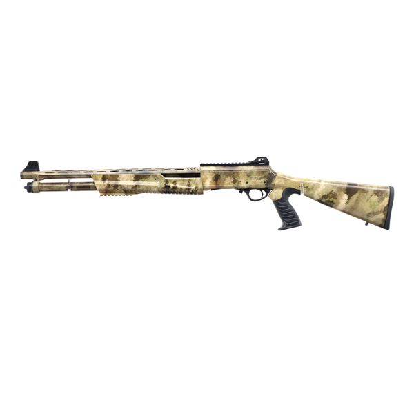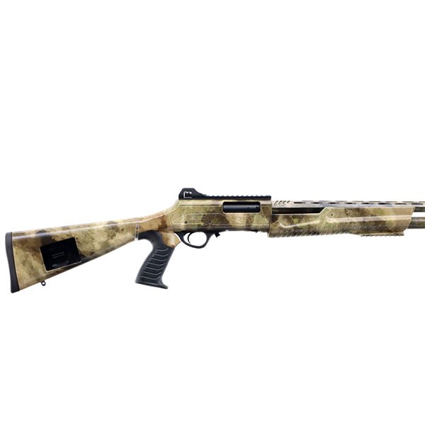Main Description: Red fiber optic front sight with ears and ramp, adjustable green fiber optic rear peep sight, 5C Camo overall. Round barrel with ventilated heat shield, alloy receiver drilled and tapped with full length rail. Two piece synthetic stocks, grooved forearm with rail on bottom, grooved black rubber pistol grip, black rubber recoil pad. Two round shell holder in right side of stock, swivel studs, full length magtube. Parts include: Carrying handle, 4 stock spacers, extra magazine tube follower. Accessories include: Spare IC, IM, Mod and Full chokes with wrench.