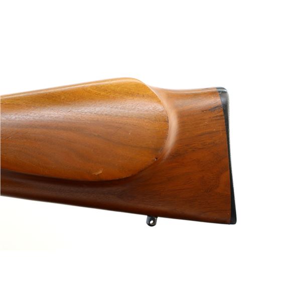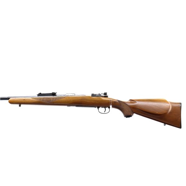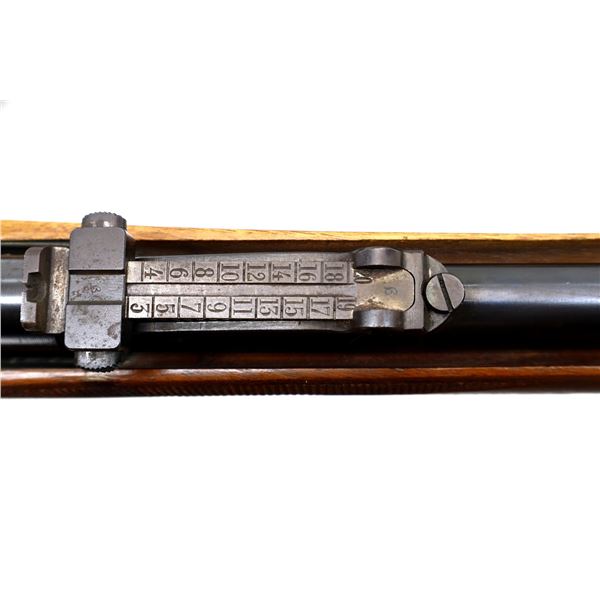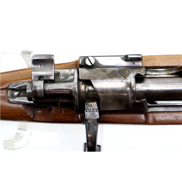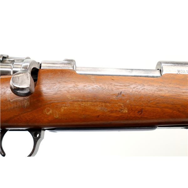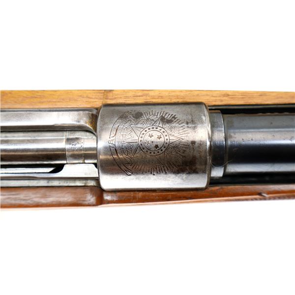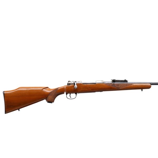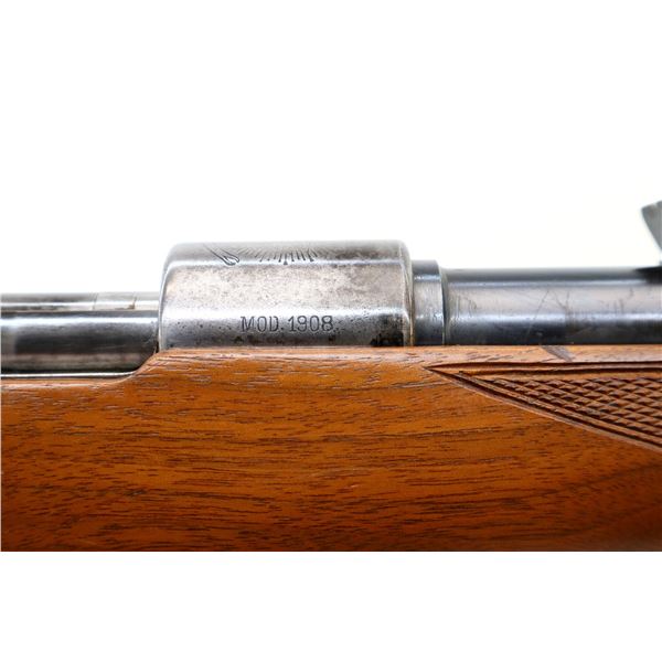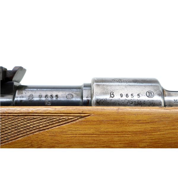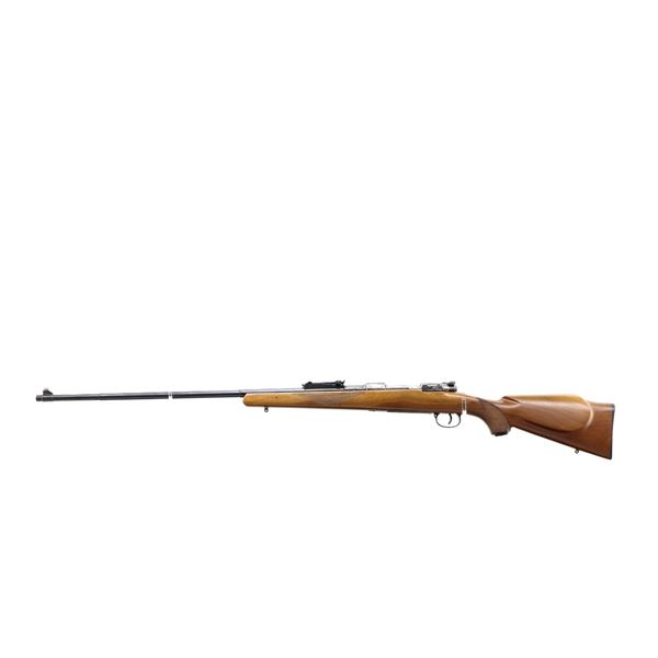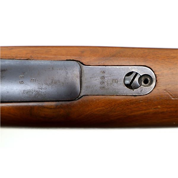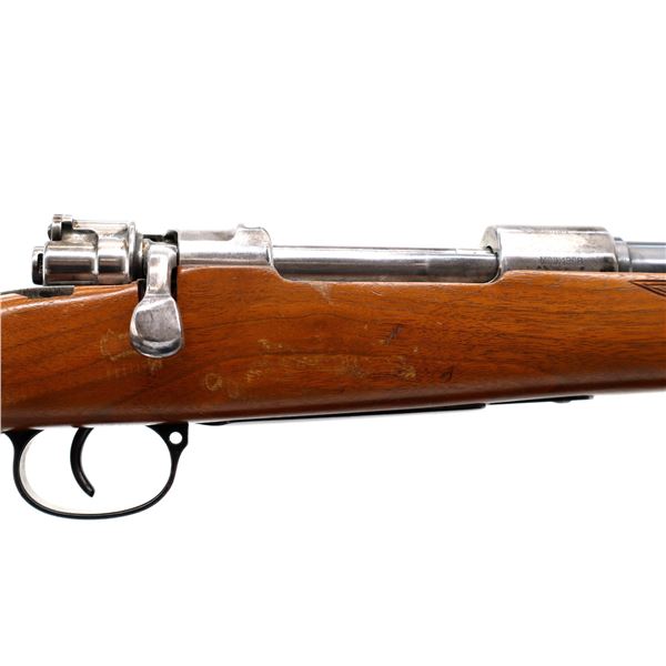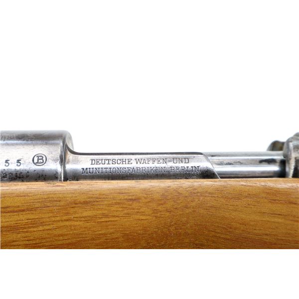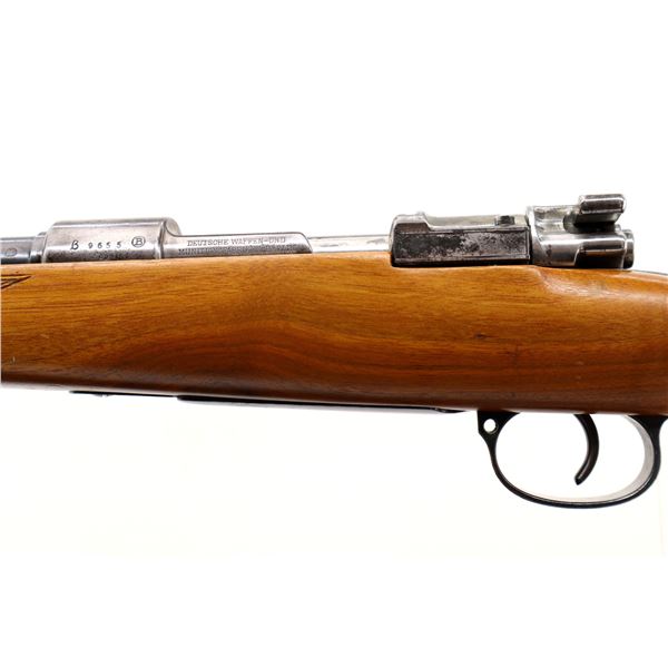 Main Description: Manufactured by DWM Berlin, serial numbers mismatched. Blade front sight with ramp, adjustable u notched rear sight, blued finish, Brazilian crest on receiver ring, modified bolt handle and knob. One piece sporter wood stock, wide forearm channel, checkered forearm, pistol grip and black polymer butt plate, cheek rest, grip cap, swivel studs.