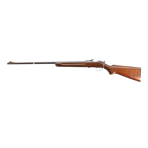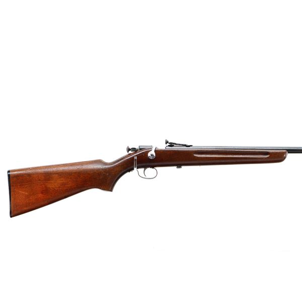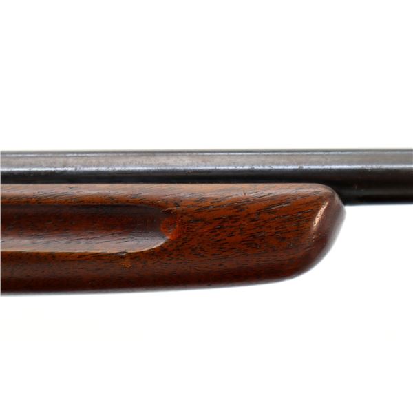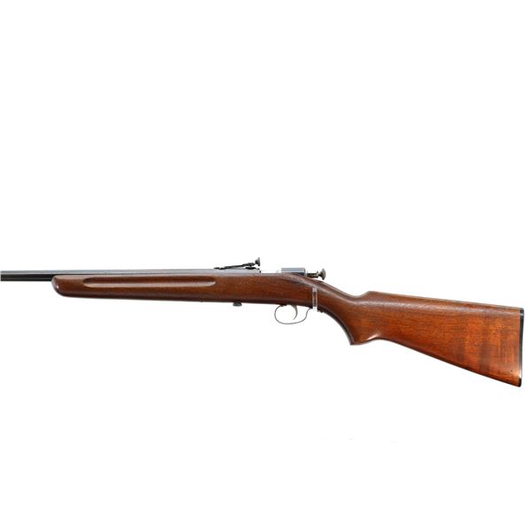 Main Description: Blade front sight with ramp, adjustable rear peep sight, blued finish, smooth bolt knob. One piece wood stock, finger grooved forearm, pistol grip, checkered black polymer butt plate.