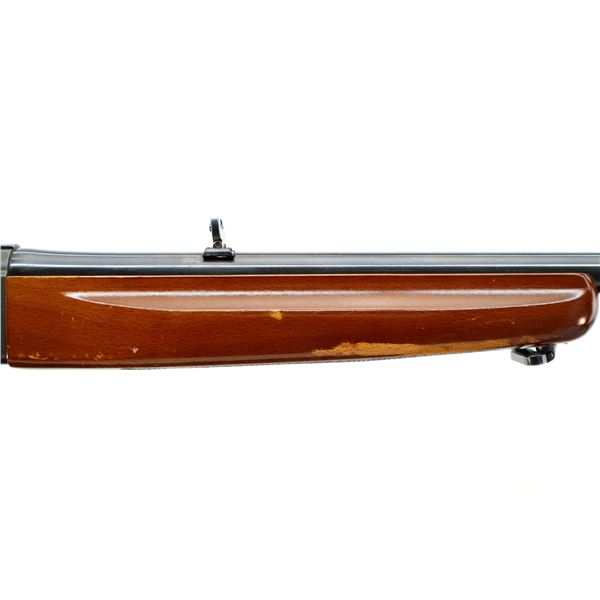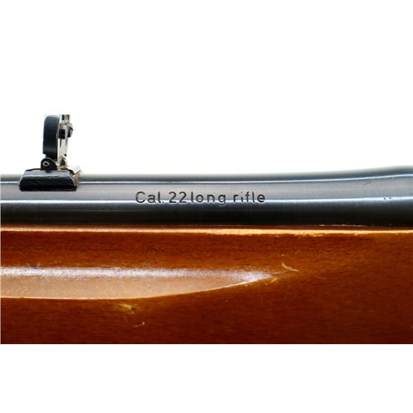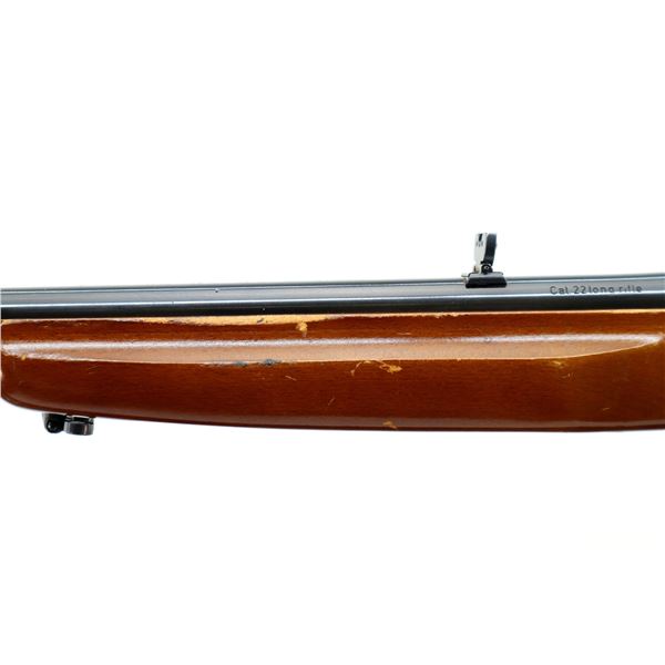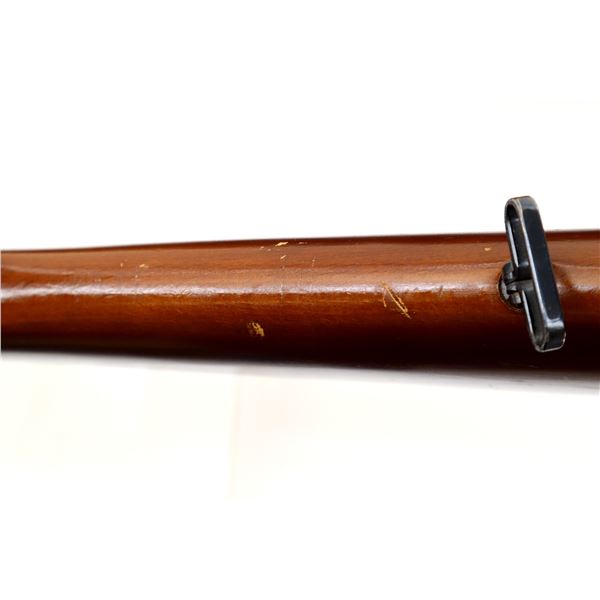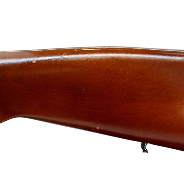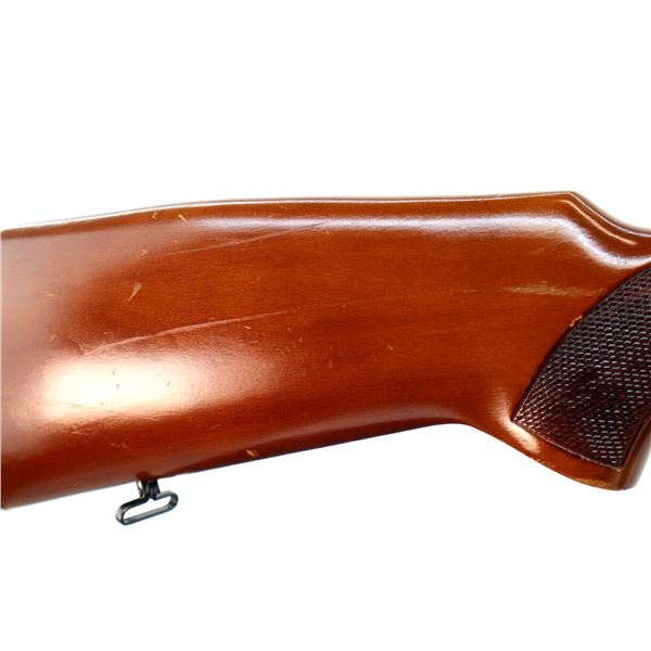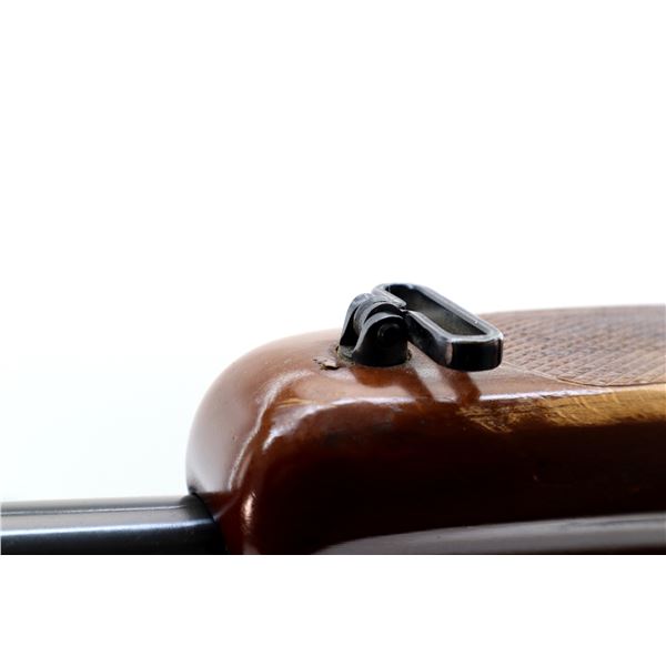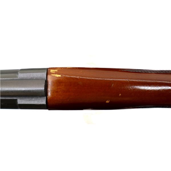 Main Description: Blade front sight missing ramp, adjustable folding u notched rear sight, blued round barrel, grooved grey alloy receiver. Two piece wood stocks, finger grooved checkered forearm, pistol grip and black polymer butt plate, has sling swivels.
