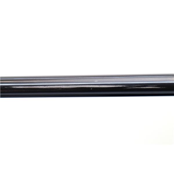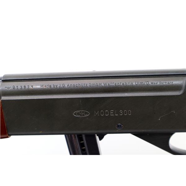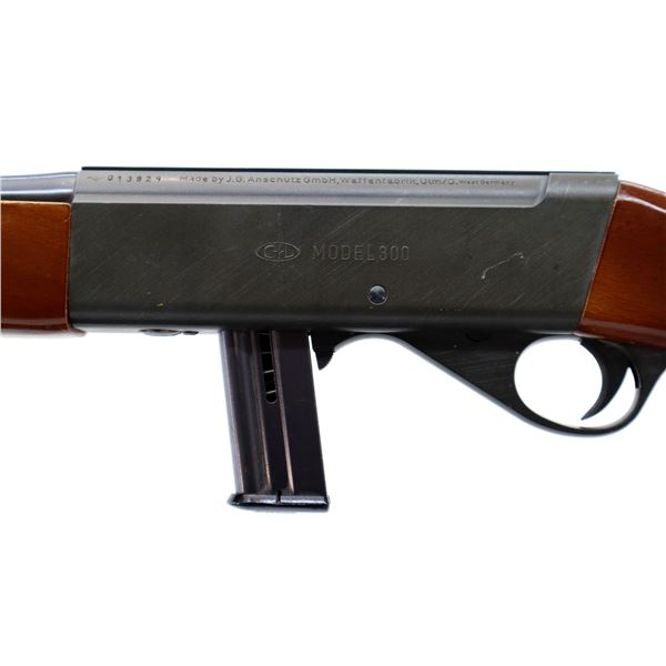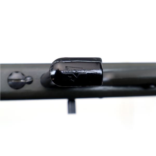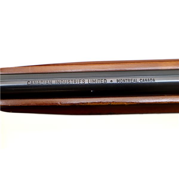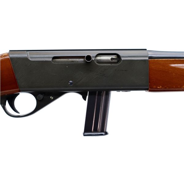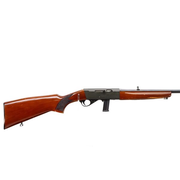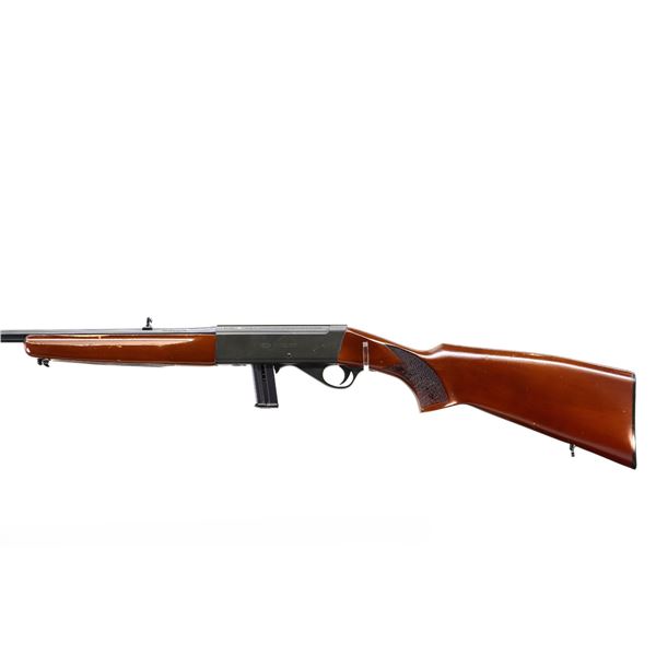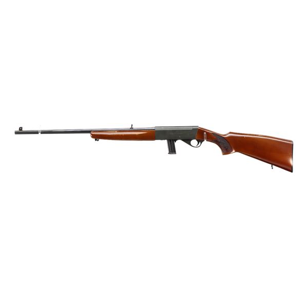 Main Description: Blade front sight missing ramp, adjustable folding u notched rear sight, blued round barrel, grooved grey alloy receiver. Two piece wood stocks, finger grooved checkered forearm, pistol grip and black polymer butt plate, has sling swivels.