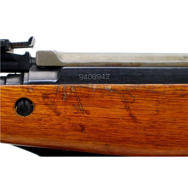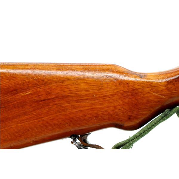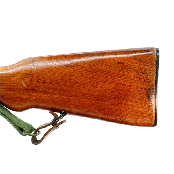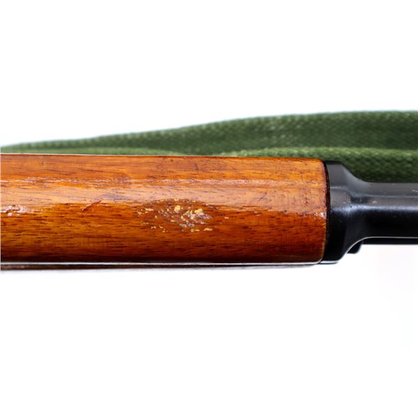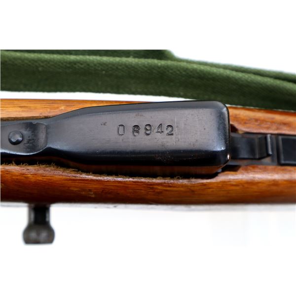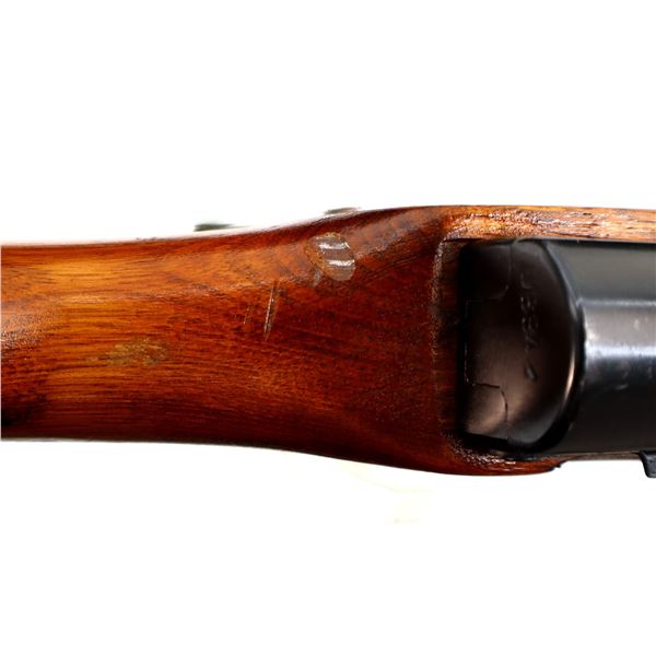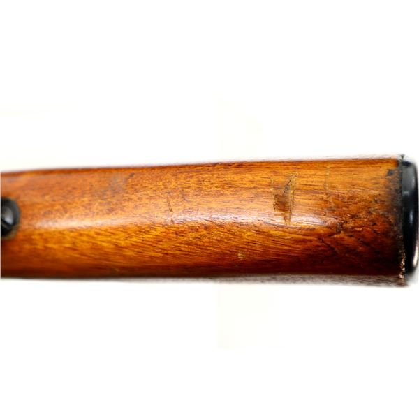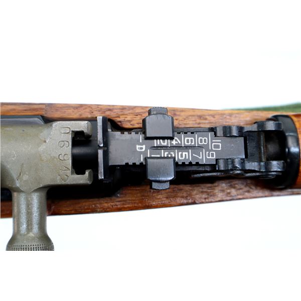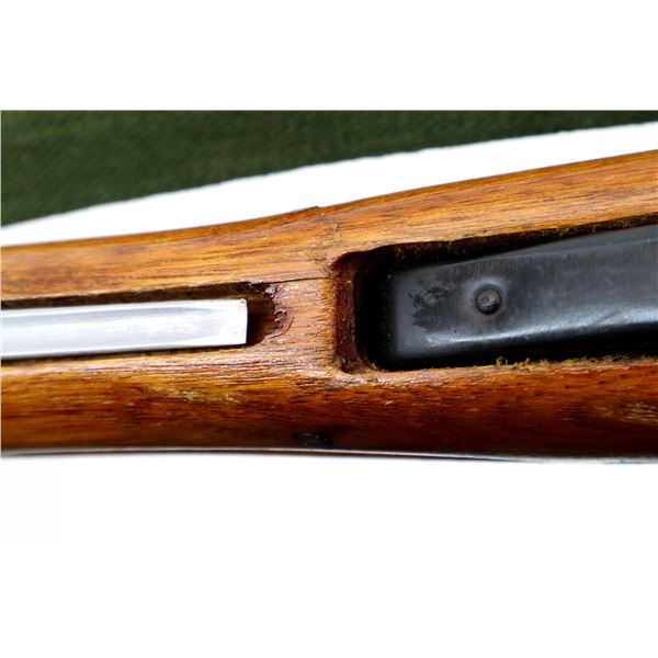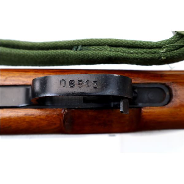 Main Description: Visible serial numbers match. Post front sight with hood and ramp, adjustable u notched rear sight, blued finish, silver bolt and carrier. Two piece full military wood stocks, ventilated handguard, finger grooved forearm, pistol grip, smooth steel butt plate with trap, sling swivels with Leather and Green Canvas military sling, cleaning rod, attached folding cruciform bayonet, cracked rear of channel.