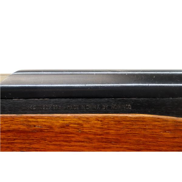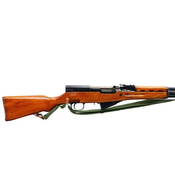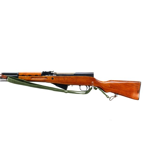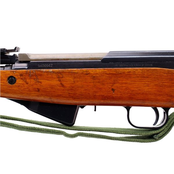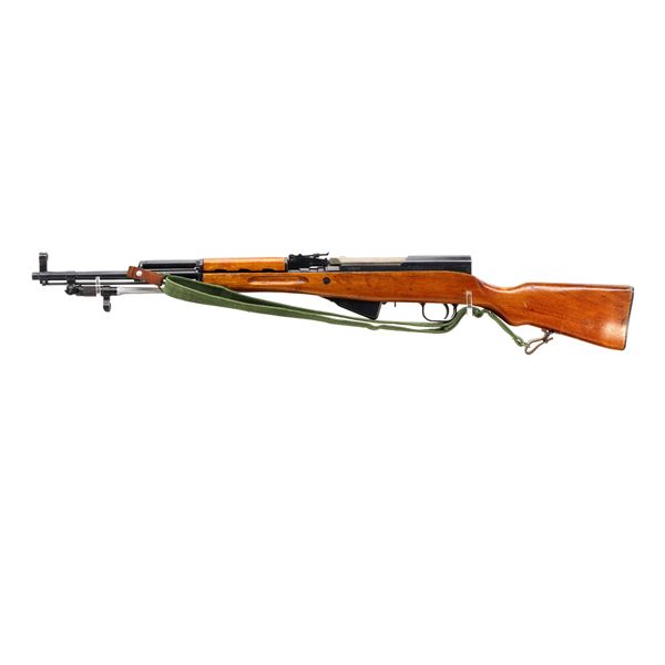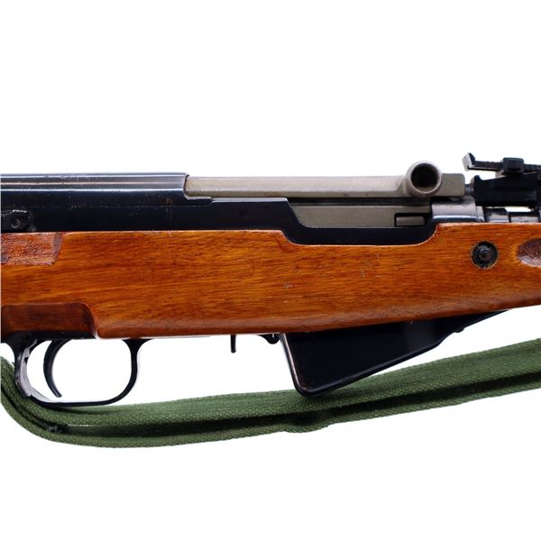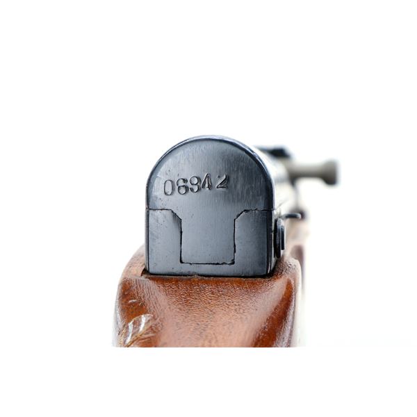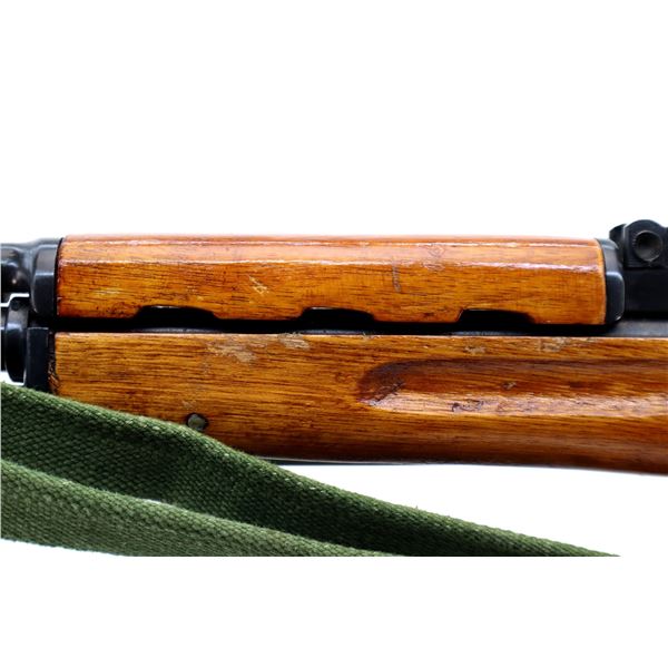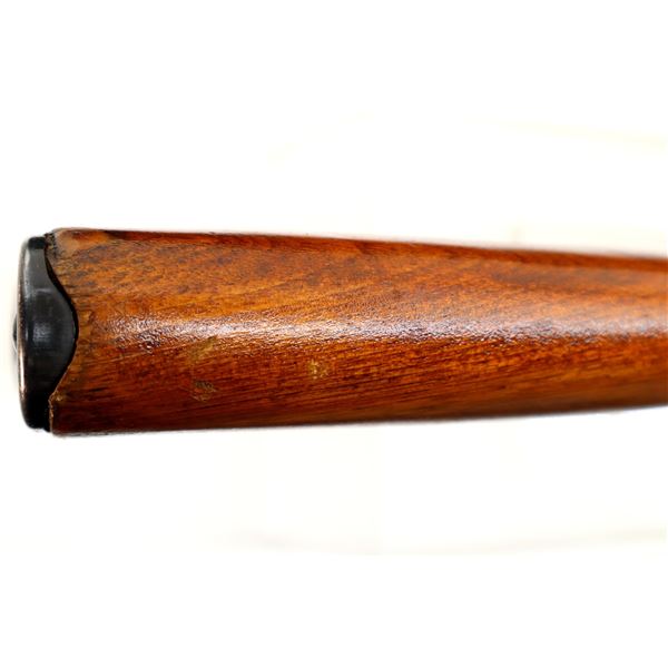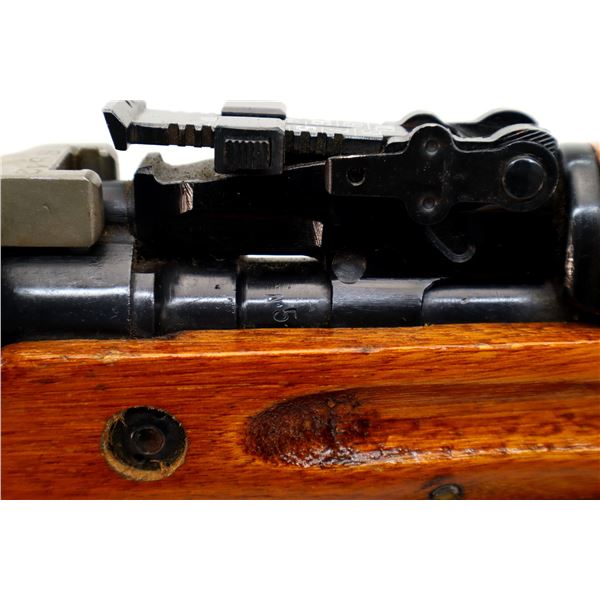Main Description: Visible serial numbers match. Post front sight with hood and ramp, adjustable u notched rear sight, blued finish, silver bolt and carrier. Two piece full military wood stocks, ventilated handguard, finger grooved forearm, pistol grip, smooth steel butt plate with trap, sling swivels with Leather and Green Canvas military sling, cleaning rod, attached folding cruciform bayonet, cracked rear of channel.