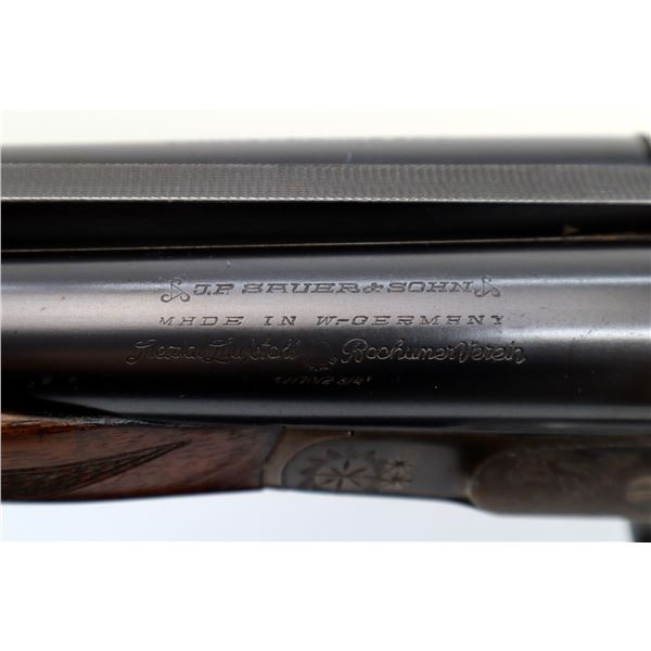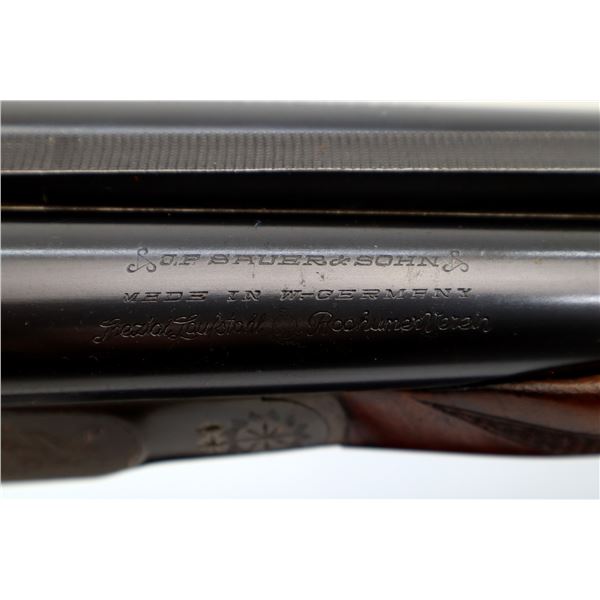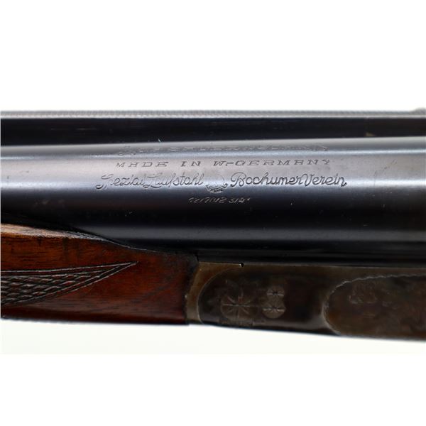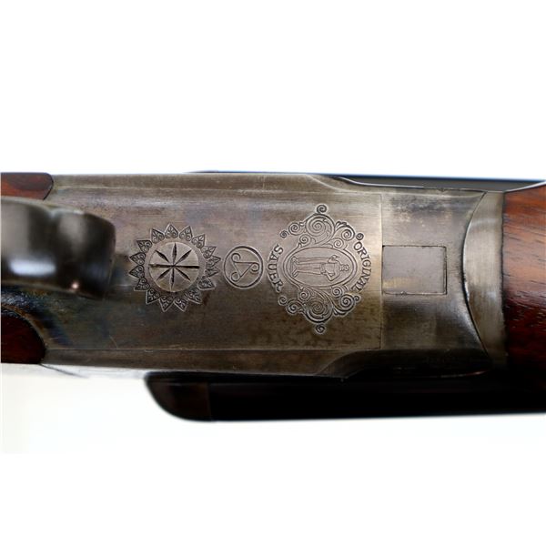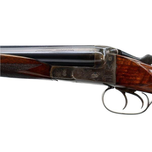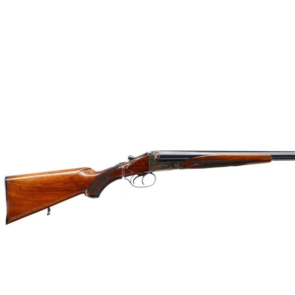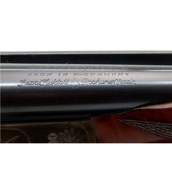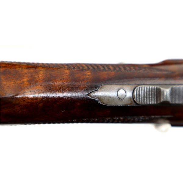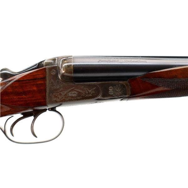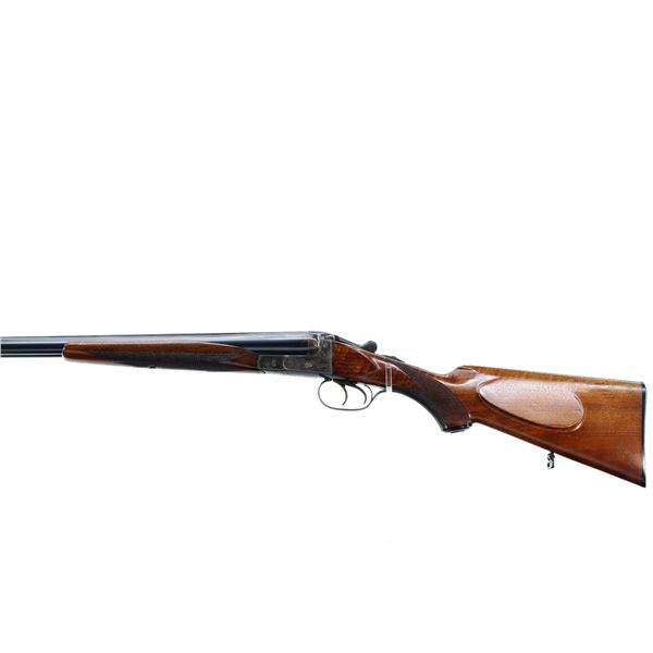 Main Description: Silver bead, blued barrels with raised rib, colour case hardened engraved receiver, automatic safety, extractor, double triggers. Two piece wood stocks, checkered Beavertail forearm and pistol grip, small crack behind upper tang, cheek rest, grooved black polymer butt plate, grip cap, sling swivels