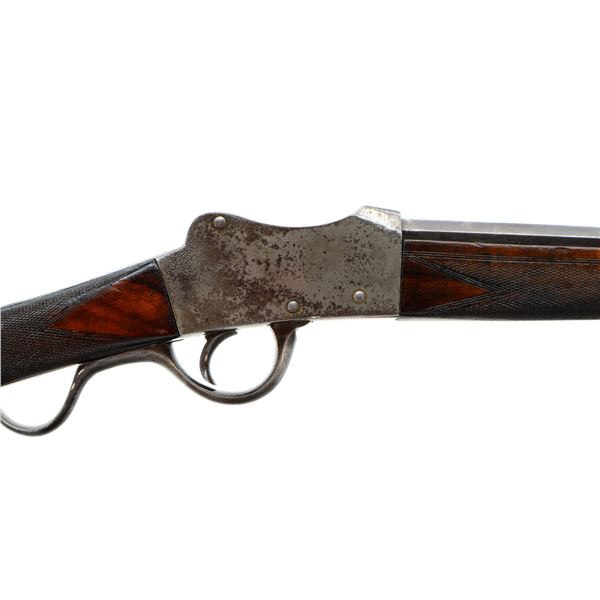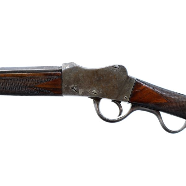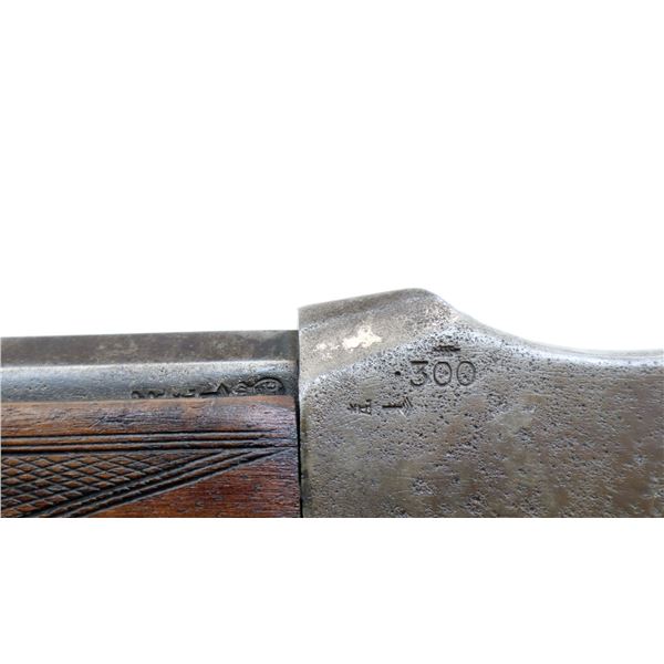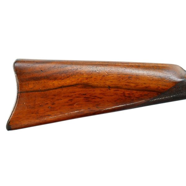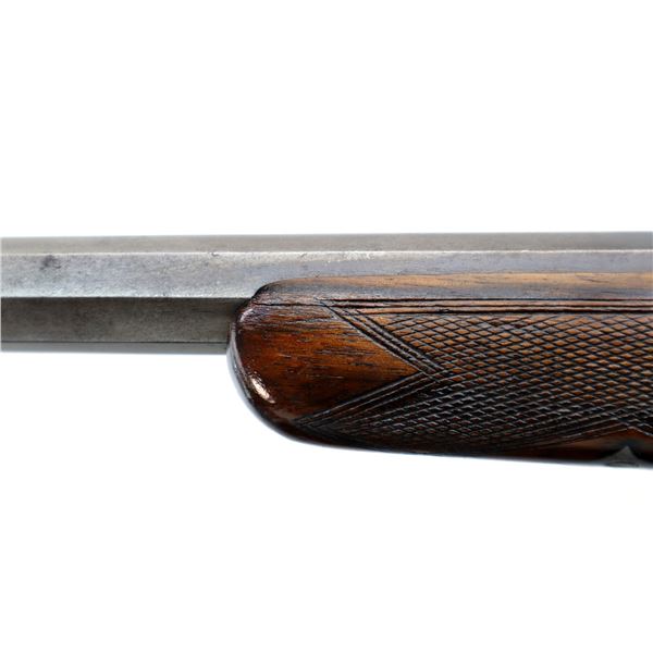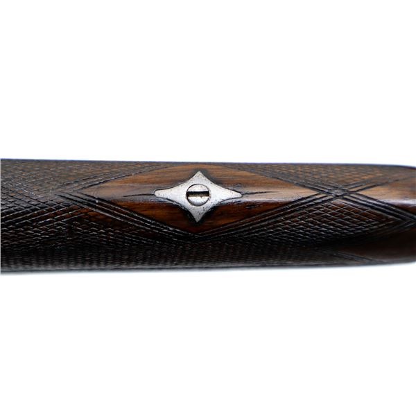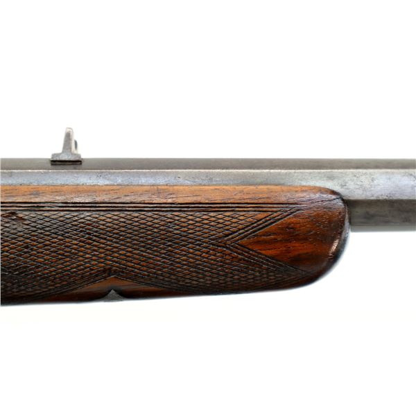 Main Description: Blade front sight, u notched rear sight, octagon barrel, short lever. Two piece wood stocks, checkered forearm cracked at tip on both sides, checkered straight grip, smooth curved steel butt plate
