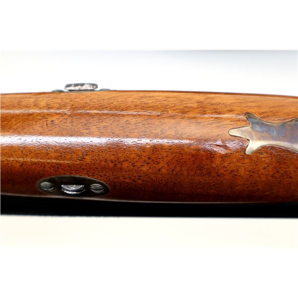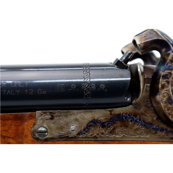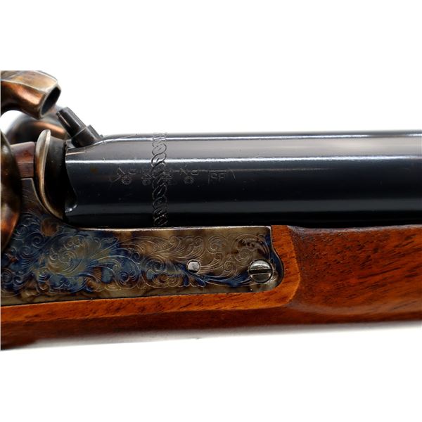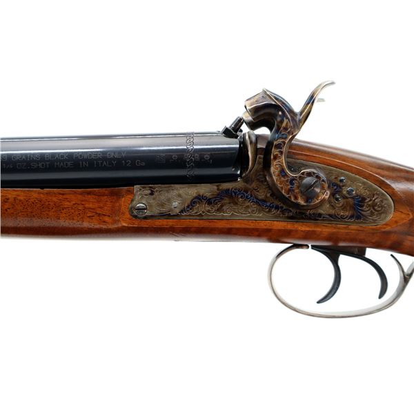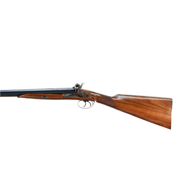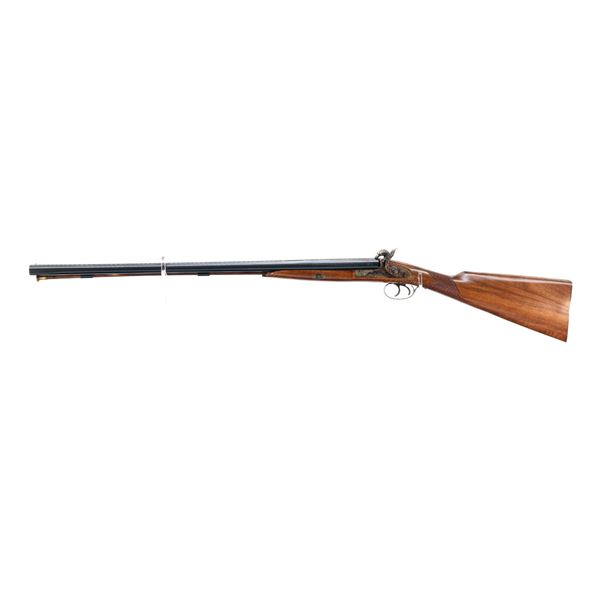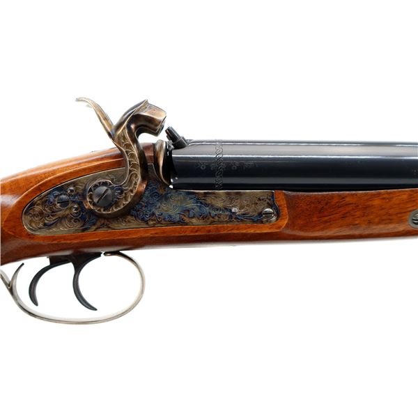 Main Description: Brass bead, polish blued barrels with smooth rib, engraved colour case hardened locks and checkered spur hammers that function, nipples are intact. One piece half length wood stock, single forearm wedge, checkered straight grip, smooth steel butt plate, wood ramrod with brass tip.
