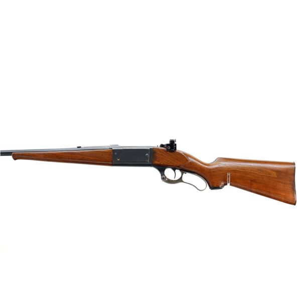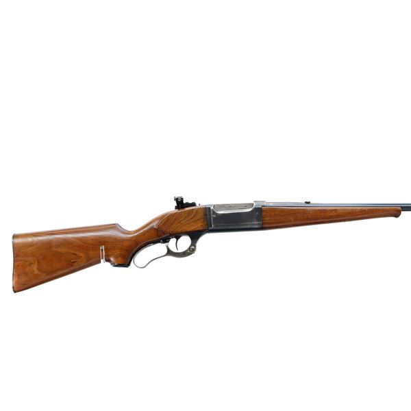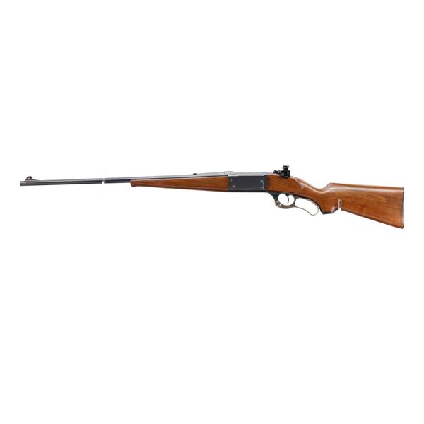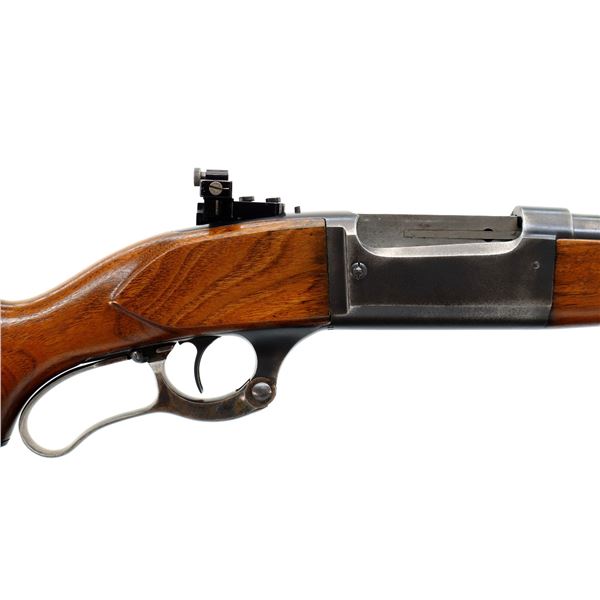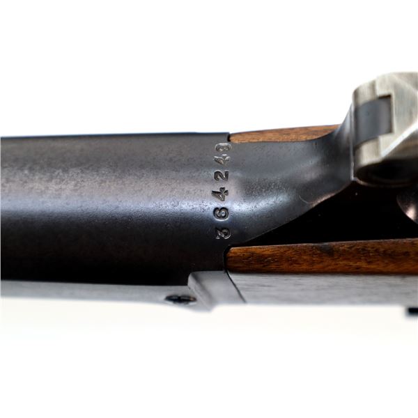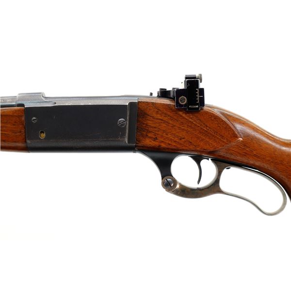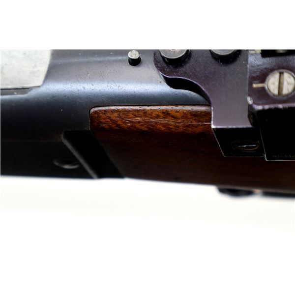 Main Description: Blade front sight with ramp, missing rear sight dovetail blank installed, receiver drilled and tapped with adjustable Williams peep sight on upper tang, blued finish, cocking indicator. Two piece wood stocks, Schnabel forend tip, pistol grip, grooved steel butt plate, grip cap, colour case hardened lever.