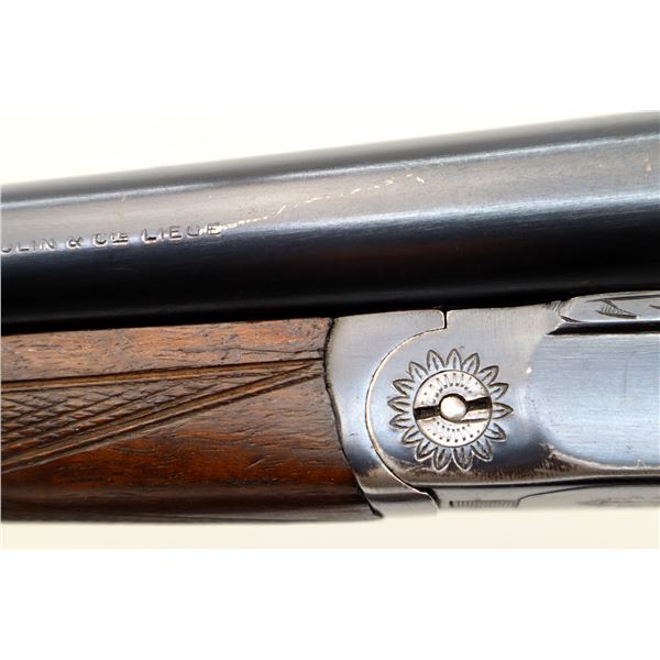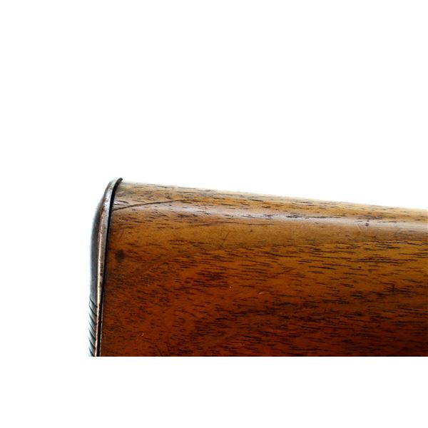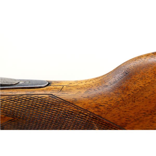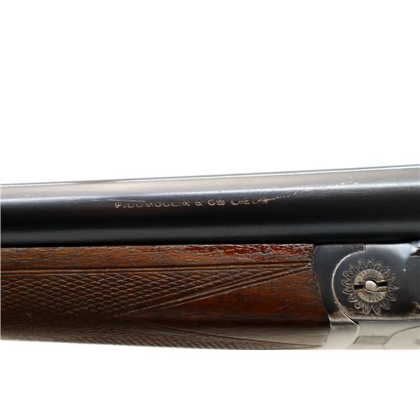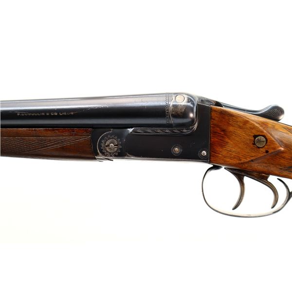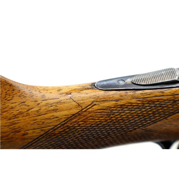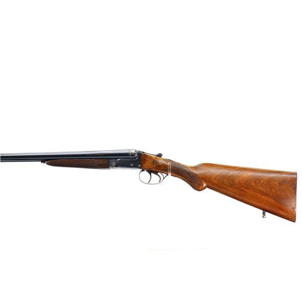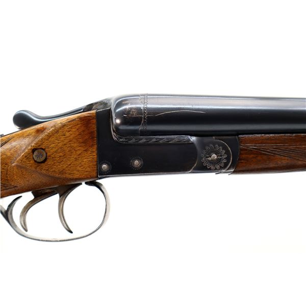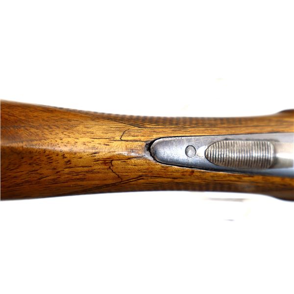 Main Description: Brass bead, blued finish, solid rib, automatic safety, requires repair or adjustment, extractor, double triggers. Two piece wood stocks, checkered forearm and pistol grip, cracked and repaired behind receiver and upper tang, grooved steel butt plate, sling swivels.