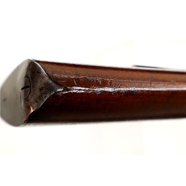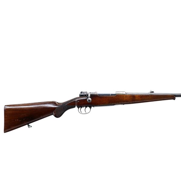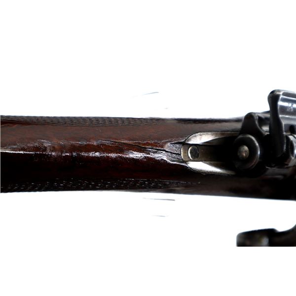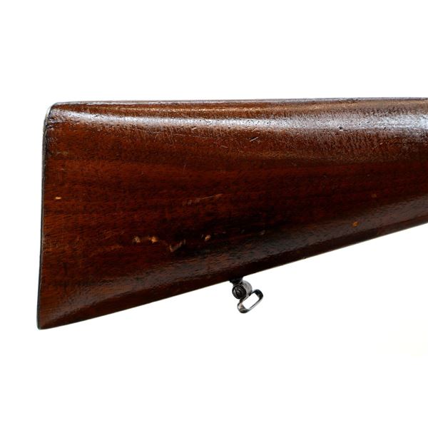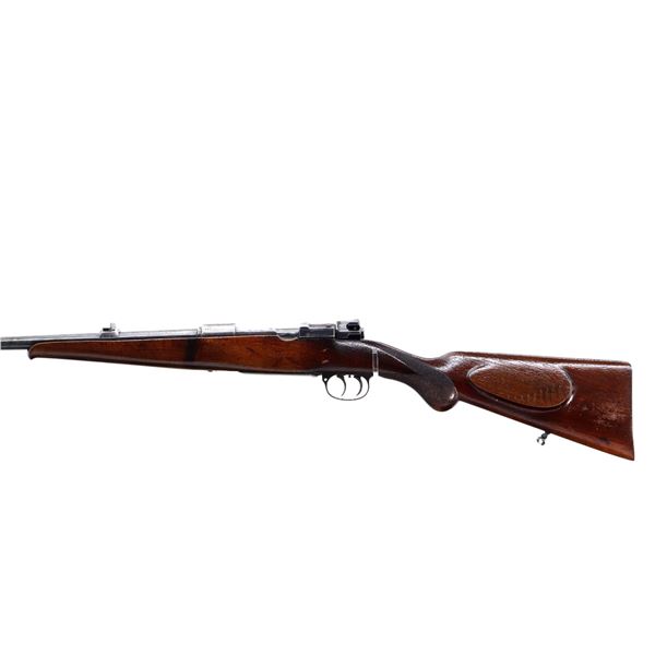 Main Description: Blade front sight with ramp, adjustable u notched rear sight with one fixed and one folding leaf, turned down bolt handle with checkered flat bottomed knob, double set triggers. One piece wood stock, Schnabel forend tip, checkered pistol grip cracked behind receiver, European cheek rest, smooth steel butt plate, stock cracked at heel. Sling swivels