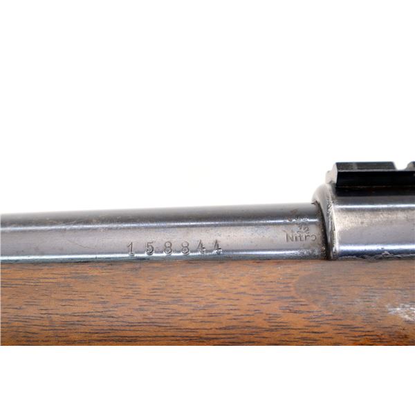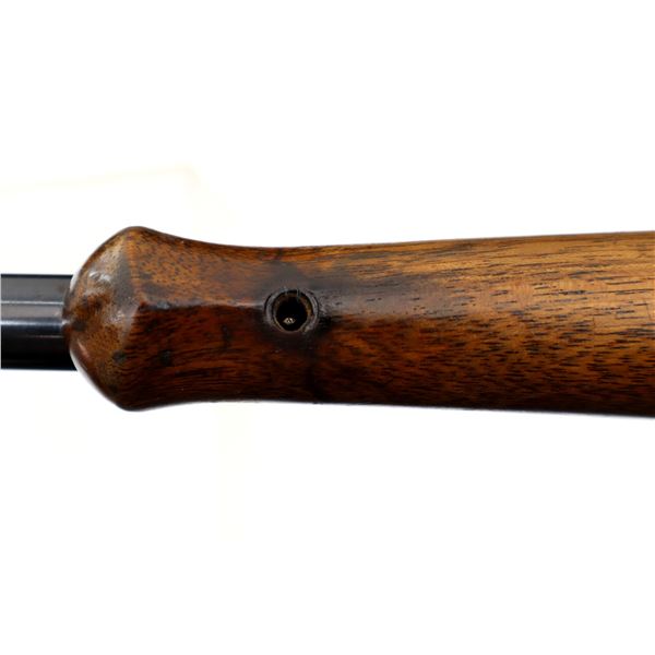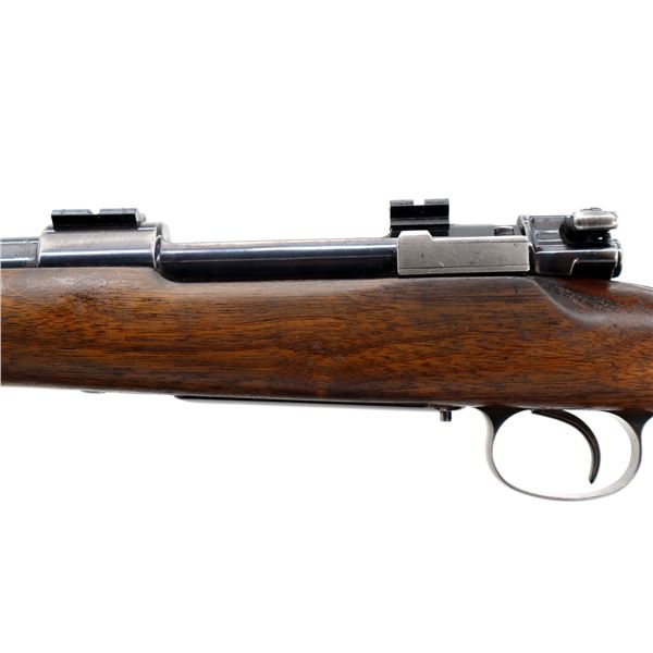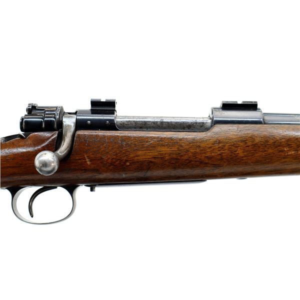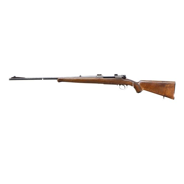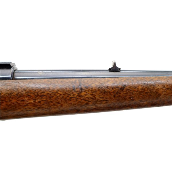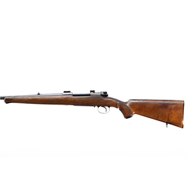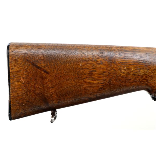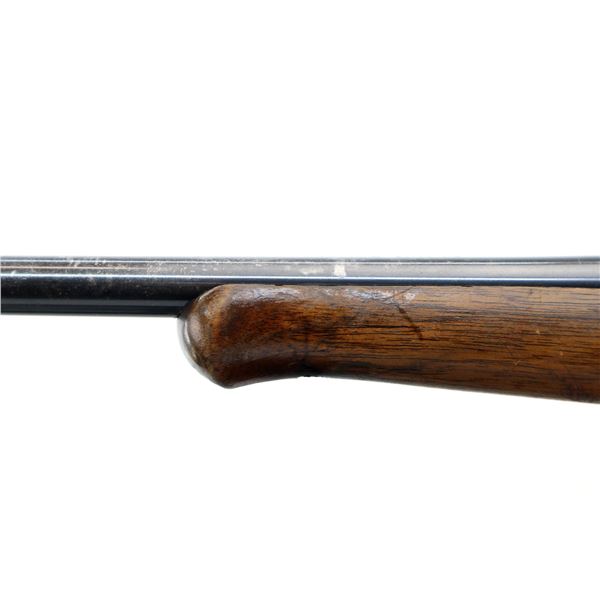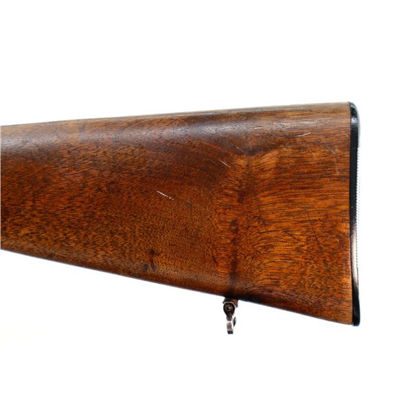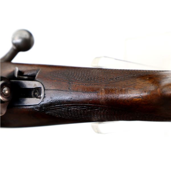 Main Description: Blade front sight with ramp, u notched rear sight, blued finish, receiver drilled and tapped with two piece scope bases installed, smooth bolt knob. One piece wood stock, Schnabel forend tip, checkered pistol grip cracked behind receiver, grooved black polymer butt plate, 13.75" LOP, grip cap, has a rear swivel missing the front hole is present.