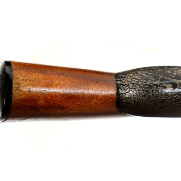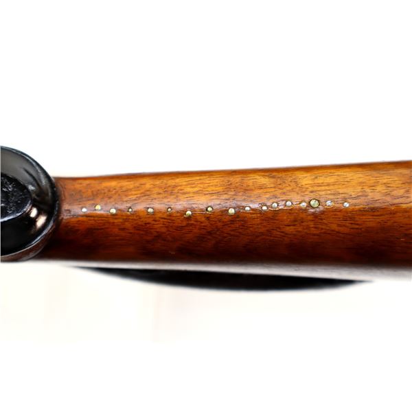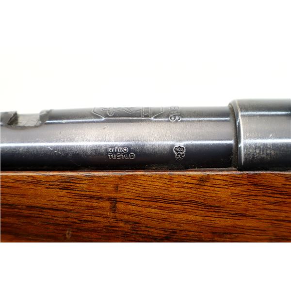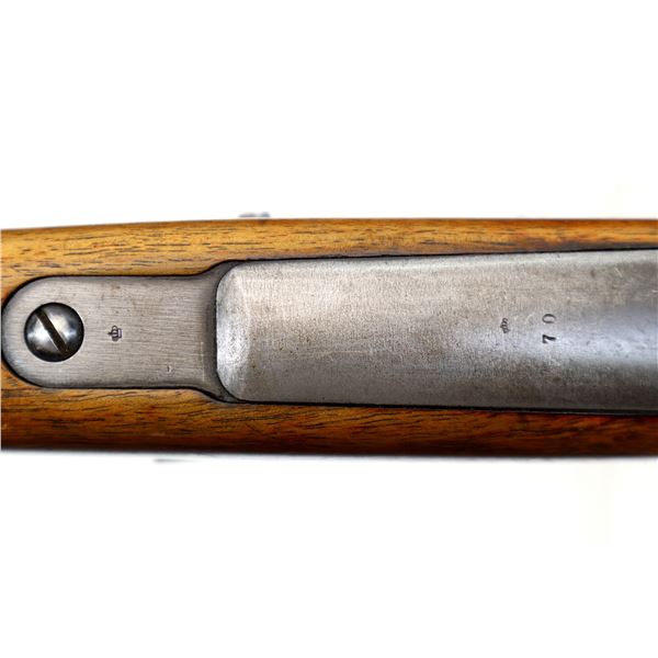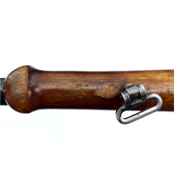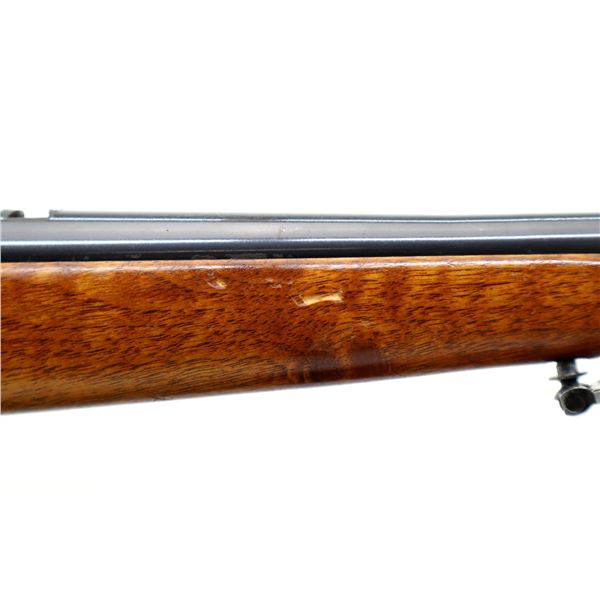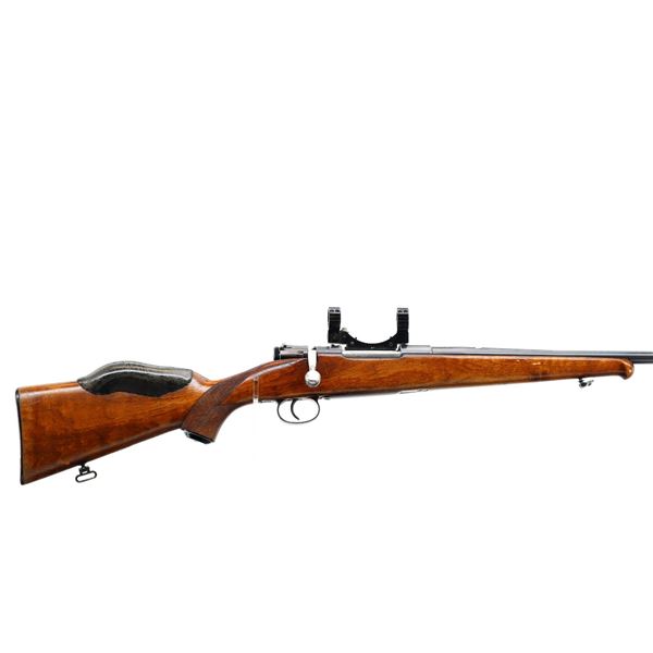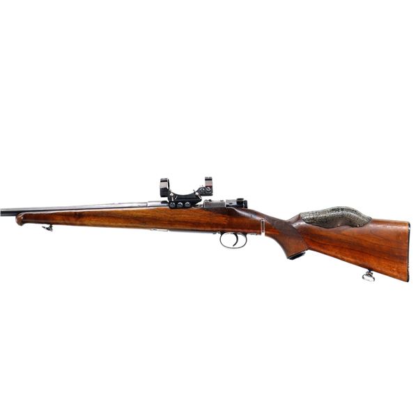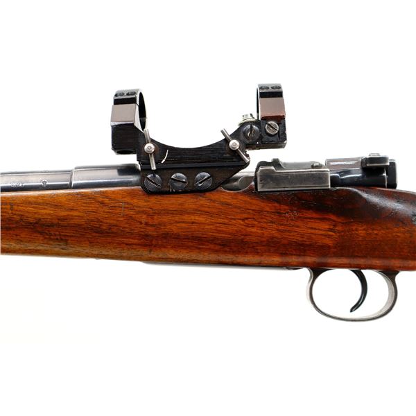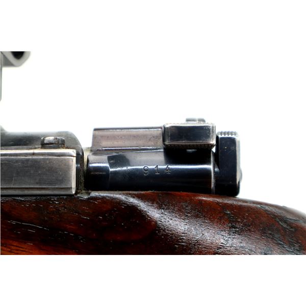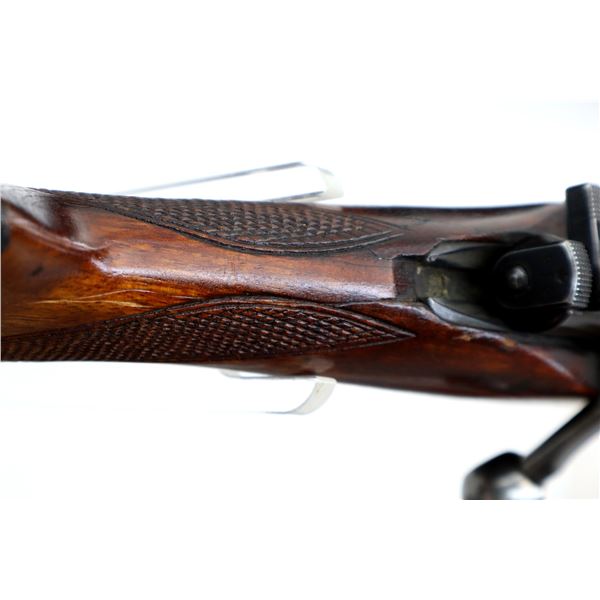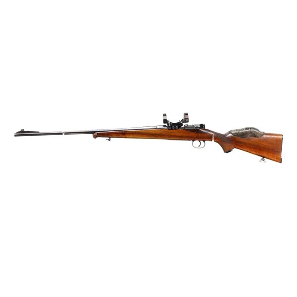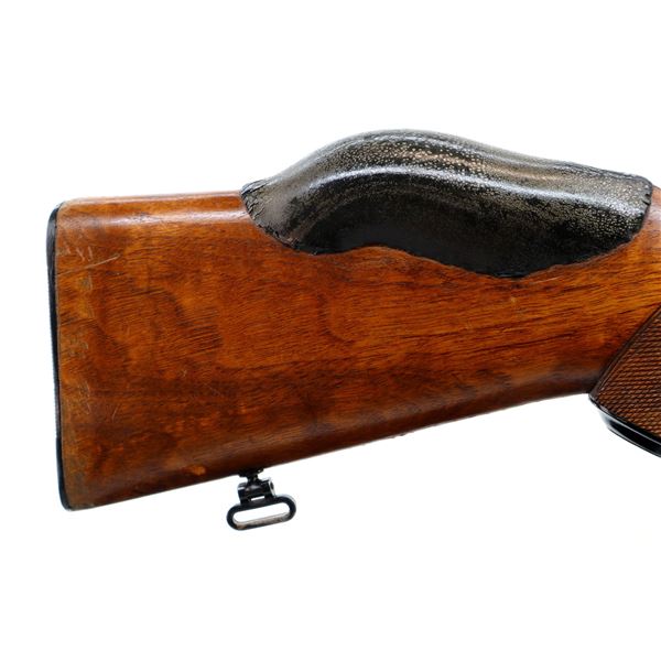 Main Description: Blade front sight with ramp, missing rear sight dovetail present, blued finish, receiver drilled and tapped with unknown scope mount 1" rings installed, modified bolt handle with flat sided knob. One piece wood stock, Schnabel forend tip, checkered pistol grip cracked behind receiver, modified comb, grooved black polymer butt plate, grip cap, sling swivels.