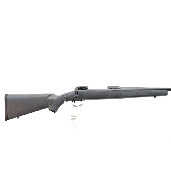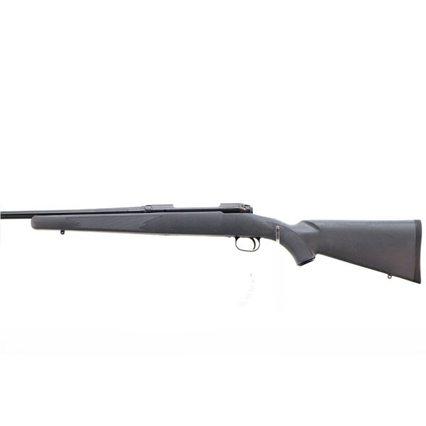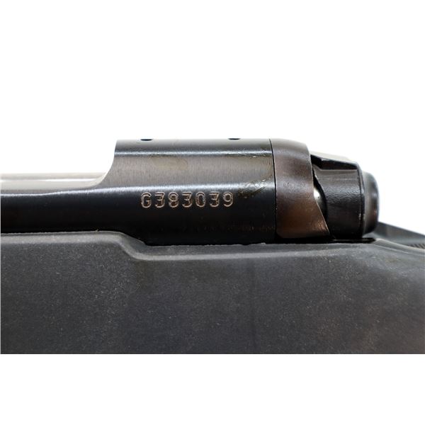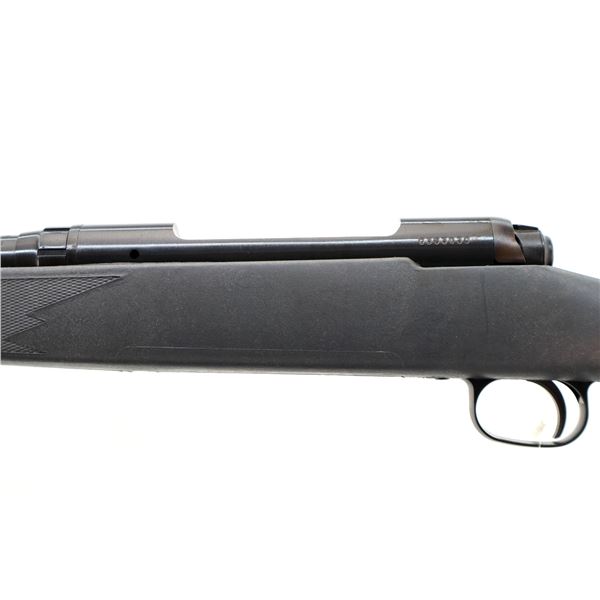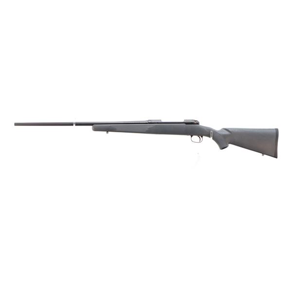 Main Description: No sights, blued finish, receiver drilled and tapped with no plug screws installed, checkered bolt knob. One piece grey synthetic stock, checkered forearm and pistol grip, black rubber recoil pad, grip cap, non accu trigger, swivel studs, retains factory hang tag.