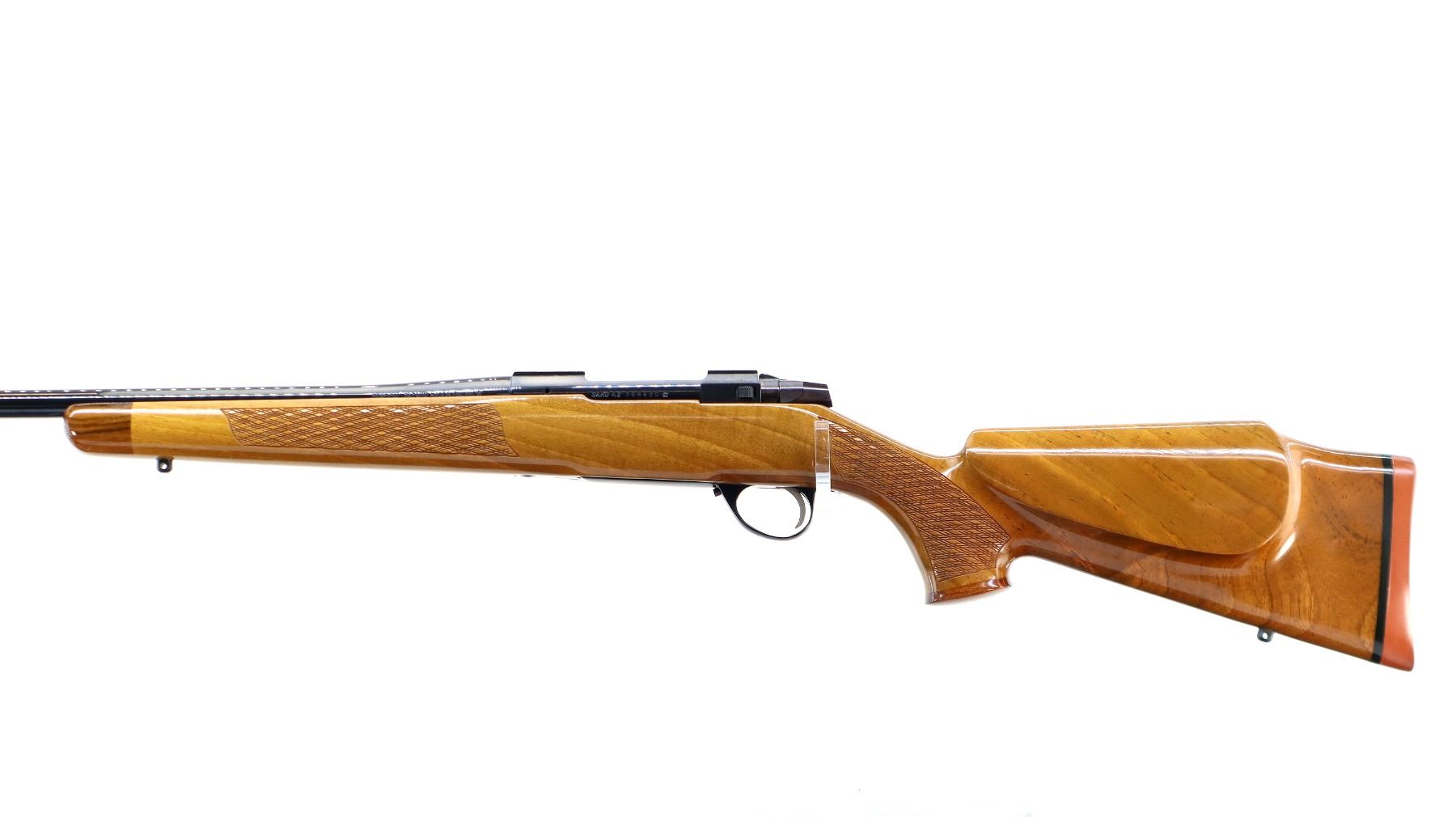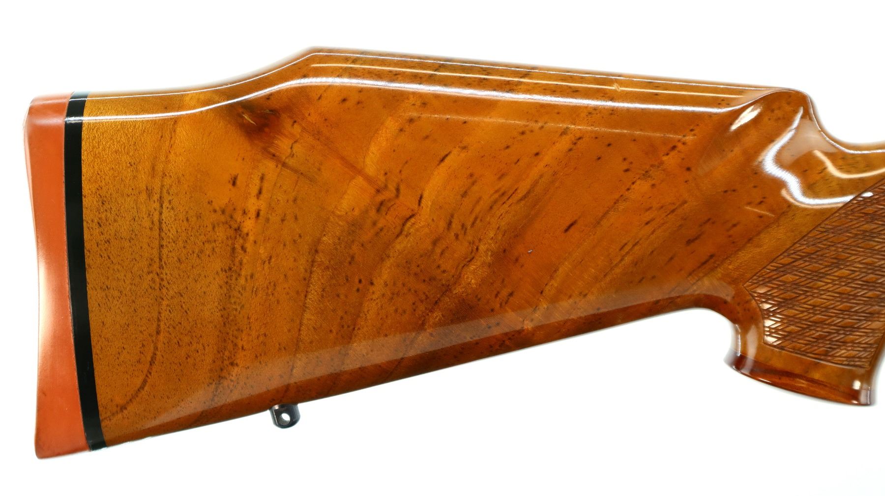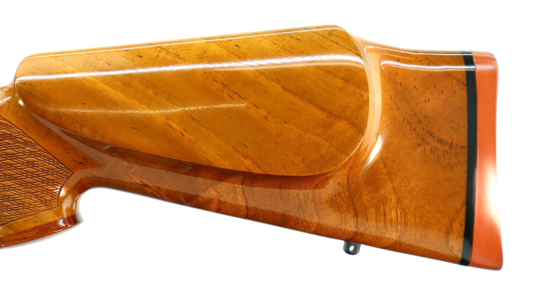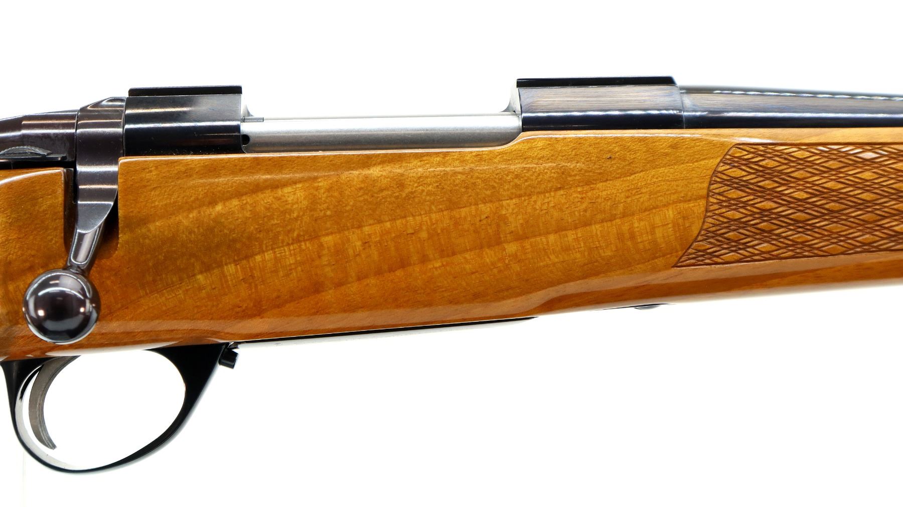 Main Description: No sights, polished blued finish, tapered round barrel, receiver has integral scope bases, smooth bolt knob. One piece gloss finish wood stock, Rosewood forend and pistol grip caps, checkered forearm and pistol grip with right hand palm swell, red rubber recoil pad, engraved steel hinged floor plate and trigger guard, swivel studs.