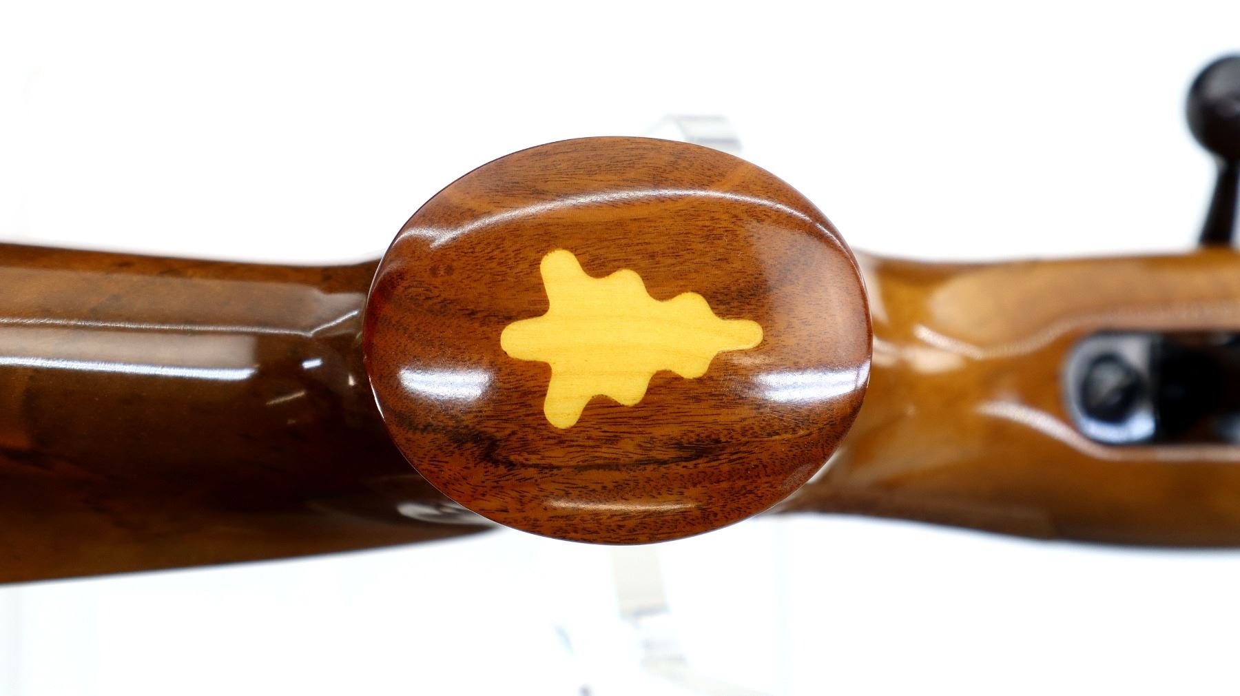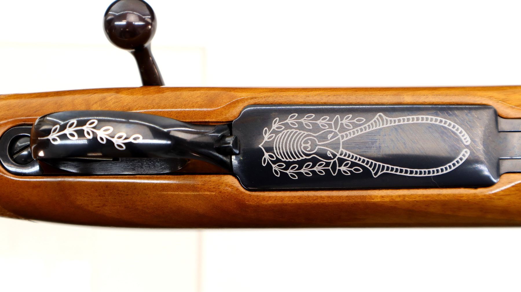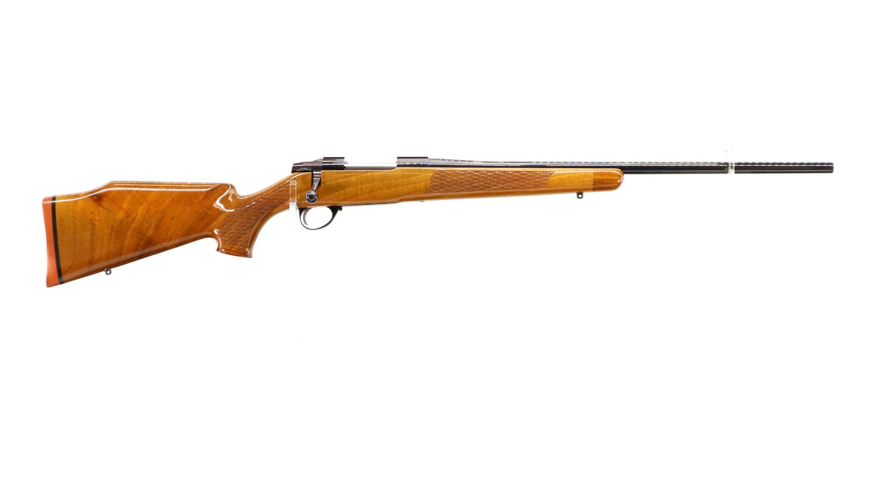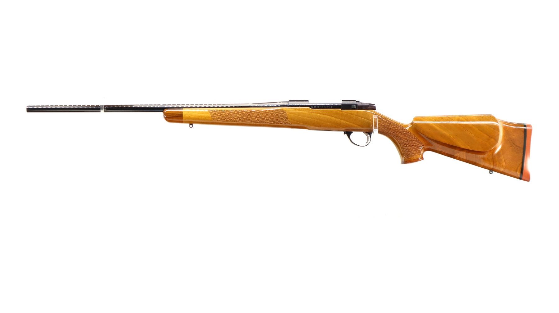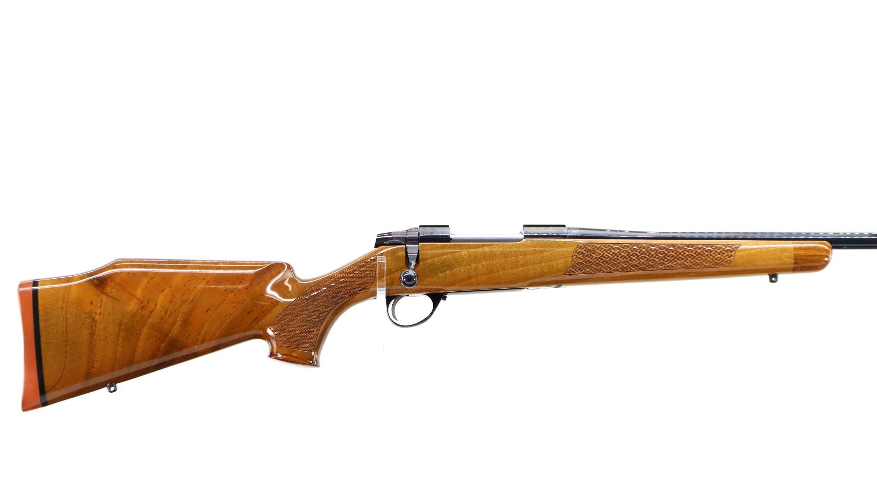 Main Description: No sights, polished blued finish, tapered round barrel, receiver has integral scope bases, smooth bolt knob. One piece gloss finish wood stock, Rosewood forend and pistol grip caps, checkered forearm and pistol grip with right hand palm swell, red rubber recoil pad, engraved steel hinged floor plate and trigger guard, swivel studs.