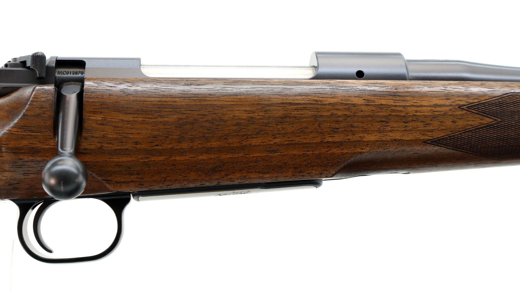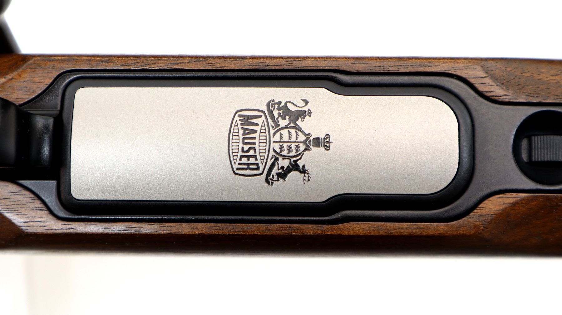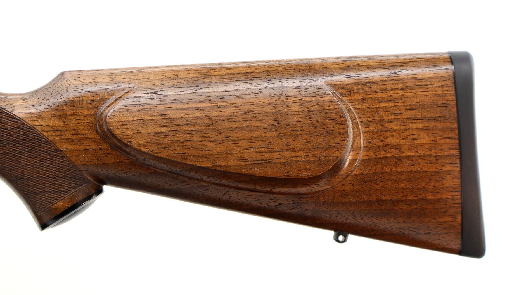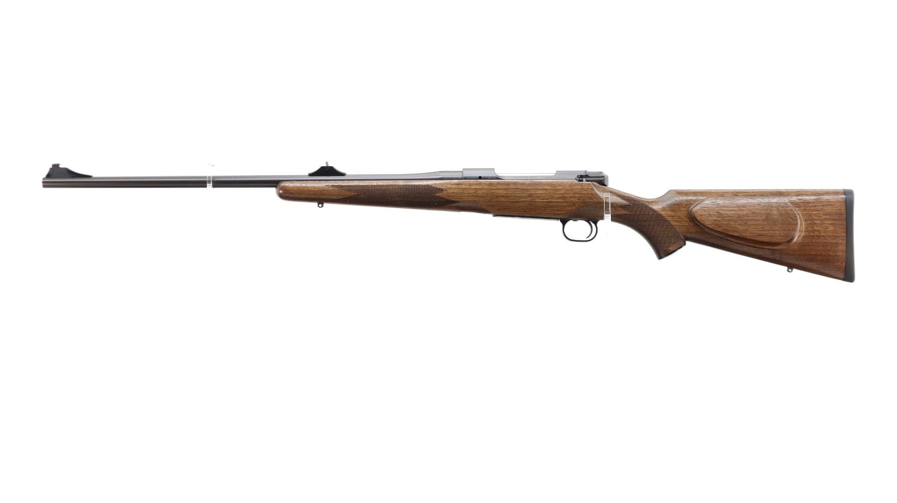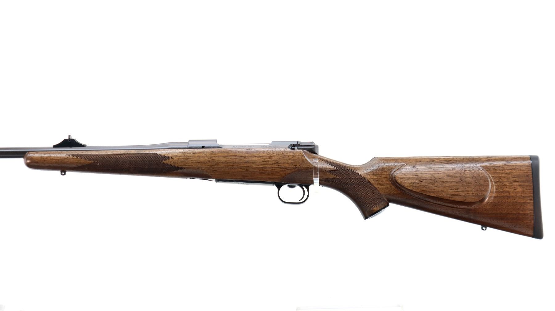 Main Description: Blade front sight with ramp, adjustable u notched rear sight with ramp, matte blued metal finish, receiver drilled and tapped with no plug screws installed, smooth bolt knob. One piece Satin finish wood stock, checkered forearm and pistol grip, European cheek rest, black rubber recoil pad, grip cap, Mauser logo on bottom of mag, swivel studs.