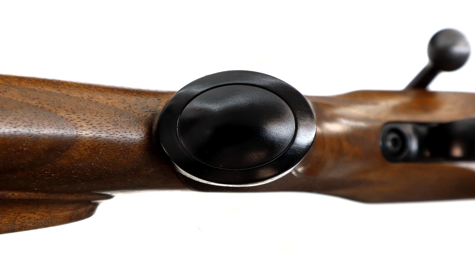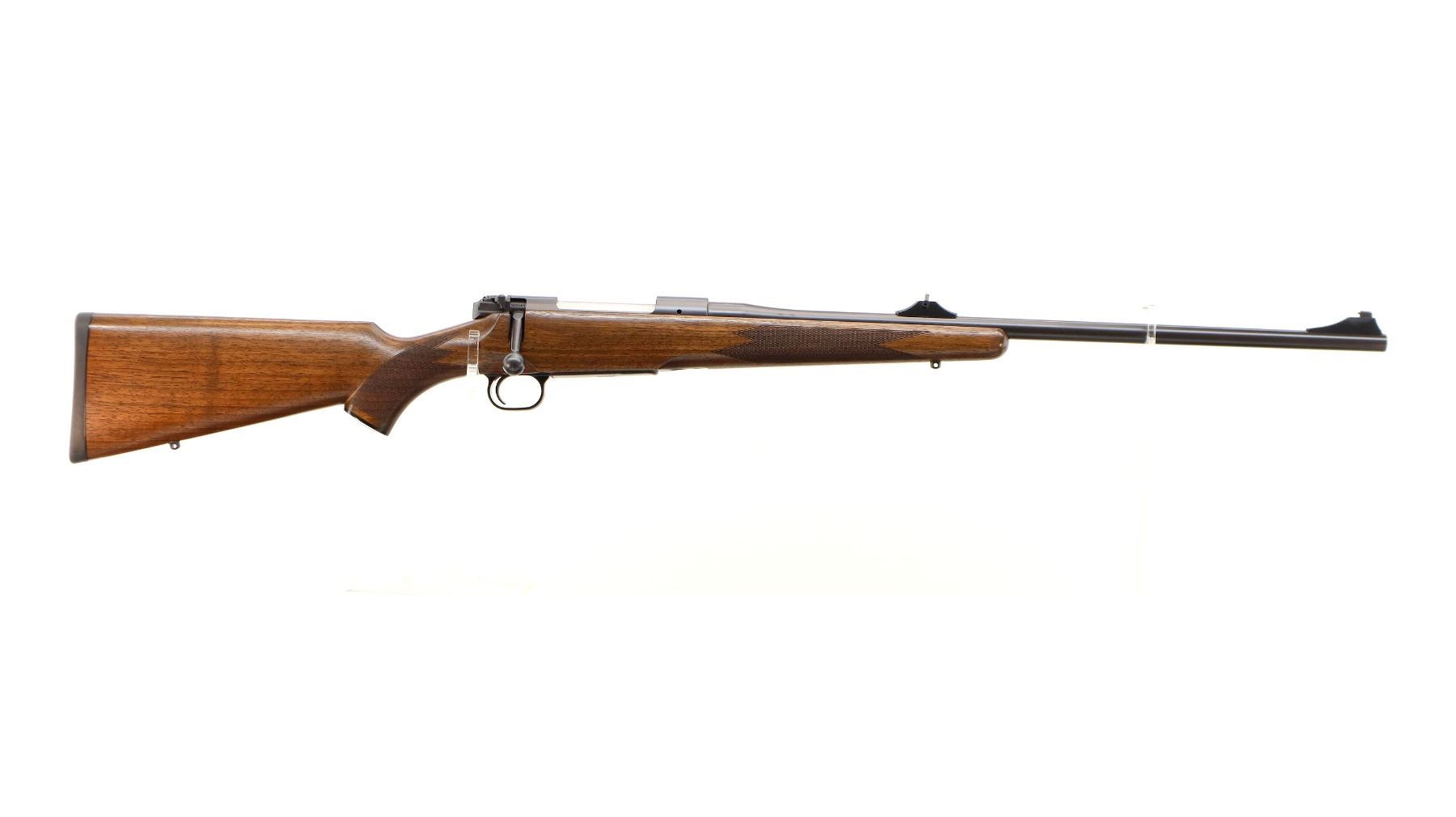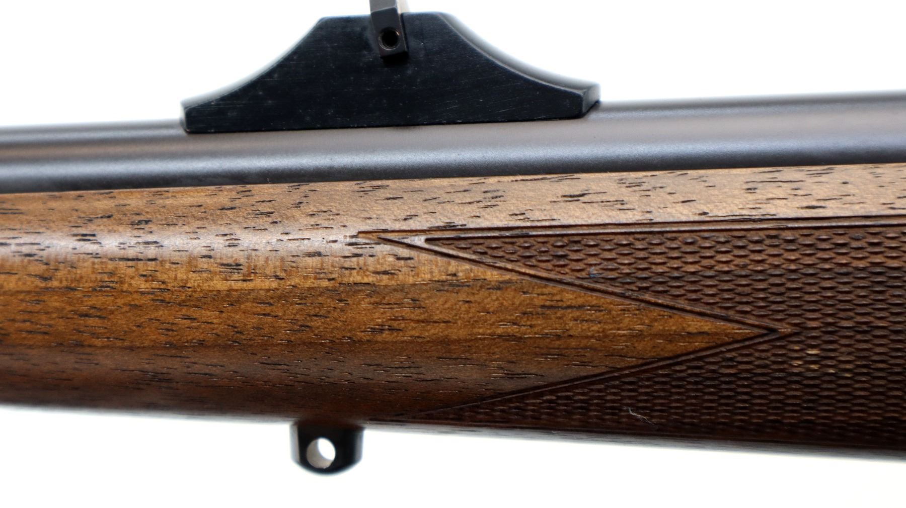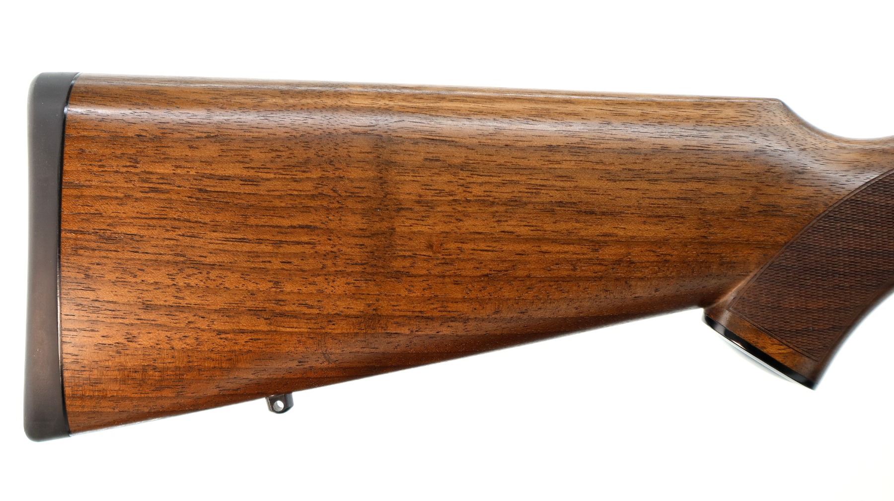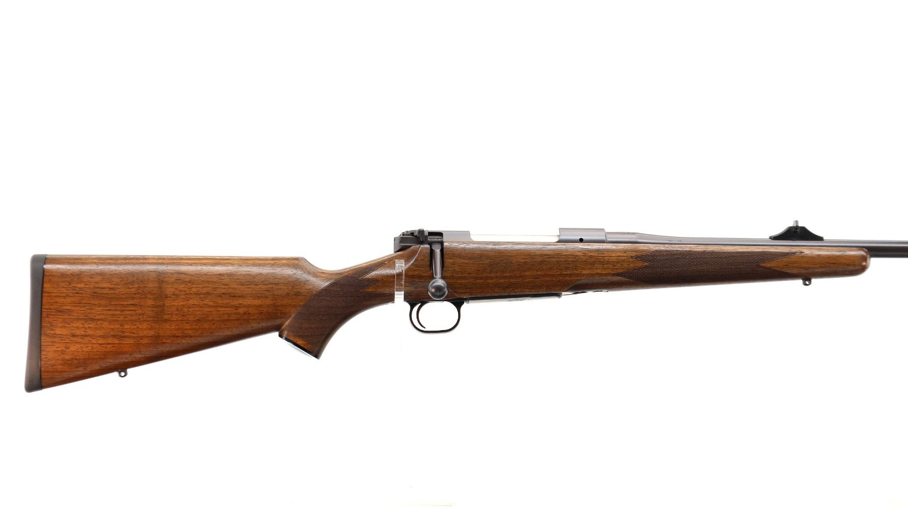 Main Description: Blade front sight with ramp, adjustable u notched rear sight with ramp, matte blued metal finish, receiver drilled and tapped with no plug screws installed, smooth bolt knob. One piece Satin finish wood stock, checkered forearm and pistol grip, European cheek rest, black rubber recoil pad, grip cap, Mauser logo on bottom of mag, swivel studs.