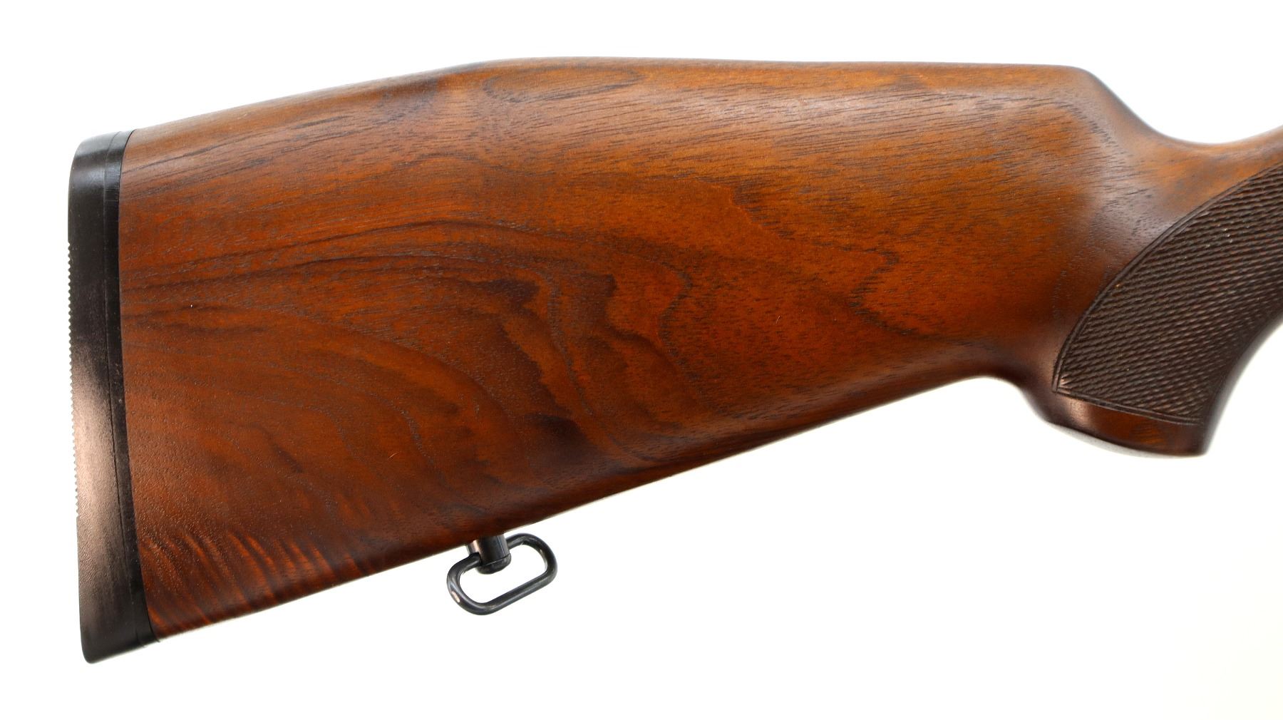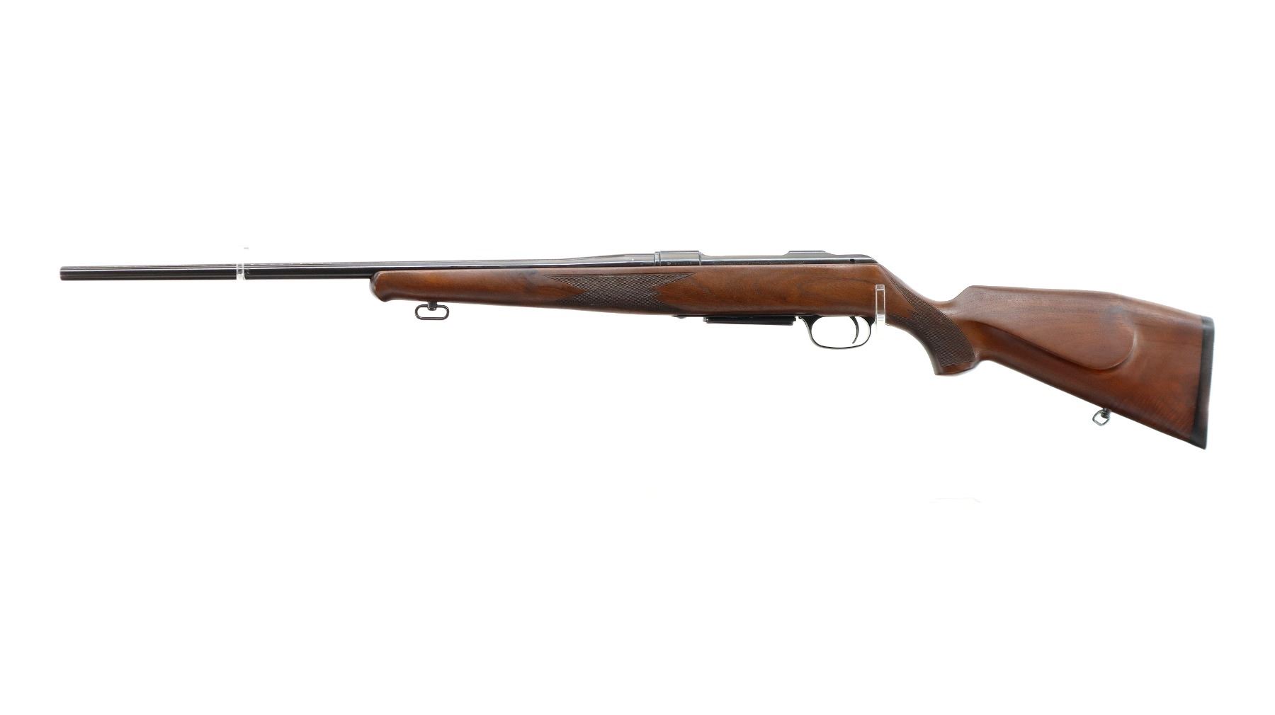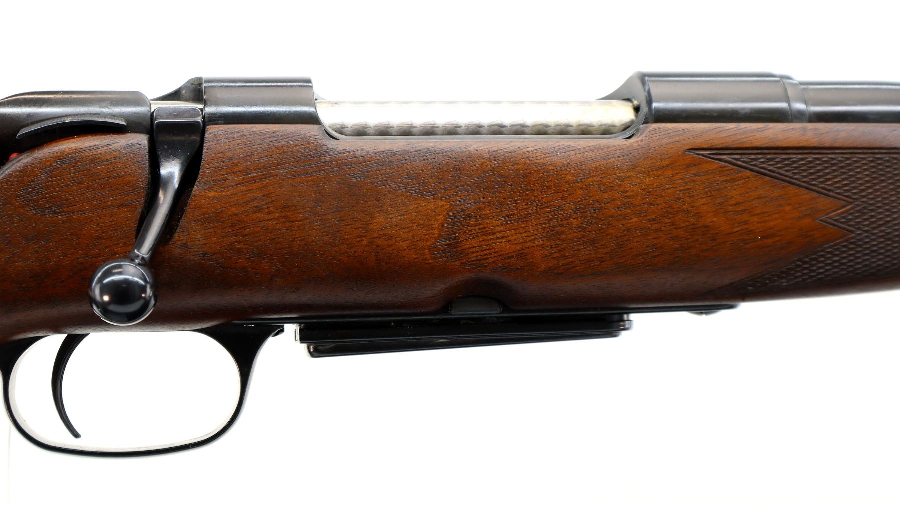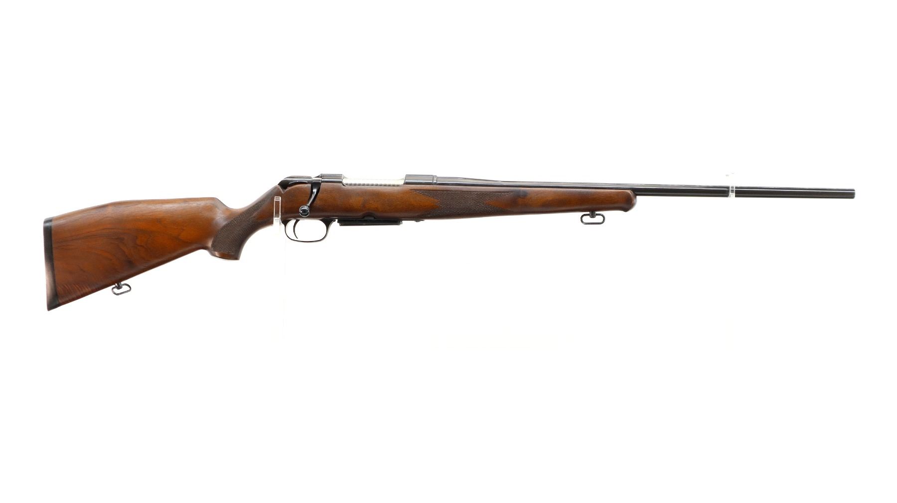 Main Description: No sights, Polish blued finish, tapered round barrel, receiver drilled and tapped with plug screws installed, Jewelled bolt with smooth knob. One piece Satin finish wood stock, Schnabel forend tip, checkered forearm with right hand palm swell, cheek rest, black rubber recoil pad, sling swivels.