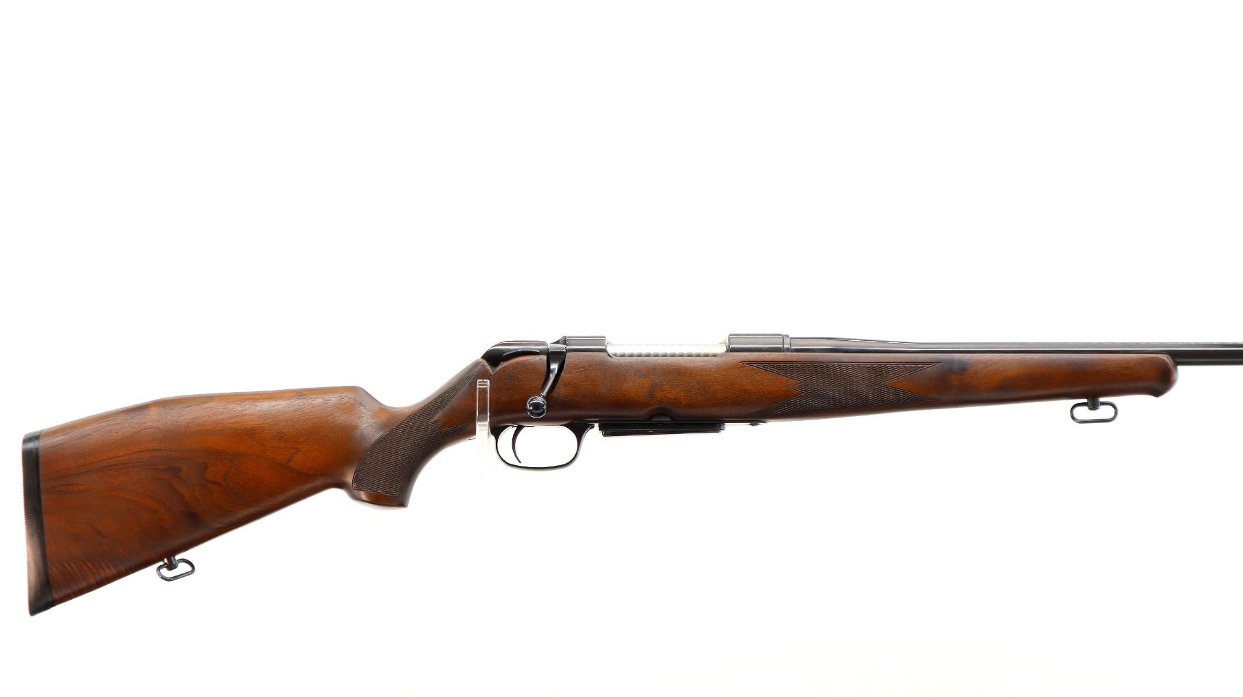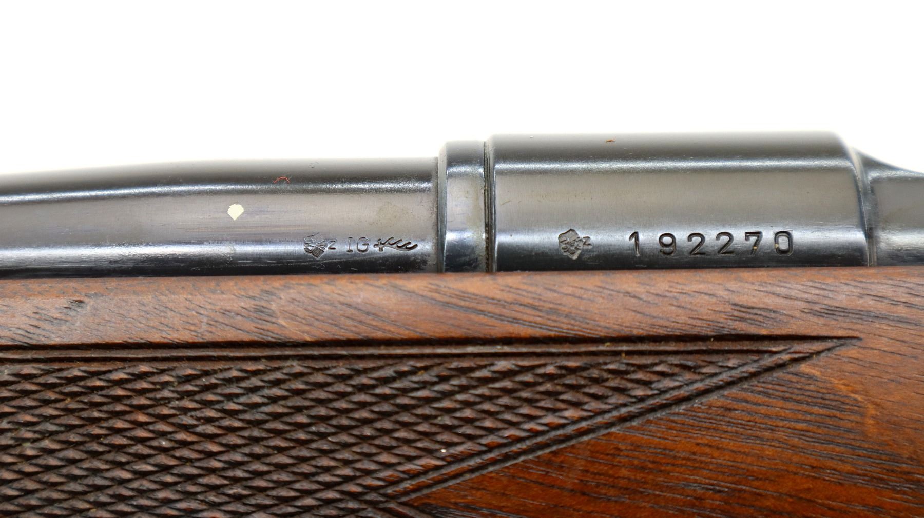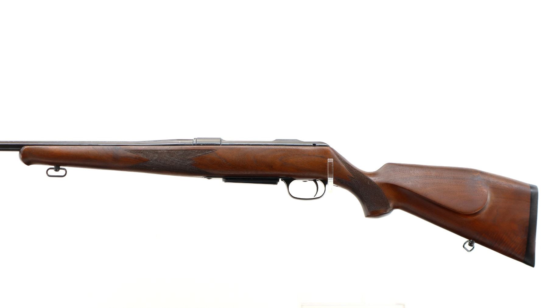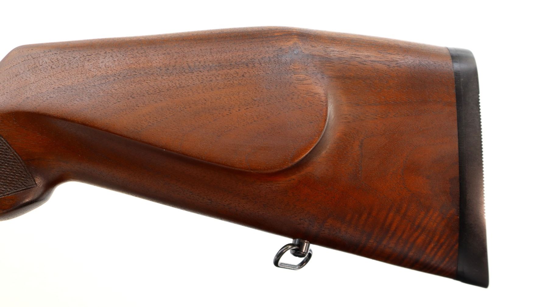 Main Description: No sights, Polish blued finish, tapered round barrel, receiver drilled and tapped with plug screws installed, Jewelled bolt with smooth knob. One piece Satin finish wood stock, Schnabel forend tip, checkered forearm with right hand palm swell, cheek rest, black rubber recoil pad, sling swivels.