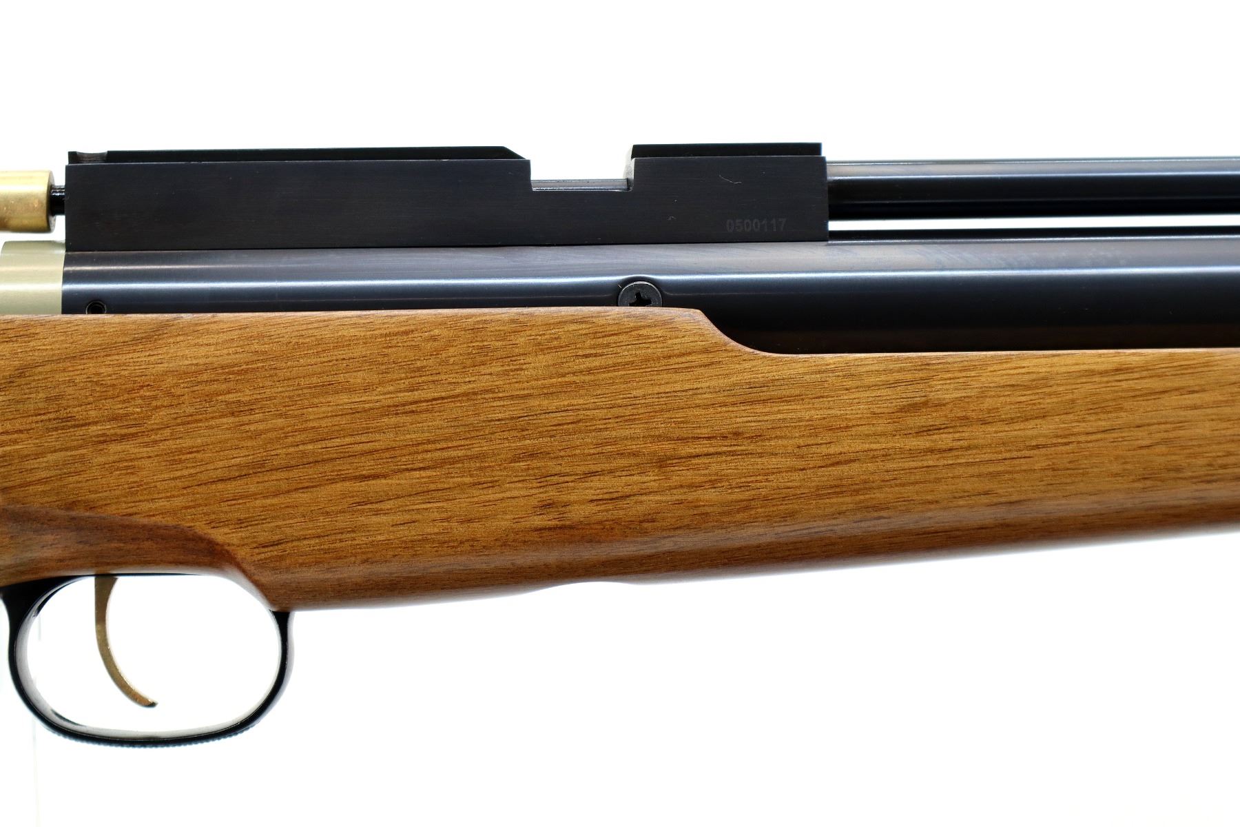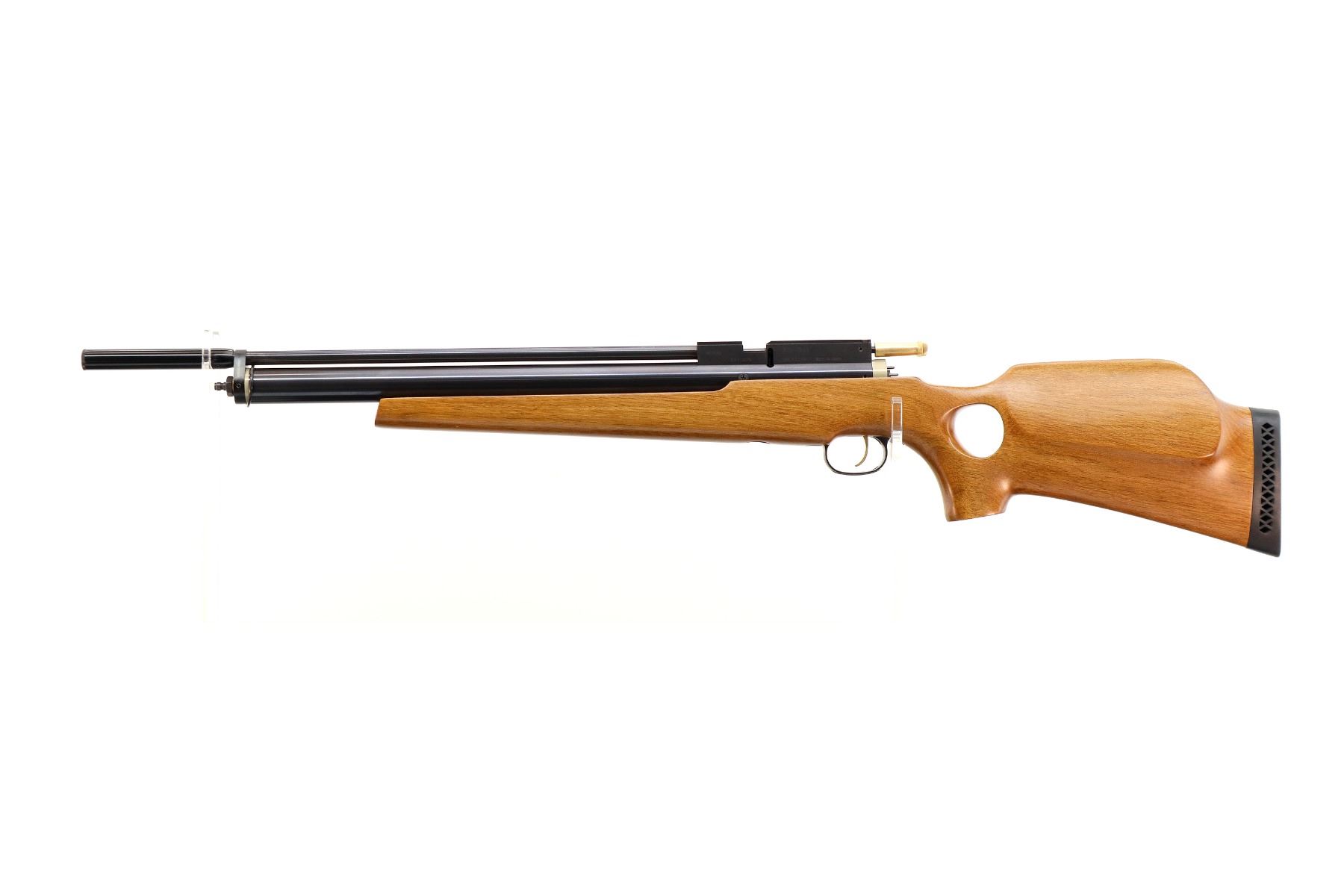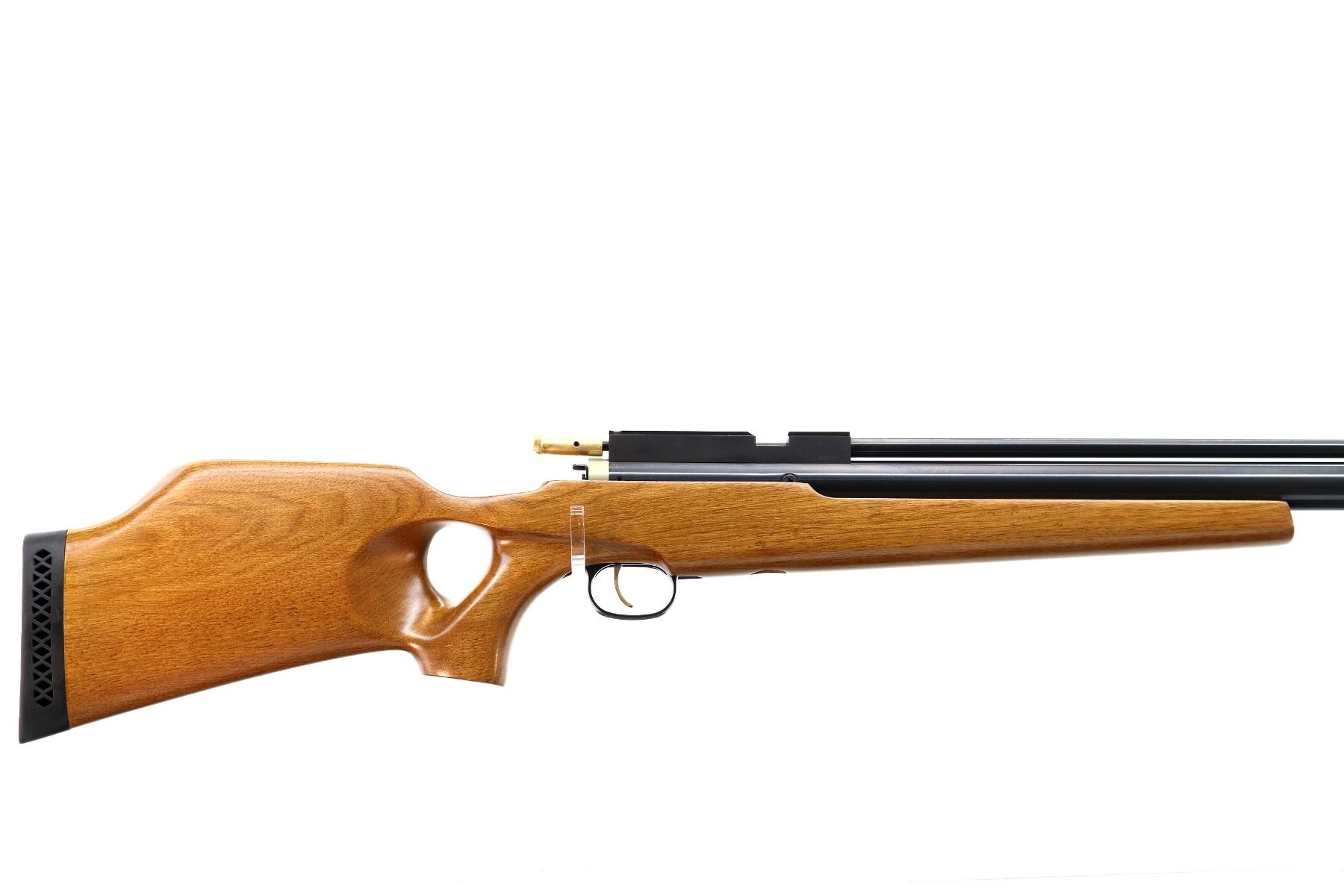 Main Description: No sights, blued finish, alloy shroud at muzzle, grooved receiver, brass cocking handle. One piece wood stock, thumb hole pistol grip, cheek rest, black vented rubber recoil pad.