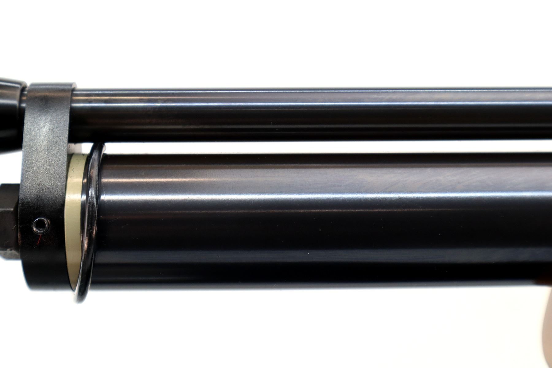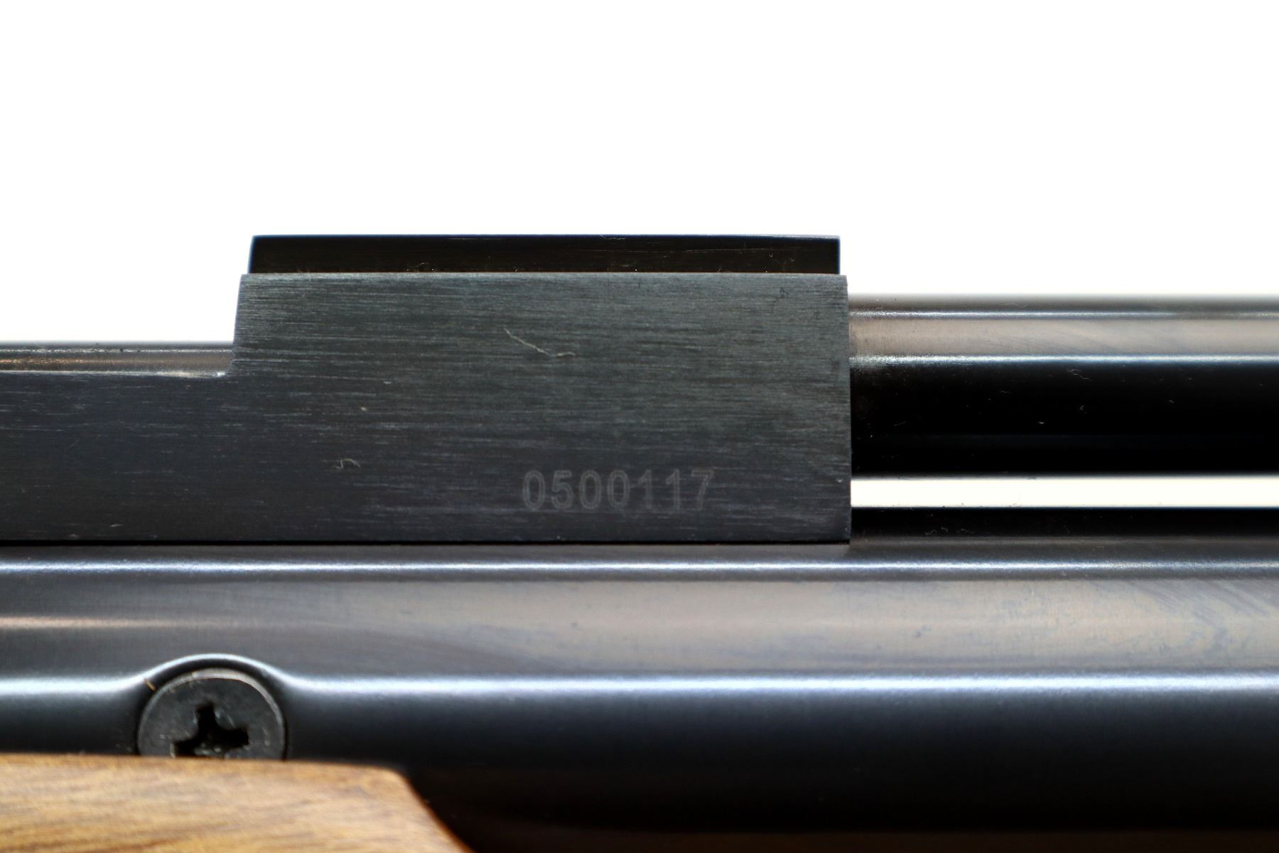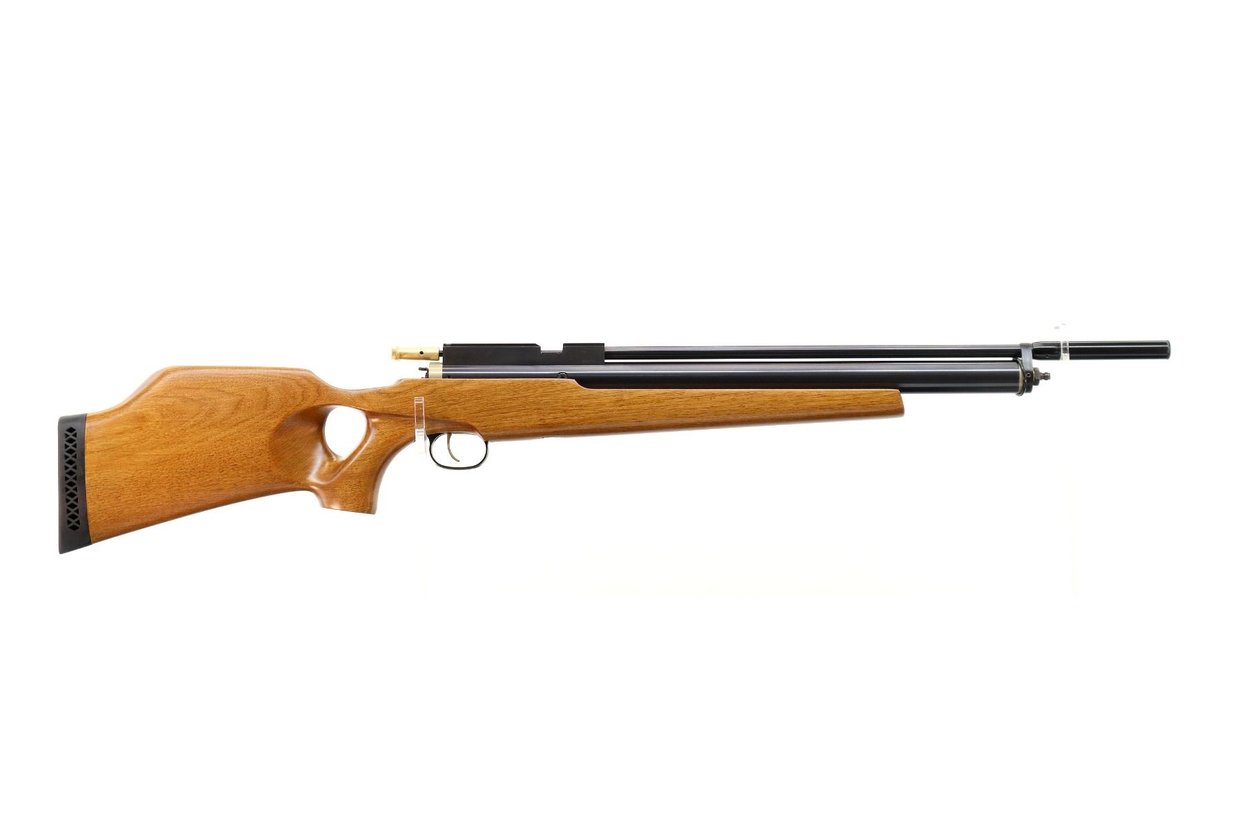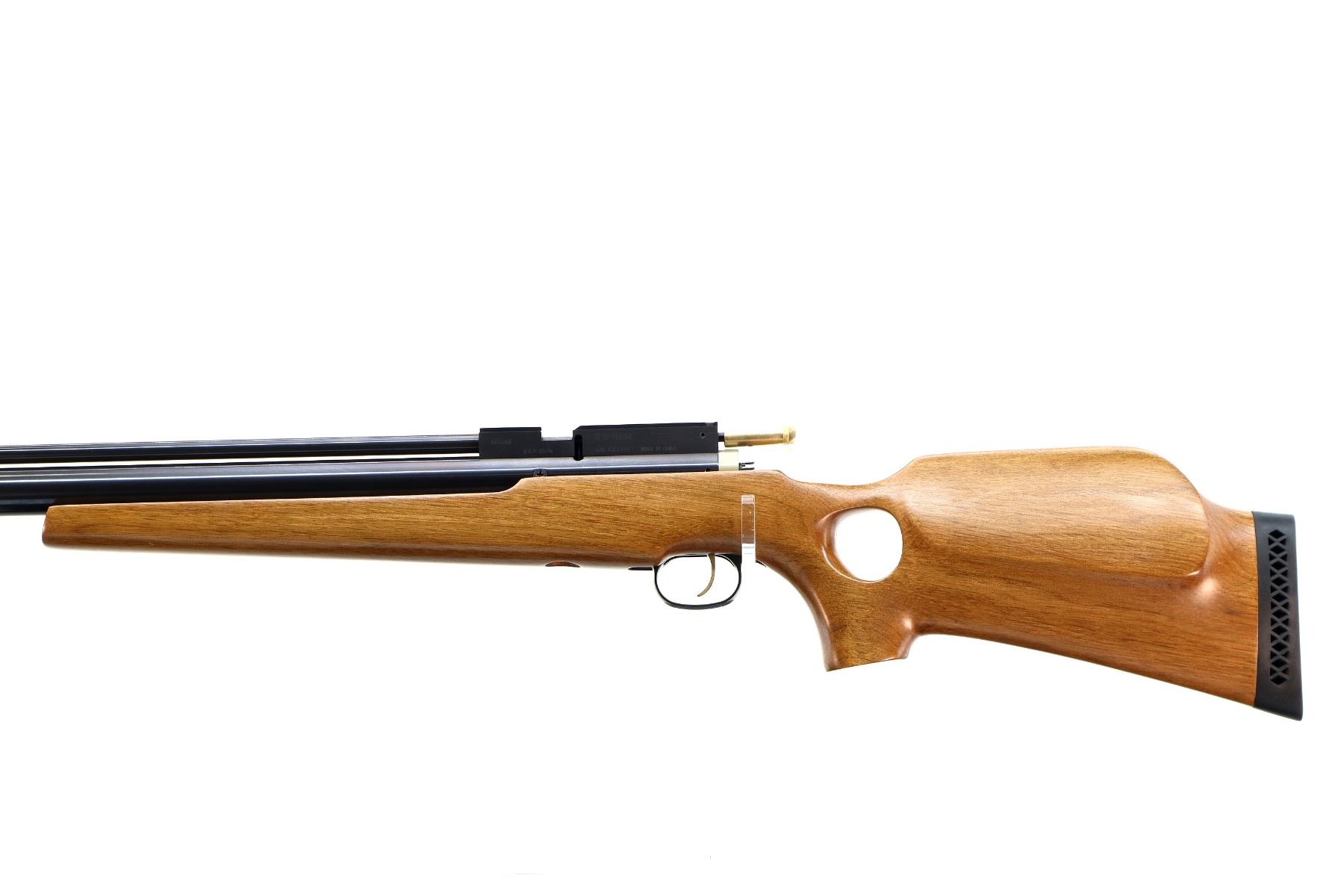 Main Description: No sights, blued finish, alloy shroud at muzzle, grooved receiver, brass cocking handle. One piece wood stock, thumb hole pistol grip, cheek rest, black vented rubber recoil pad.