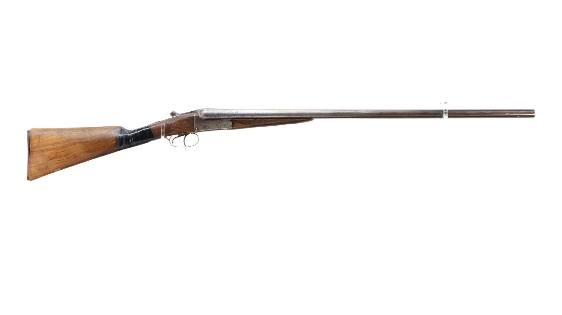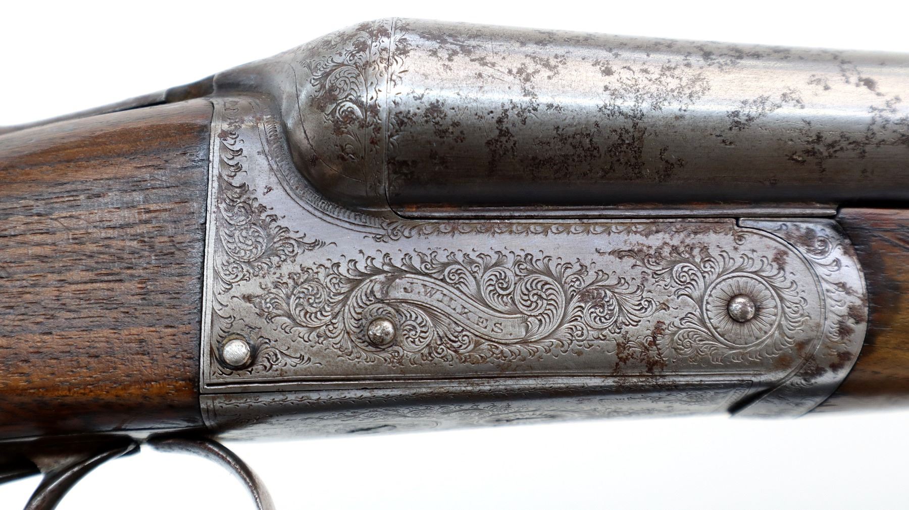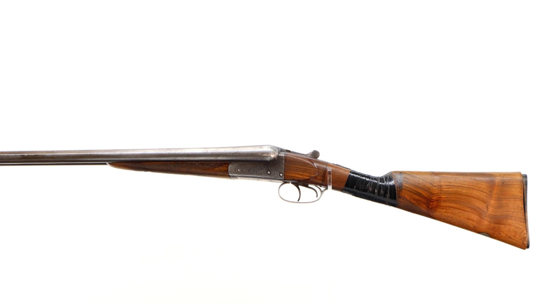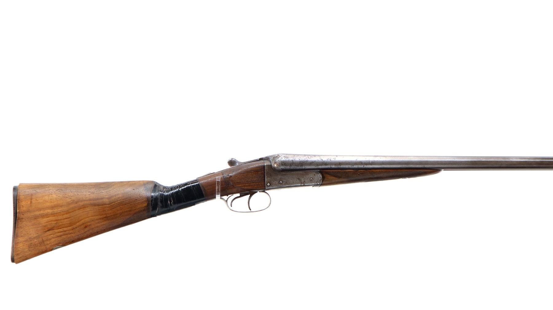 Main Description: Brass bead, round Nitro proof barrels with smooth rib marked J. Wilkes 1 Lower James St, Golden Square London that chime and are slightly loose on face. Nicely engraved receiver and trigger guard, automatic safety, extractor, double triggers. Two piece wood stocks, checkered forearm with engraved latch, straight grip, chipped cracked and broken, repaired with wood and wrapped with black tape. Checkered black polymer Remington butt plate which does not fit well, 14" LOP, vanity plate.