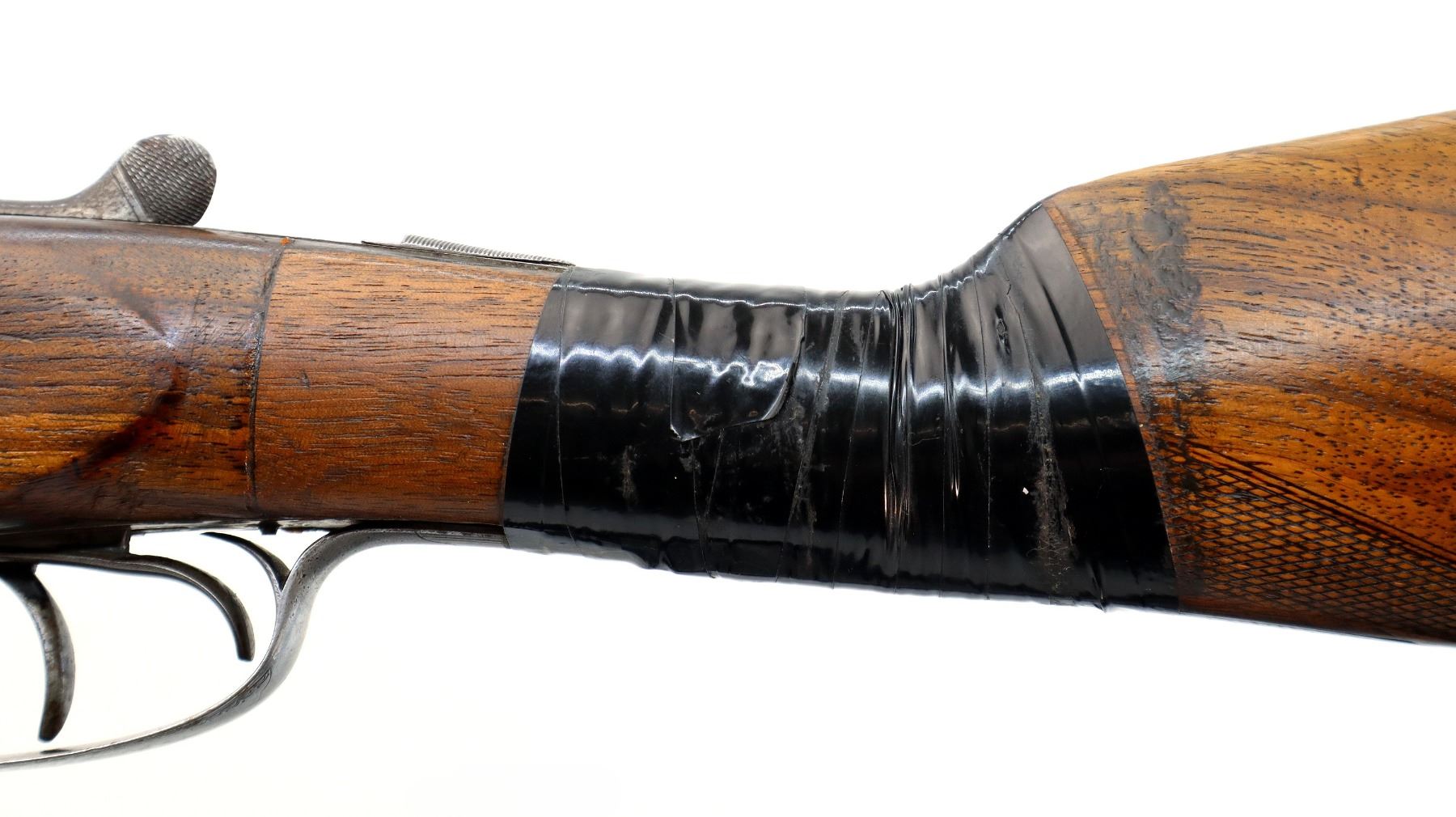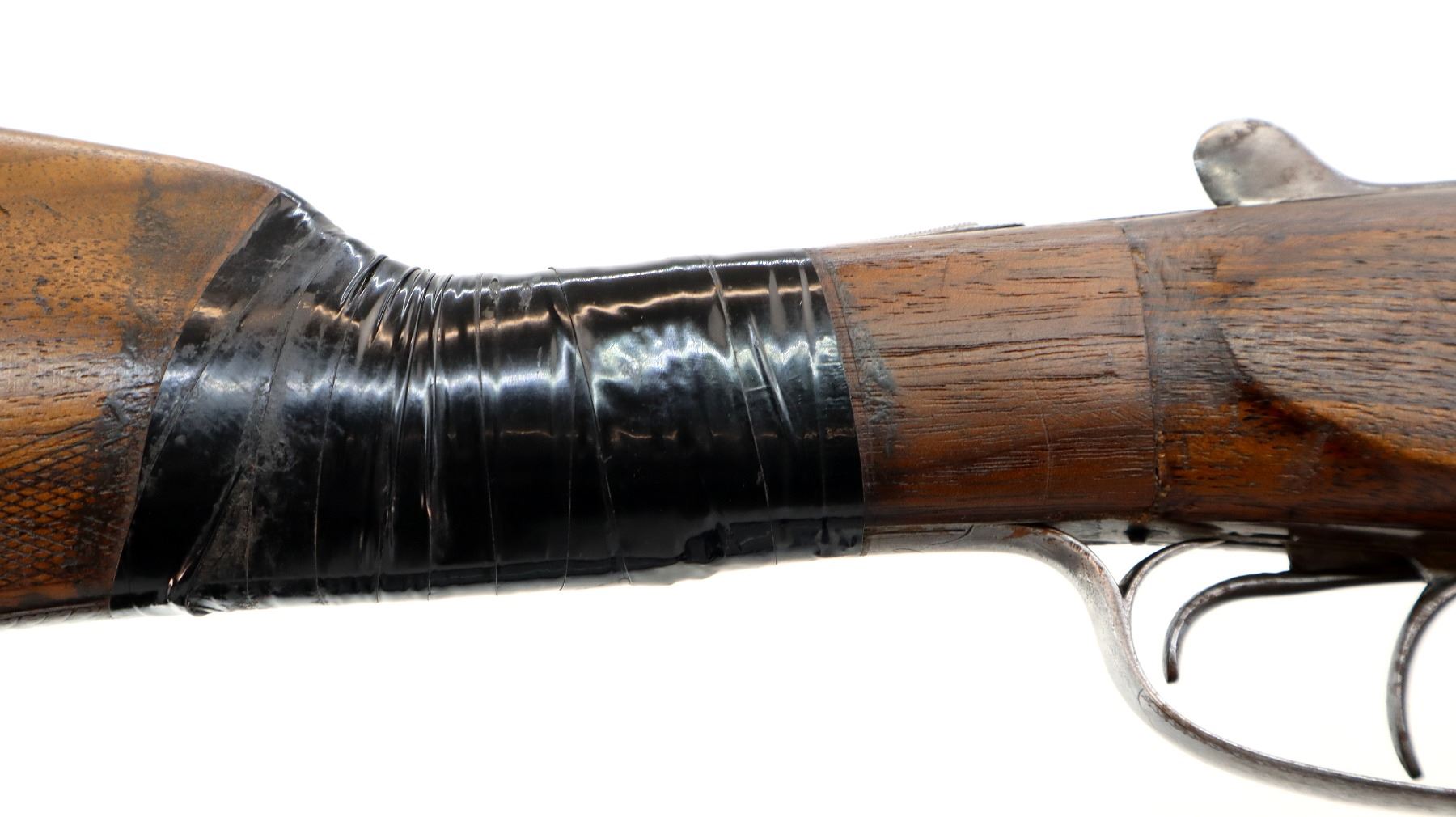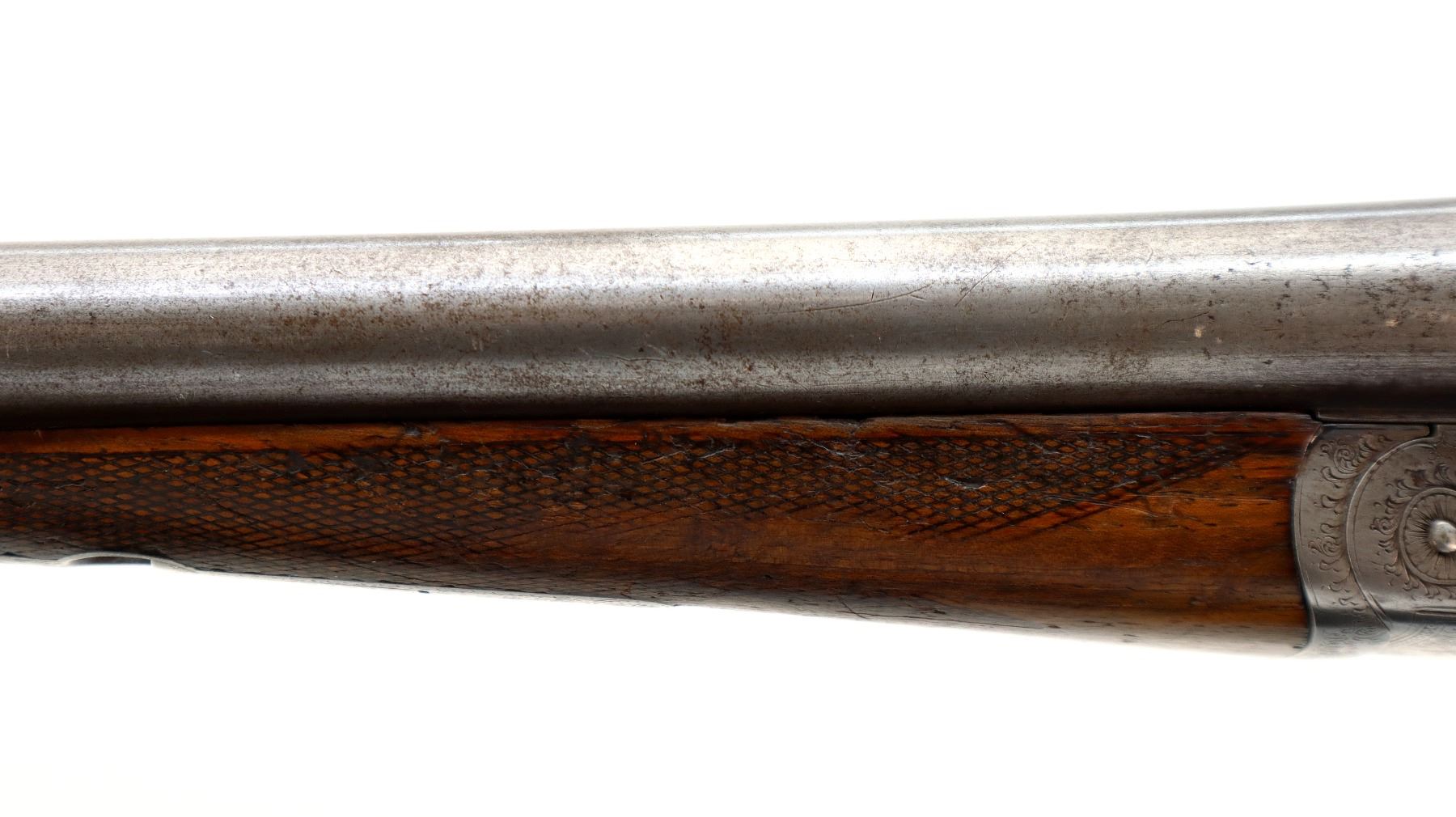 Main Description: Brass bead, round Nitro proof barrels with smooth rib marked J. Wilkes 1 Lower James St, Golden Square London that chime and are slightly loose on face. Nicely engraved receiver and trigger guard, automatic safety, extractor, double triggers. Two piece wood stocks, checkered forearm with engraved latch, straight grip, chipped cracked and broken, repaired with wood and wrapped with black tape. Checkered black polymer Remington butt plate which does not fit well, 14" LOP, vanity plate.