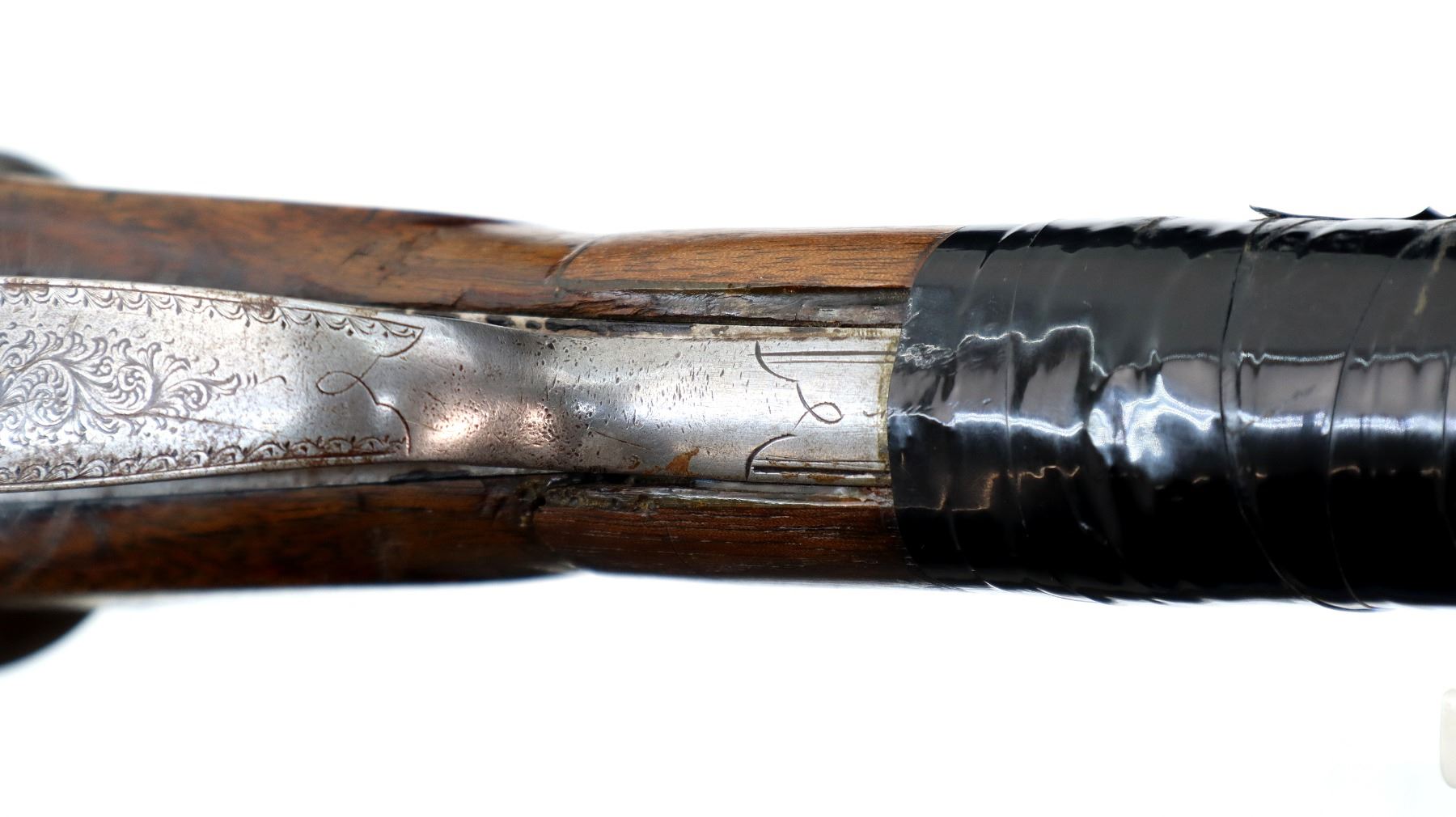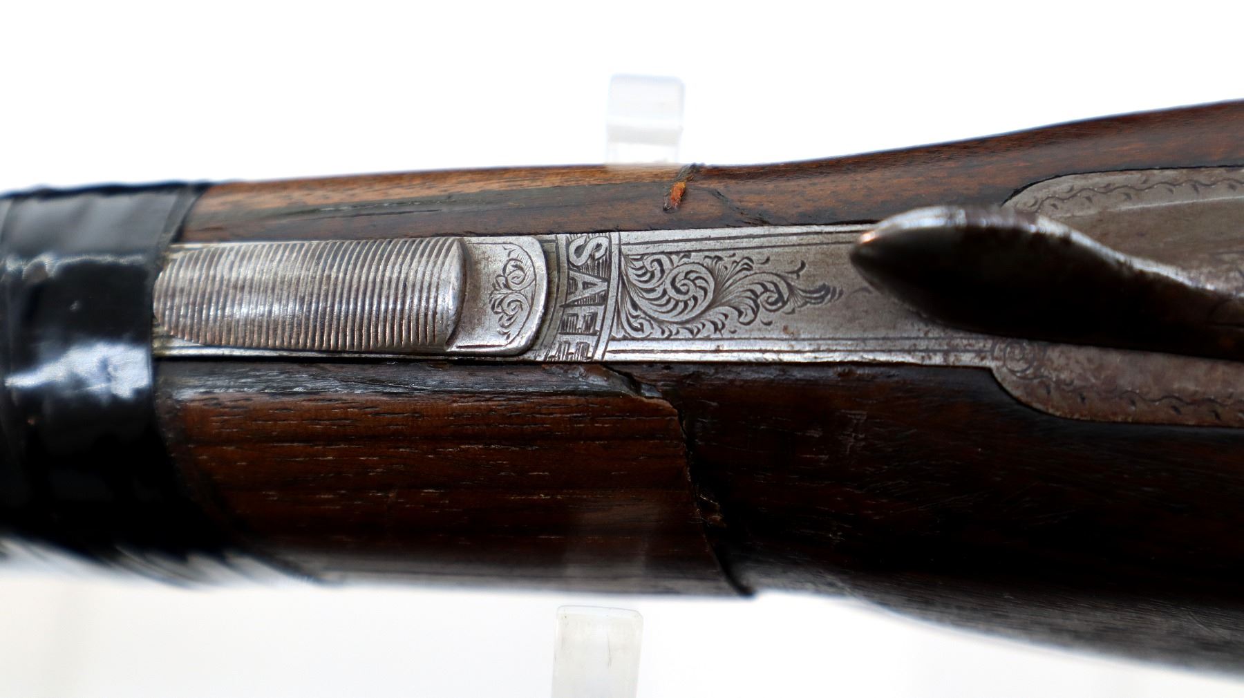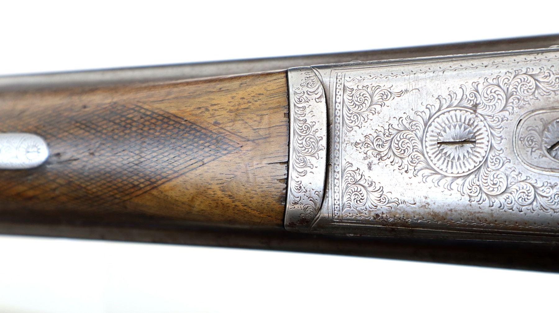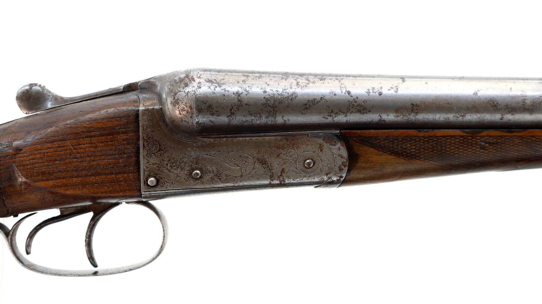 Main Description: Brass bead, round Nitro proof barrels with smooth rib marked J. Wilkes 1 Lower James St, Golden Square London that chime and are slightly loose on face. Nicely engraved receiver and trigger guard, automatic safety, extractor, double triggers. Two piece wood stocks, checkered forearm with engraved latch, straight grip, chipped cracked and broken, repaired with wood and wrapped with black tape. Checkered black polymer Remington butt plate which does not fit well, 14" LOP, vanity plate.