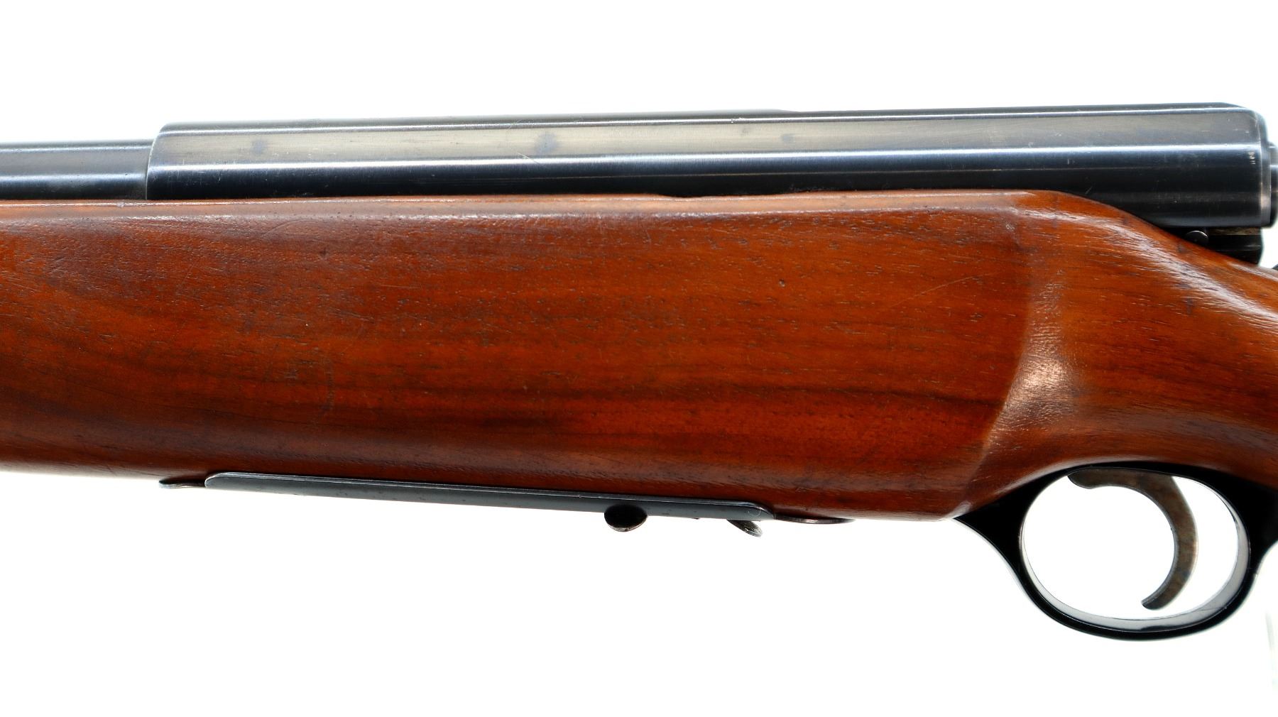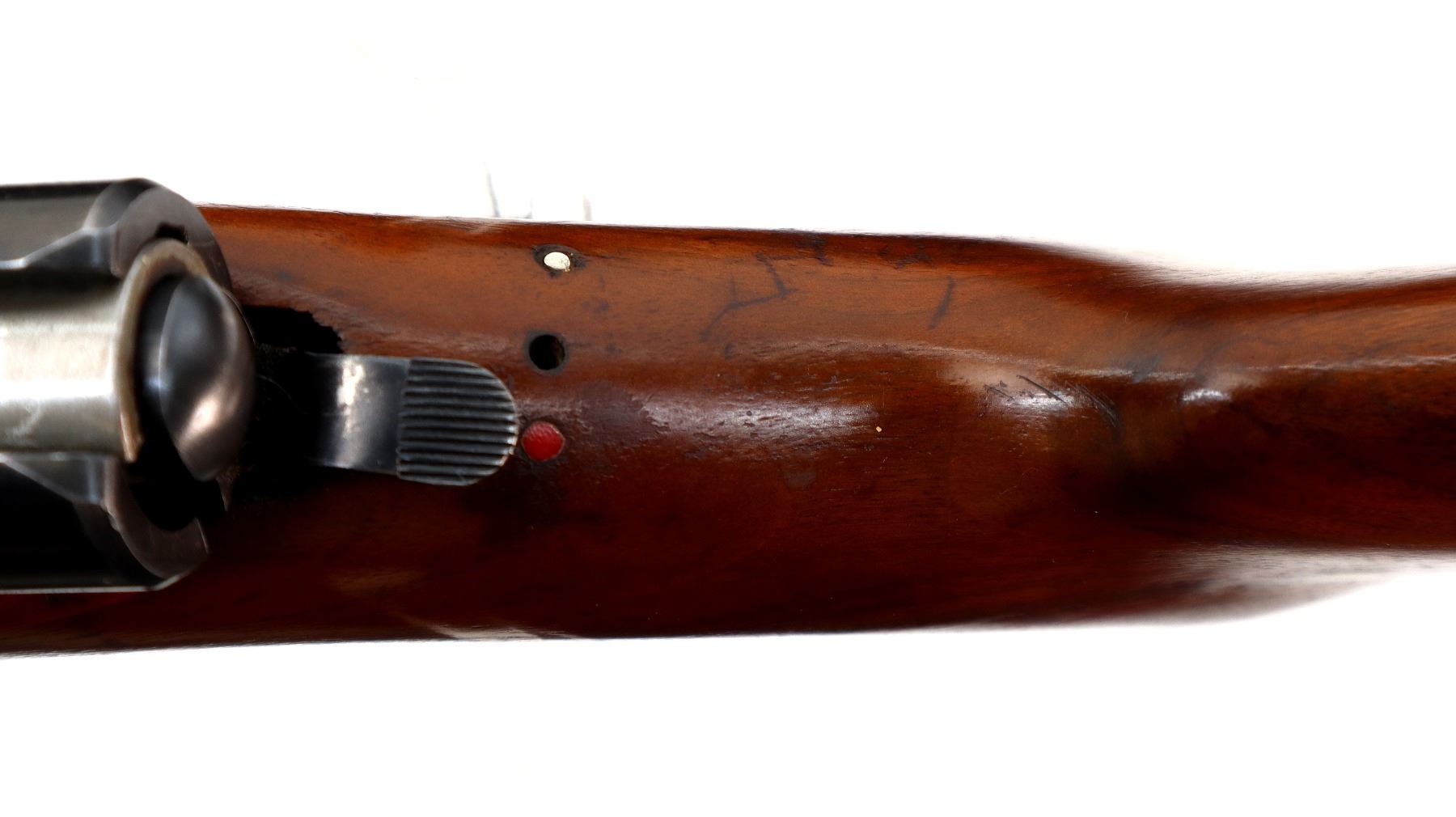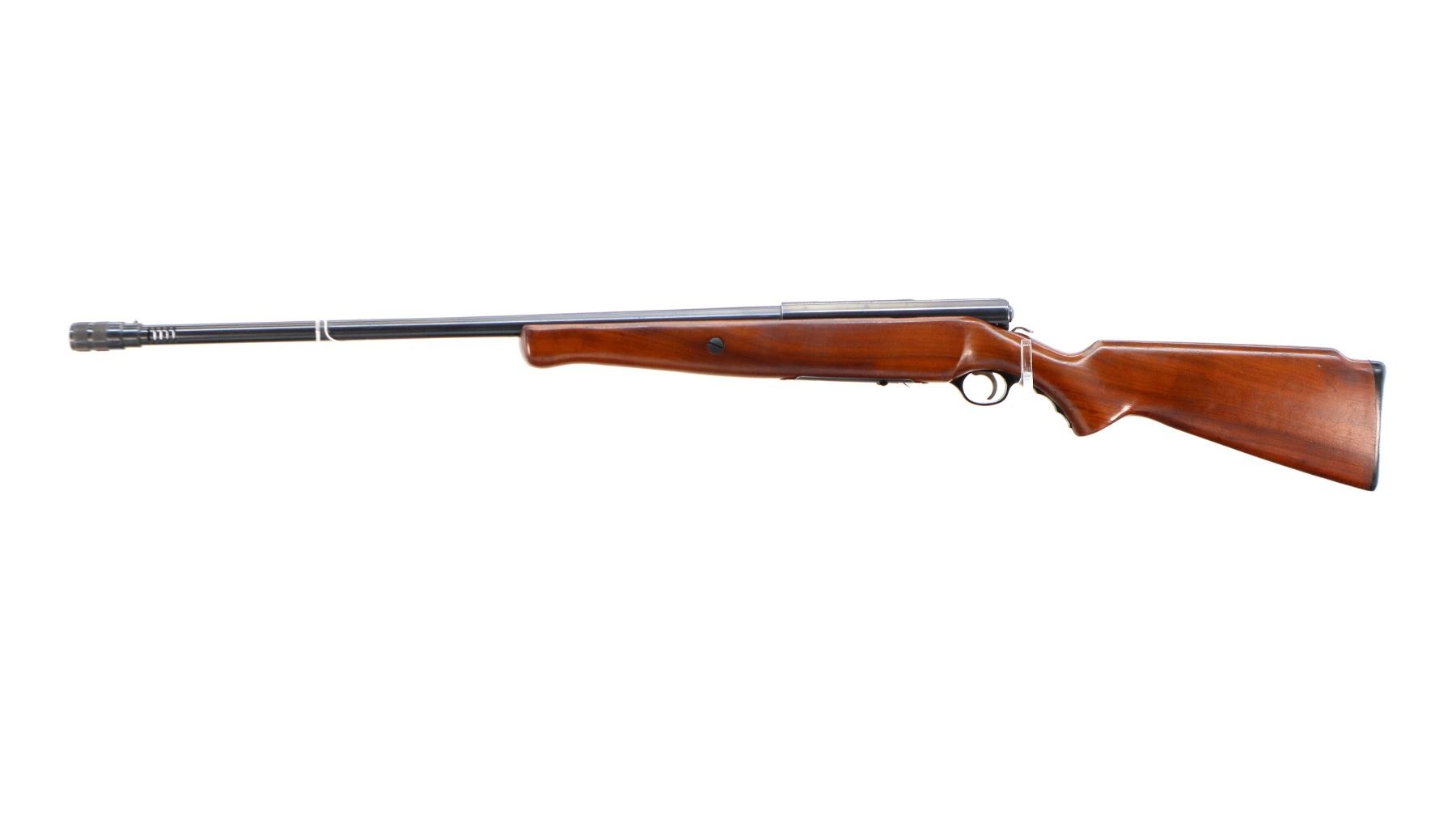 Main Description: Silver bead, blued finish, ported round barrel, grooved bolt knob, missing green safety button. One piece wood stock, pistol grip, grooved black polymer butt plate