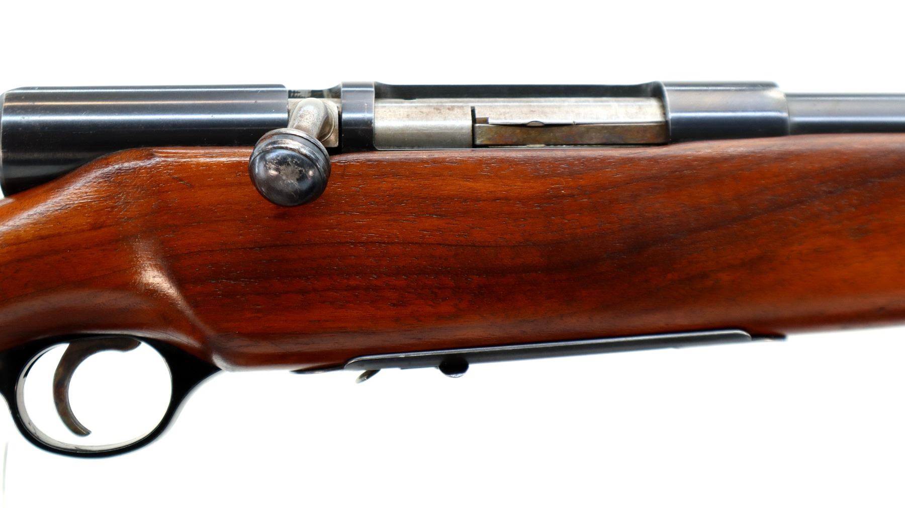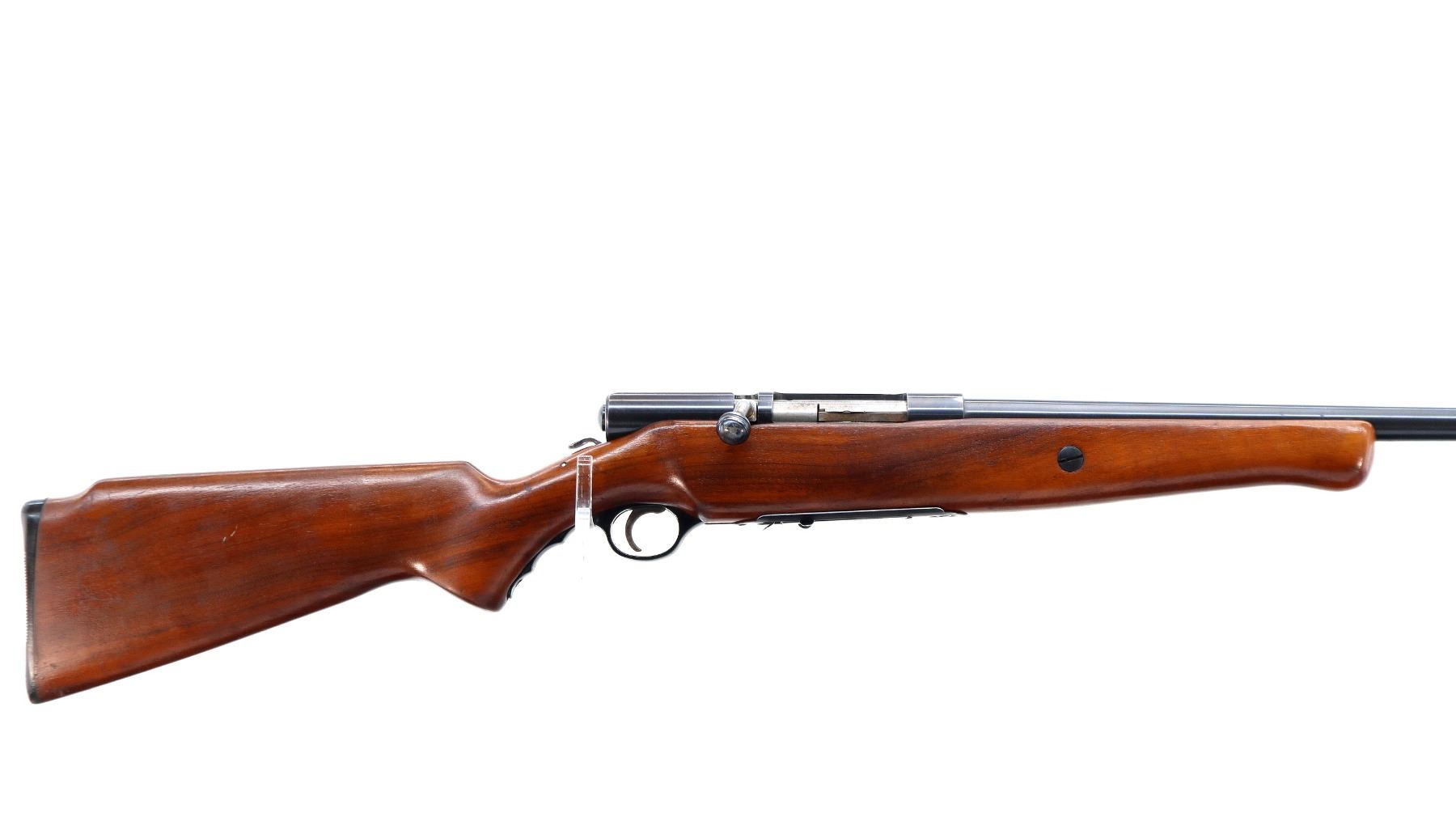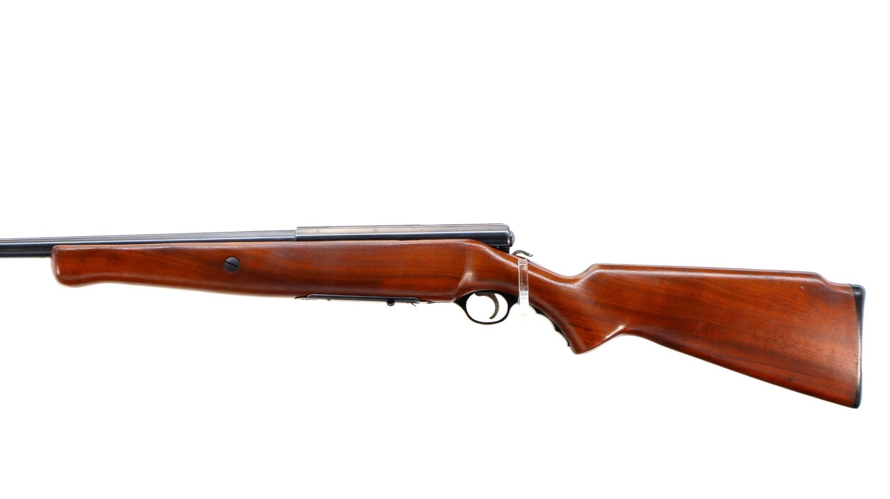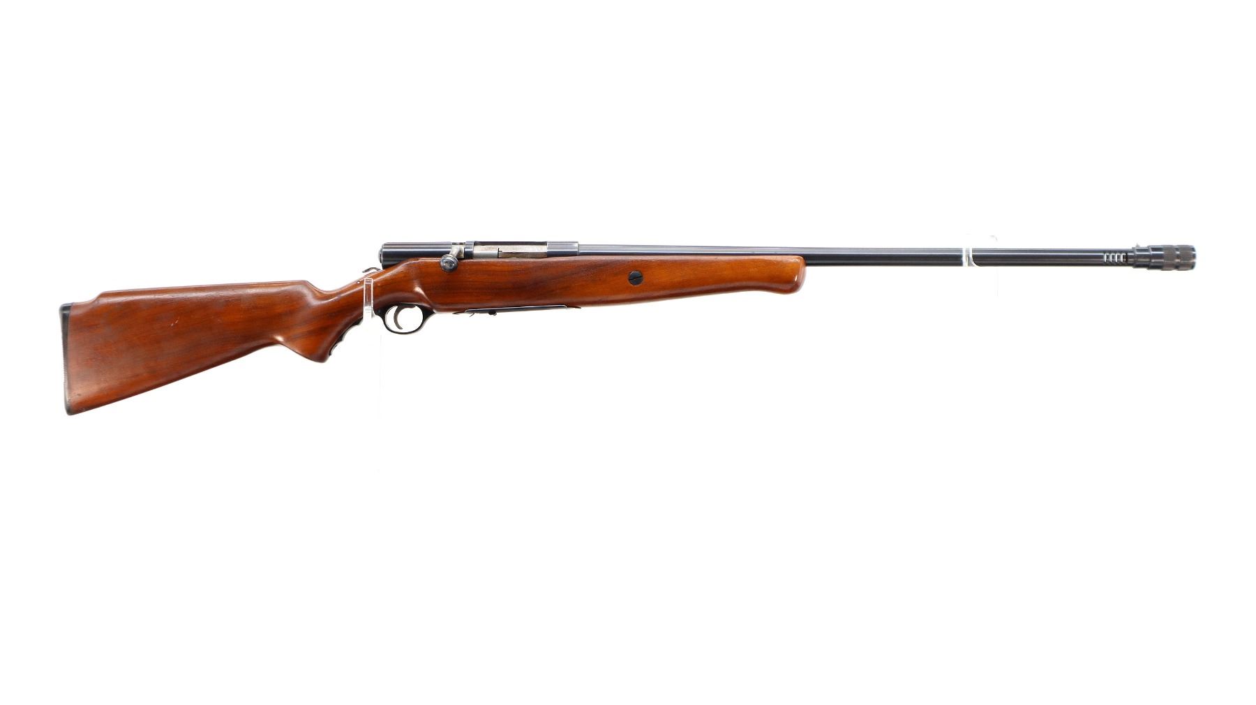 Main Description: Silver bead, blued finish, ported round barrel, grooved bolt knob, missing green safety button. One piece wood stock, pistol grip, grooved black polymer butt plate