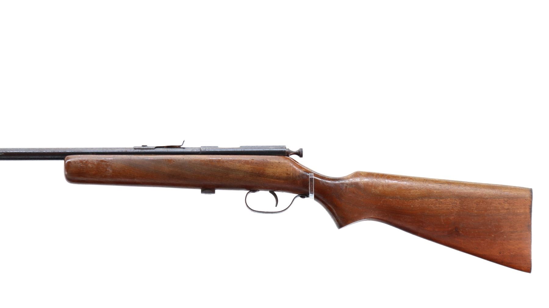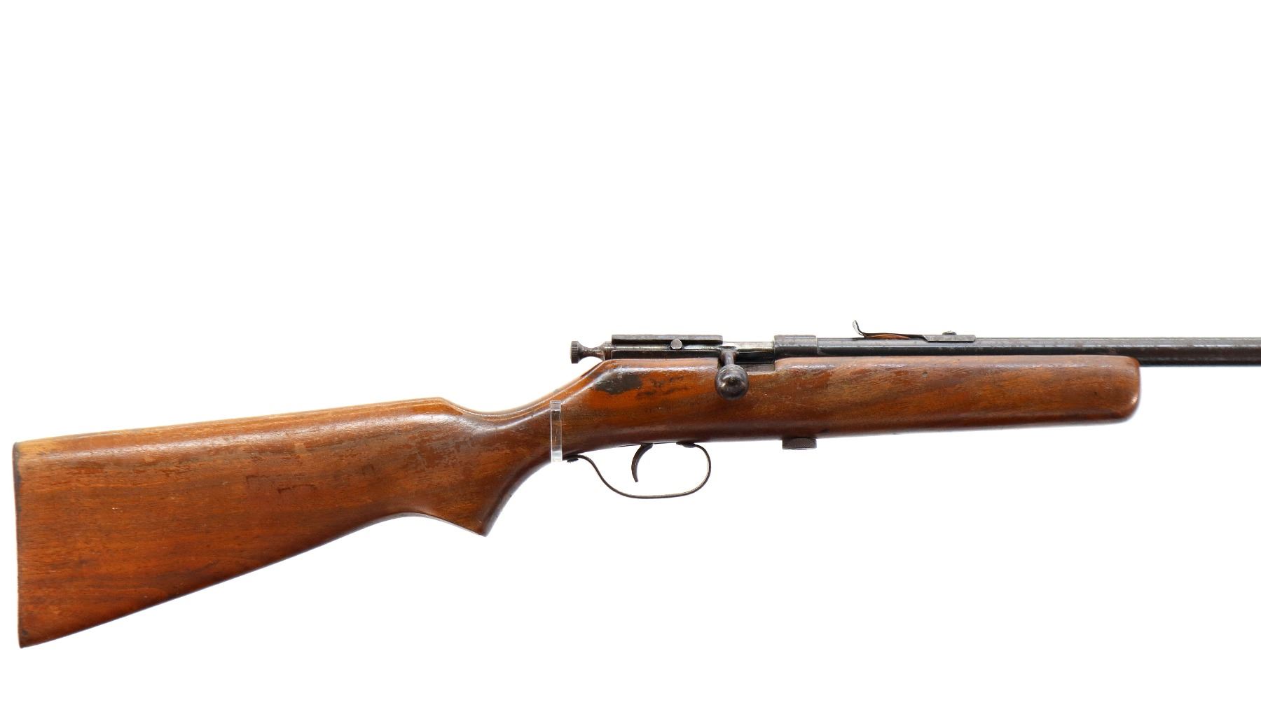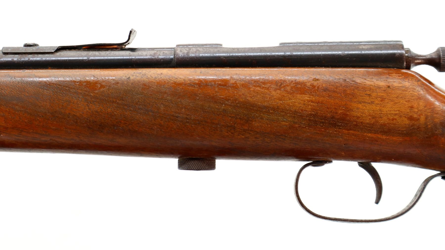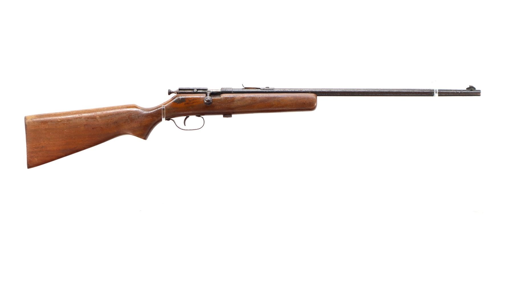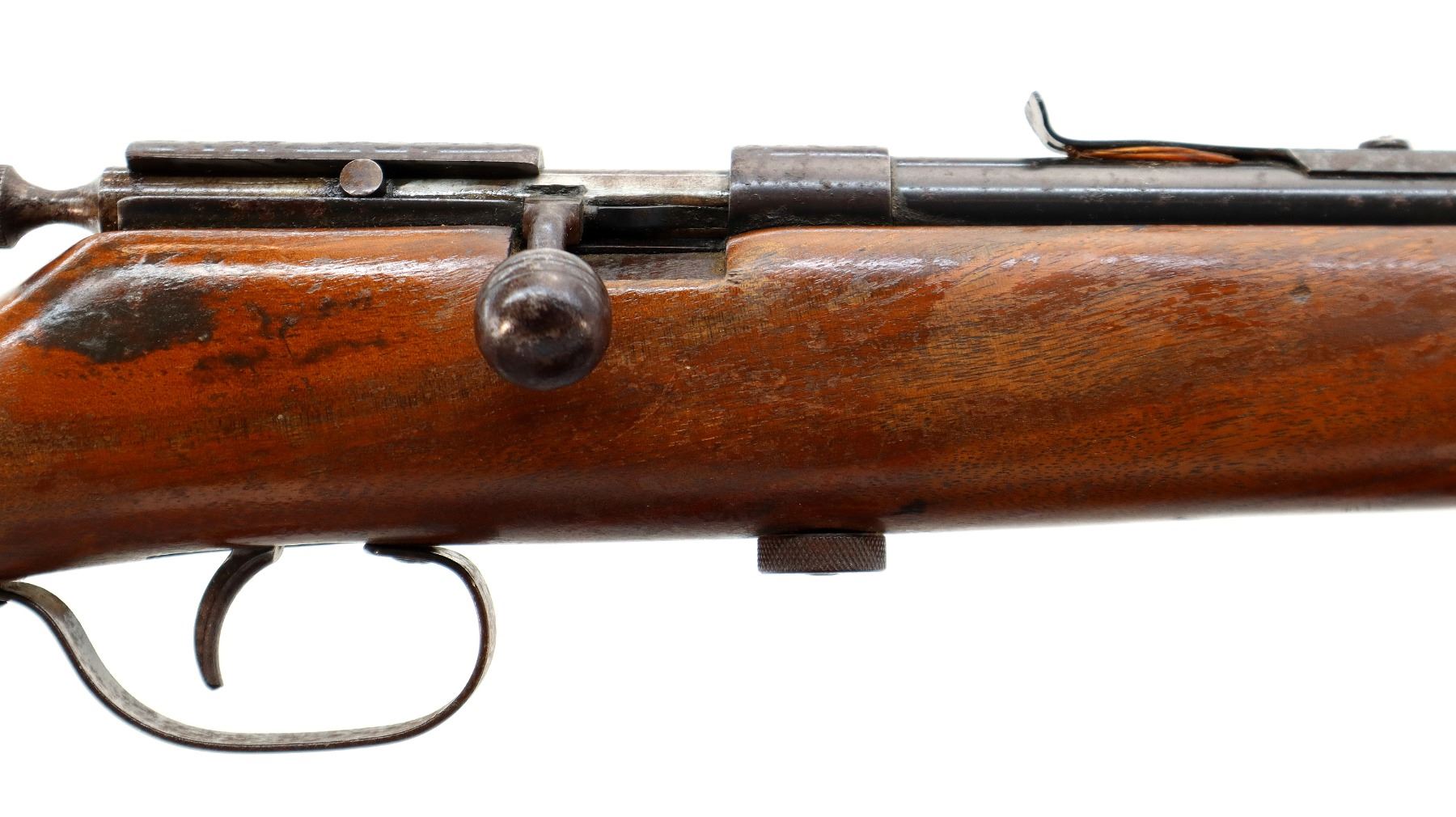 Main Description: Blade front sight, u notched rear sight missing elevator, grooved bolt knob, extractor is present. One piece wood stock, pistol grip, smooth steel butt plate.