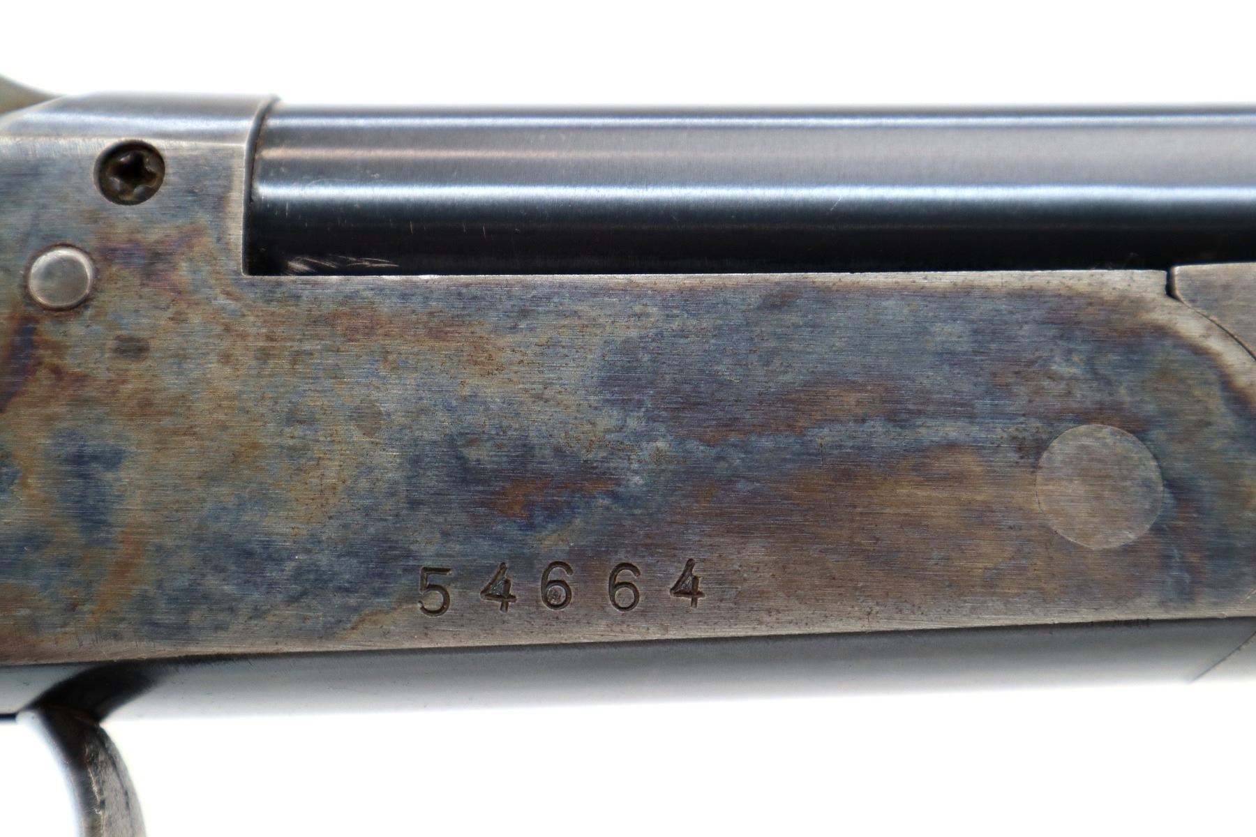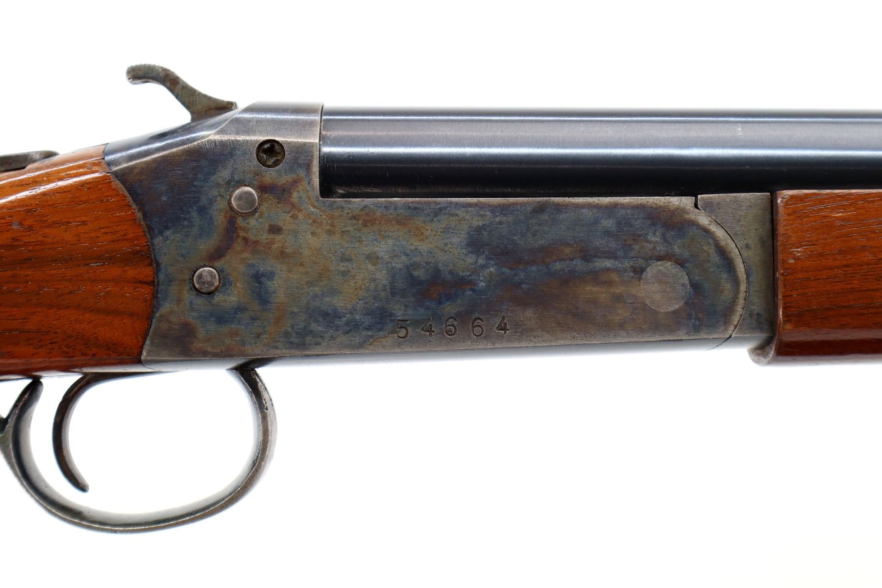 Main Description: Brass bead, blued round barrel, colour case hardened receiver, grooved spur hammer, ejector. Two piece wood stocks, pistol grip, grooved black polymer butt plate.